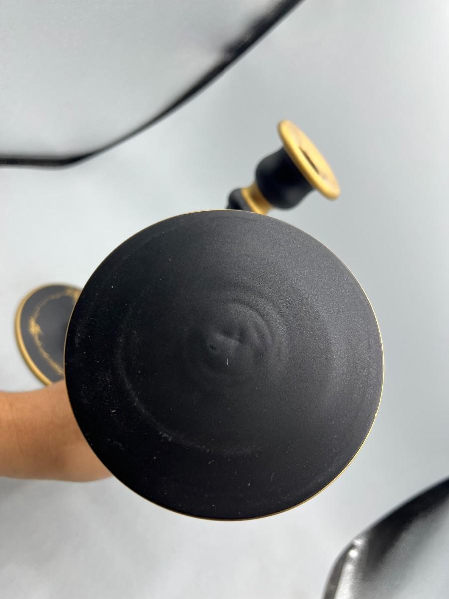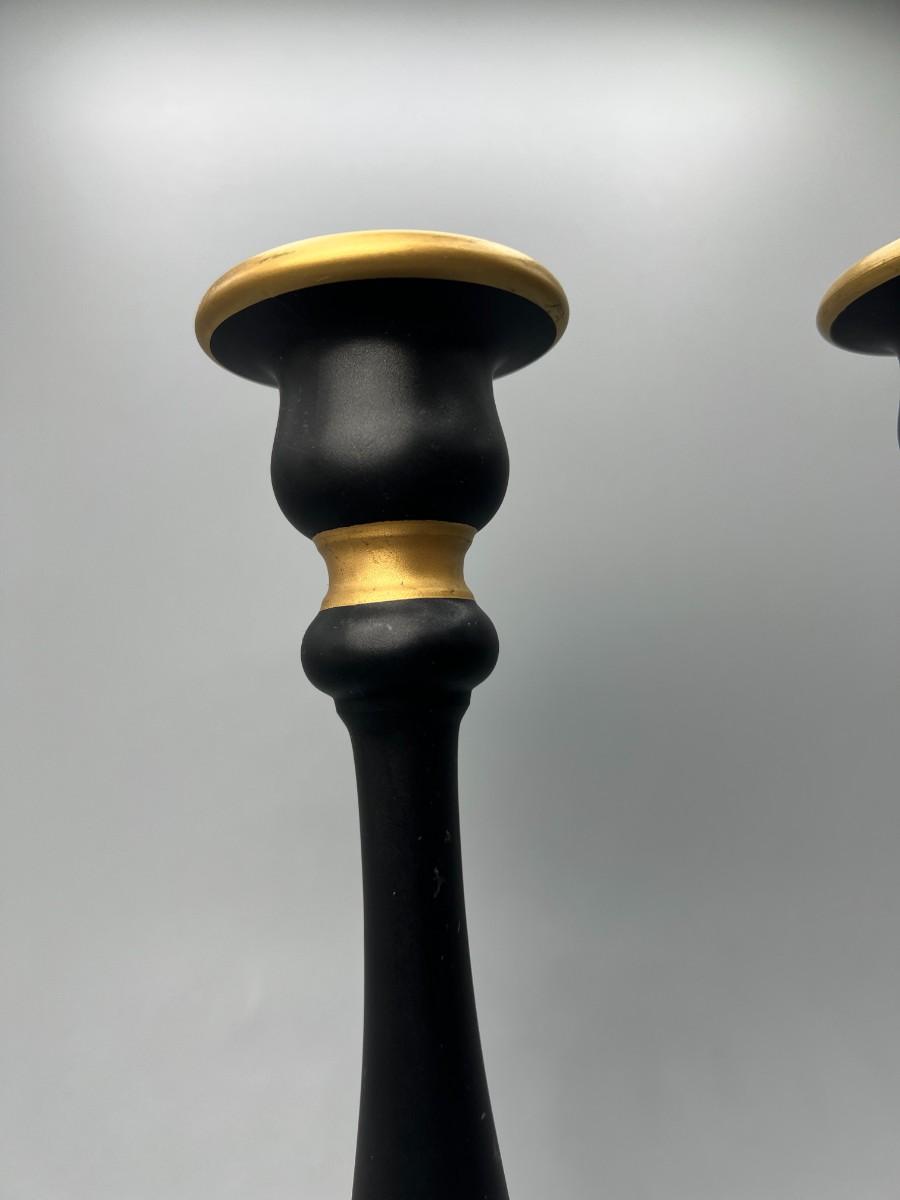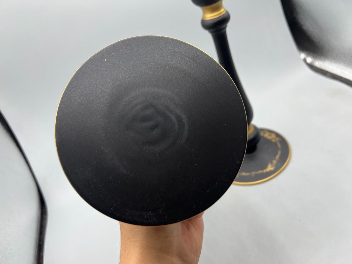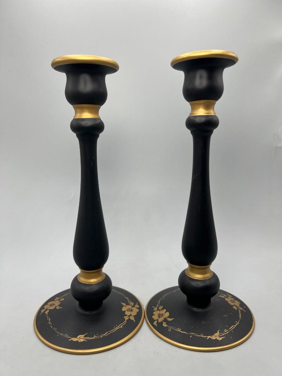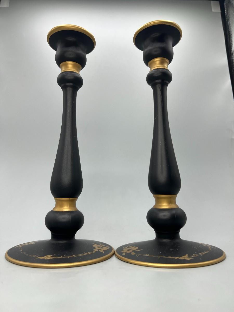 Vintage Pair of Black Satin Gold Motif Rose Flower Motif Gothic Candlesticks
