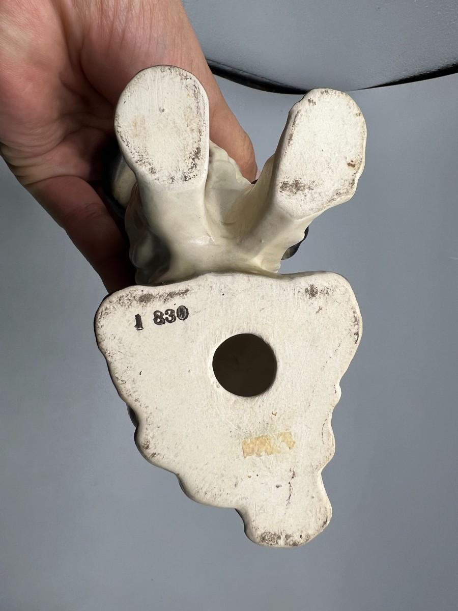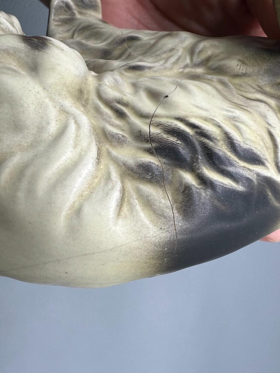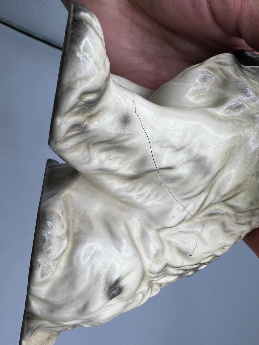 Looks like it has been glued or repaired. There is a crack running along the width and the back of the figurine, but it is still in good displayable condition.