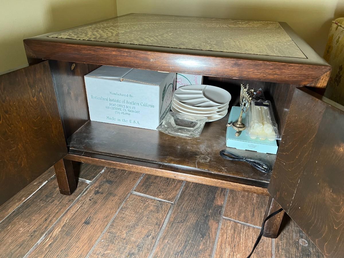 Everything inside the end table is NOT included. There are some light scratches and some wear, but there is no significant damage and in good displayable condition.