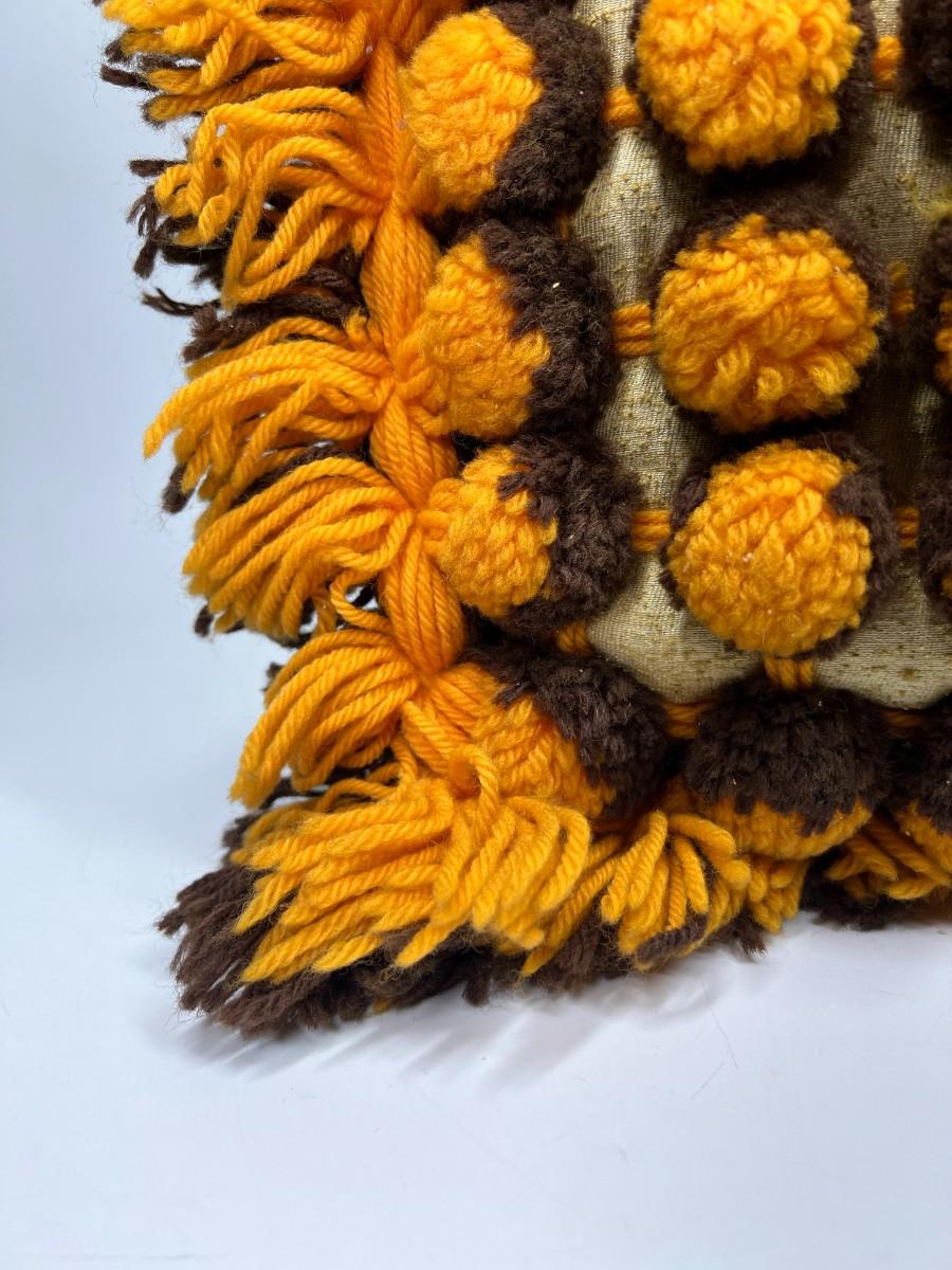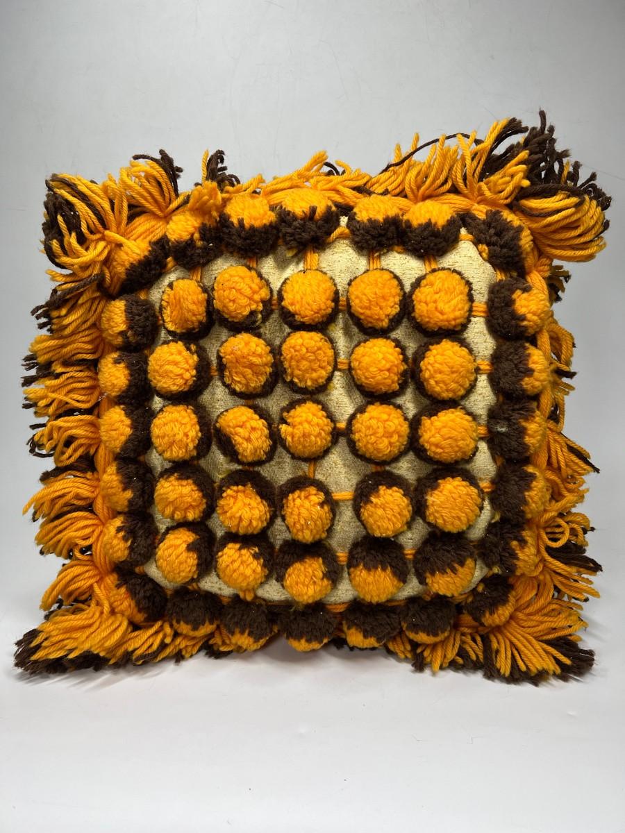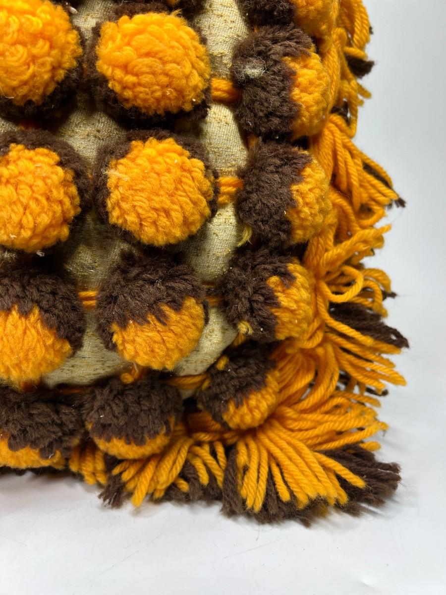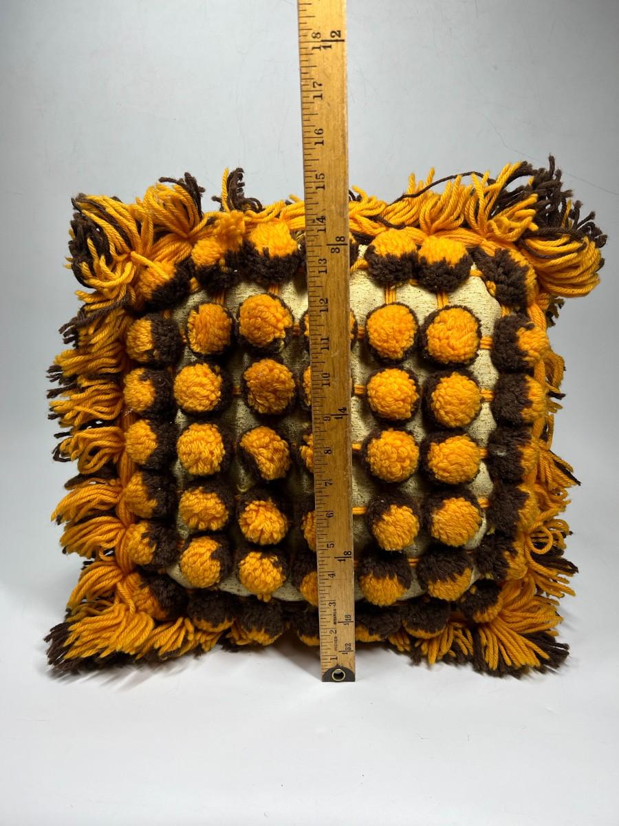 Vintage Retro Orange and Brown Yarn Puff Ball Pom Pom Throw Accent Pillow. In vintage condition.