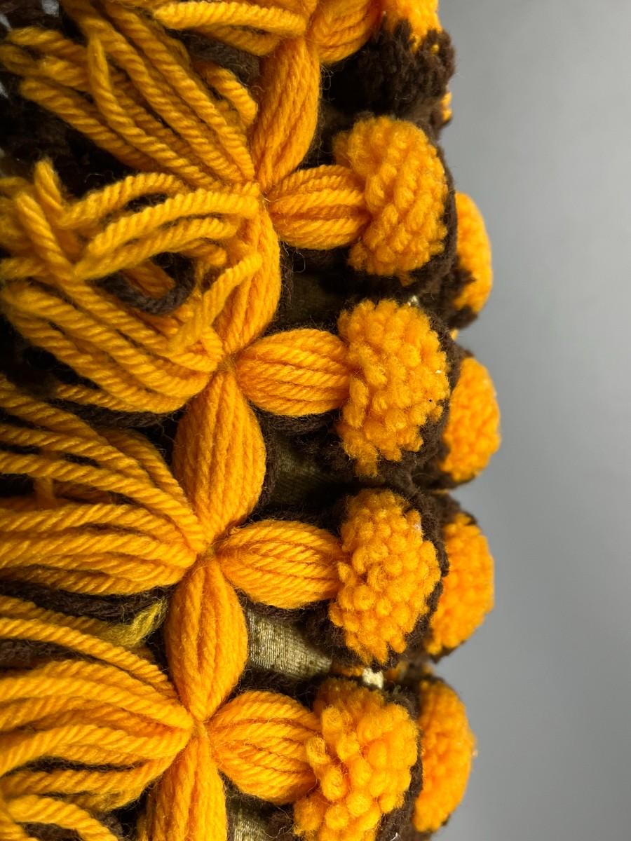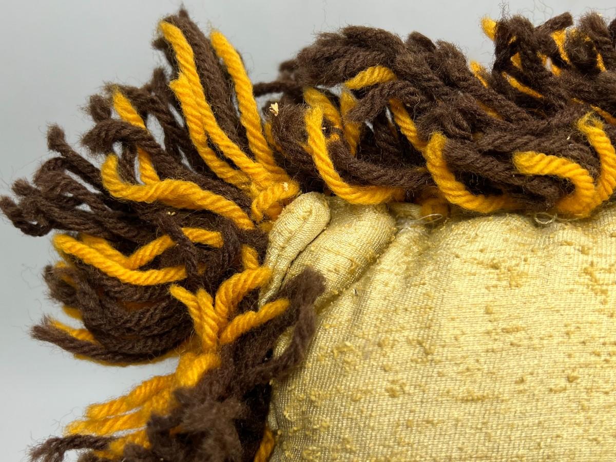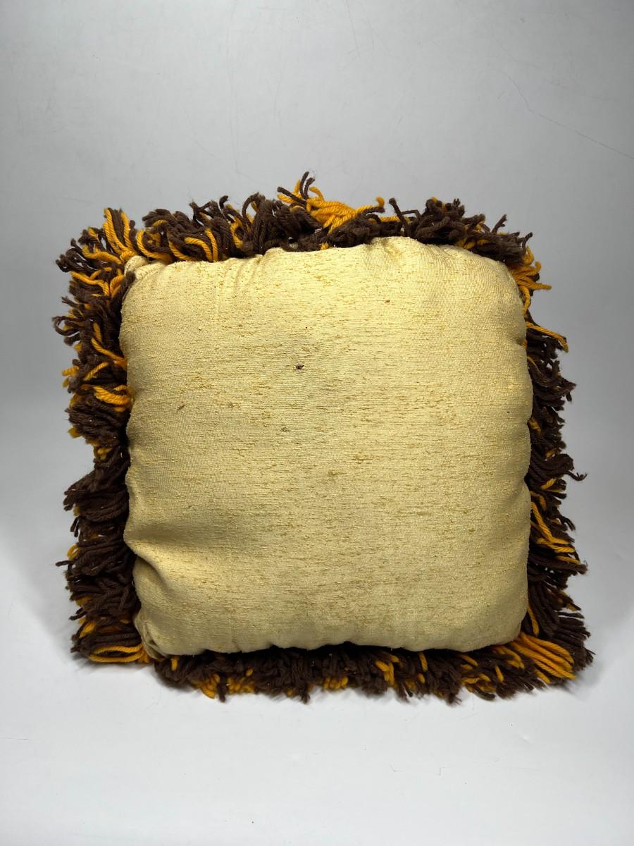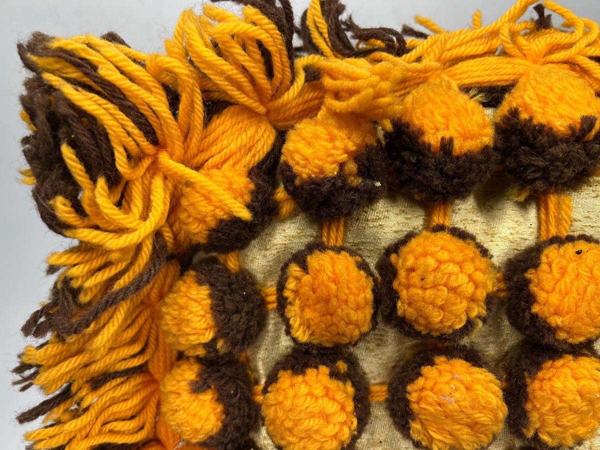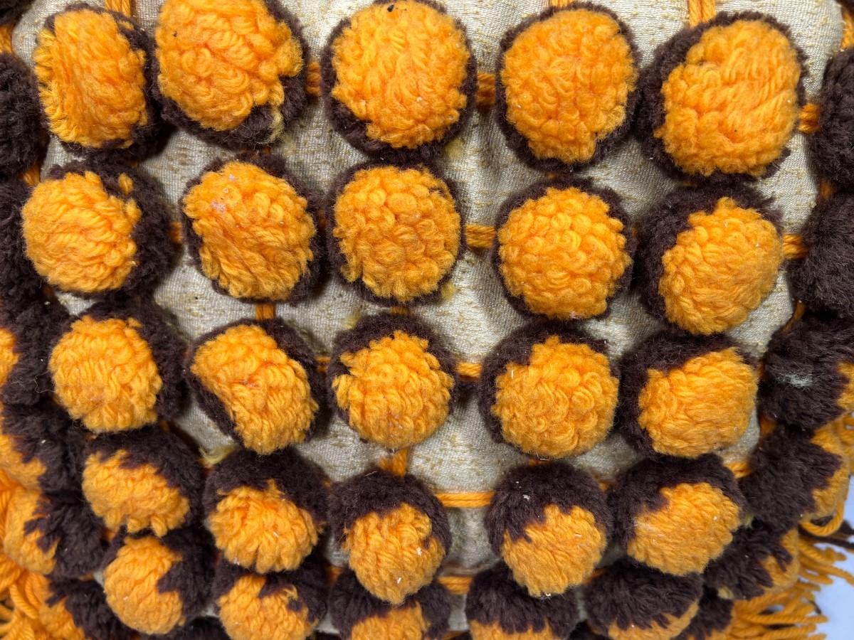 Vintage Retro Orange and Brown Yarn Puff Ball Pom Pom Throw Accent Pillow. In vintage condition.