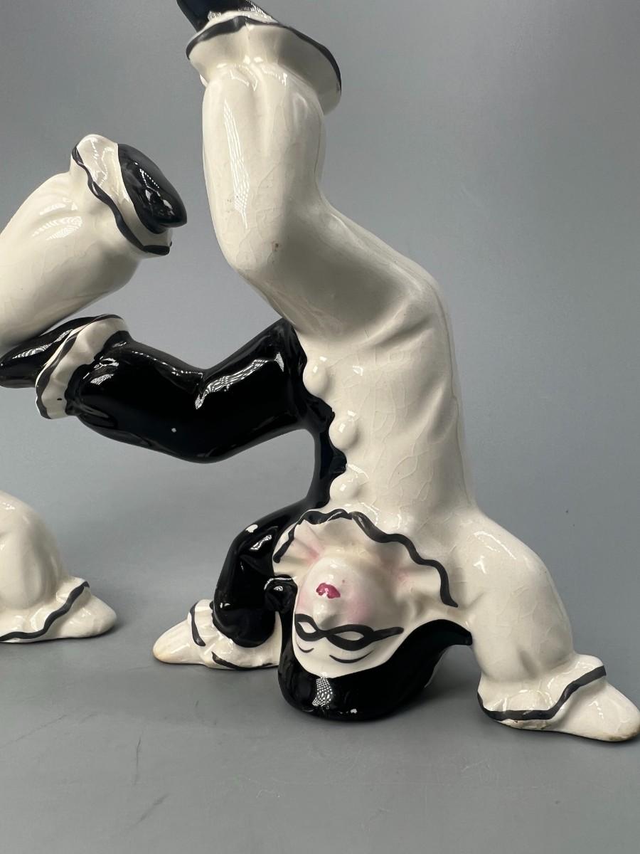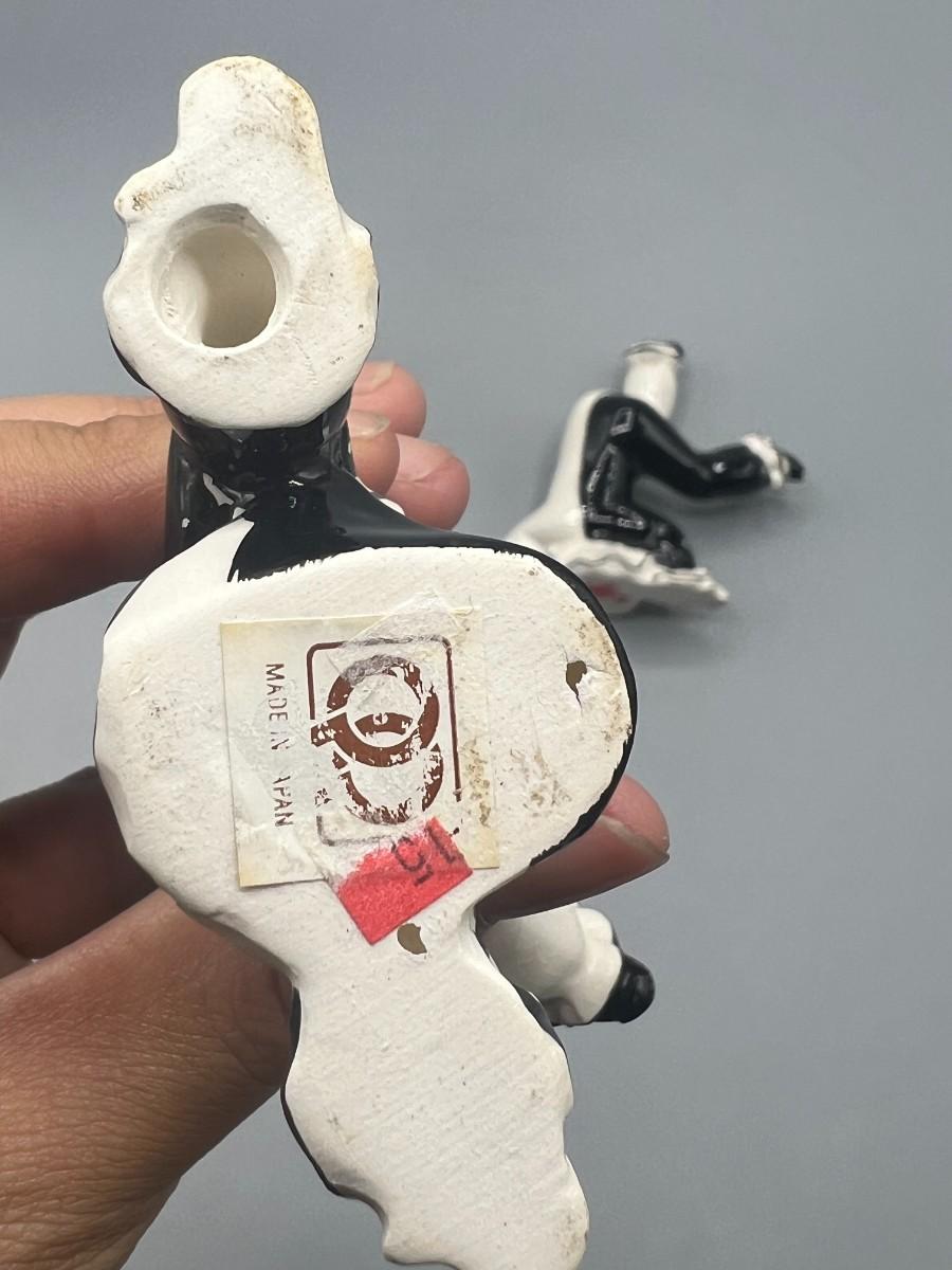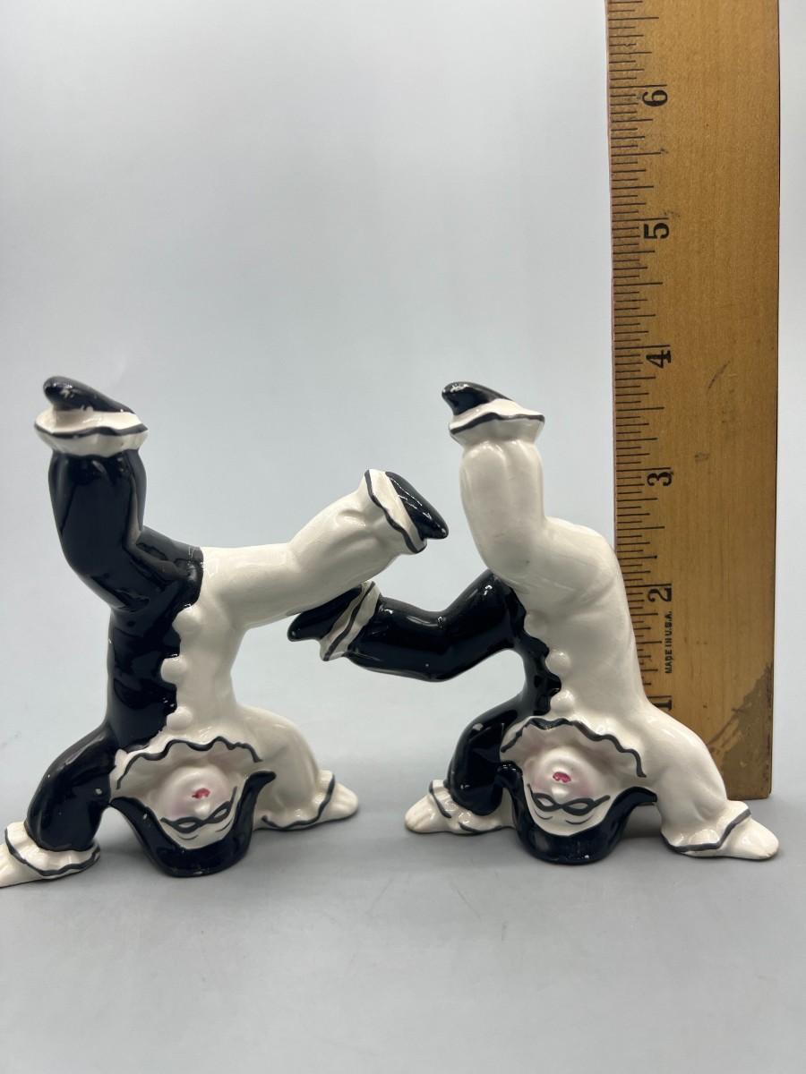 Vintage Ceramic Black & White Pierrot Harlequin Jester Clown Tumbling Japanese Trinket Figurines