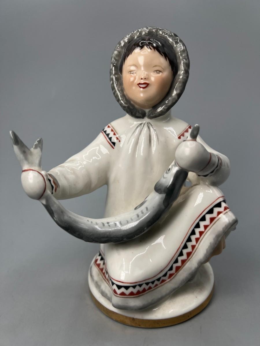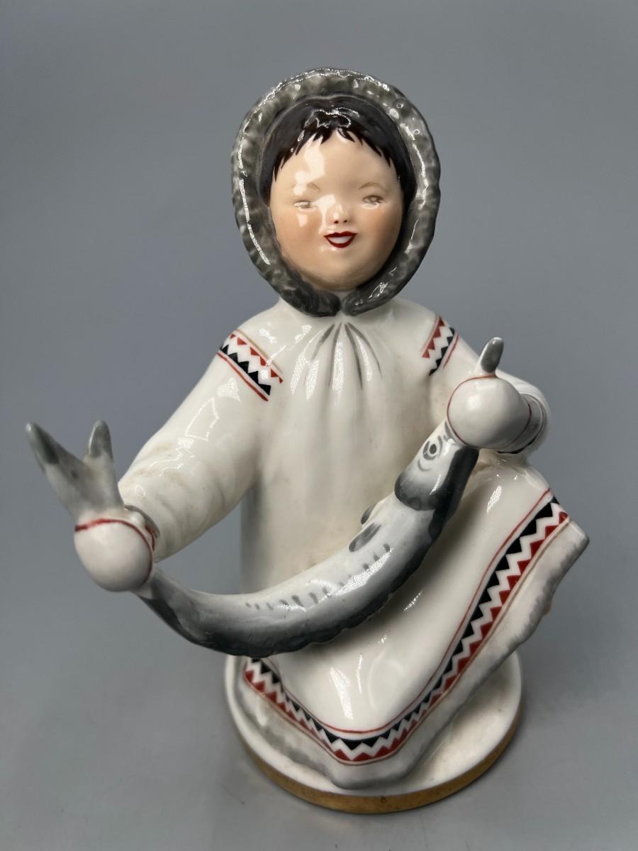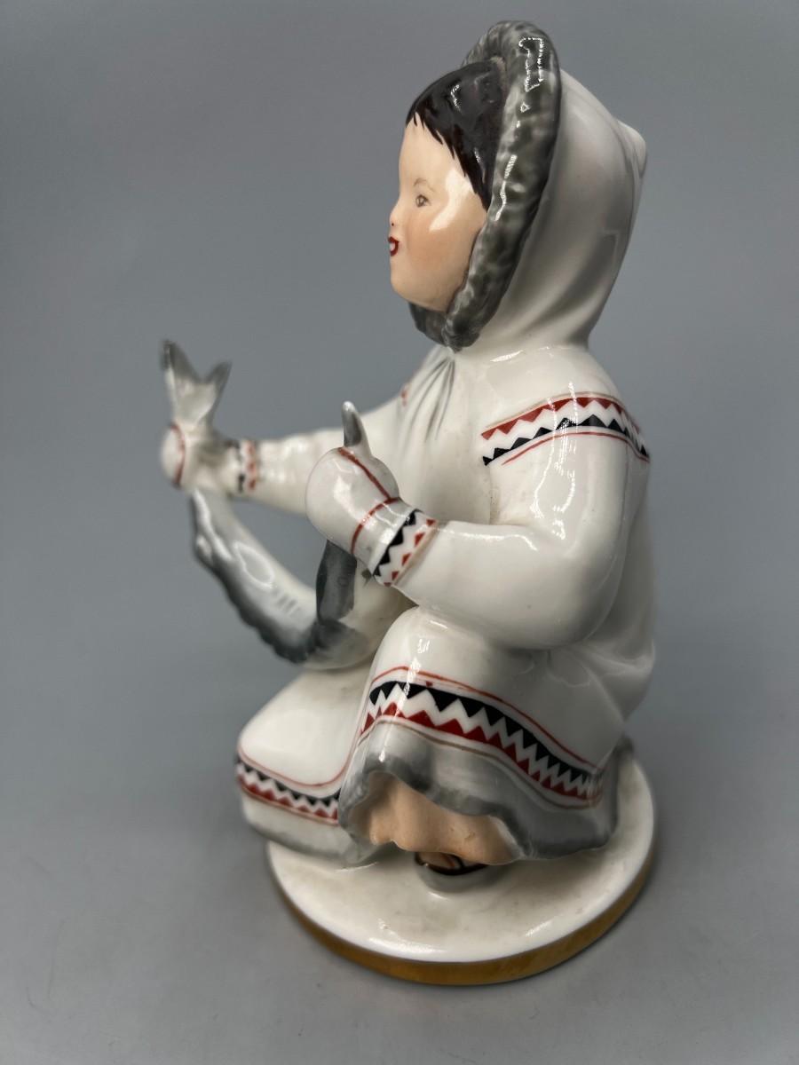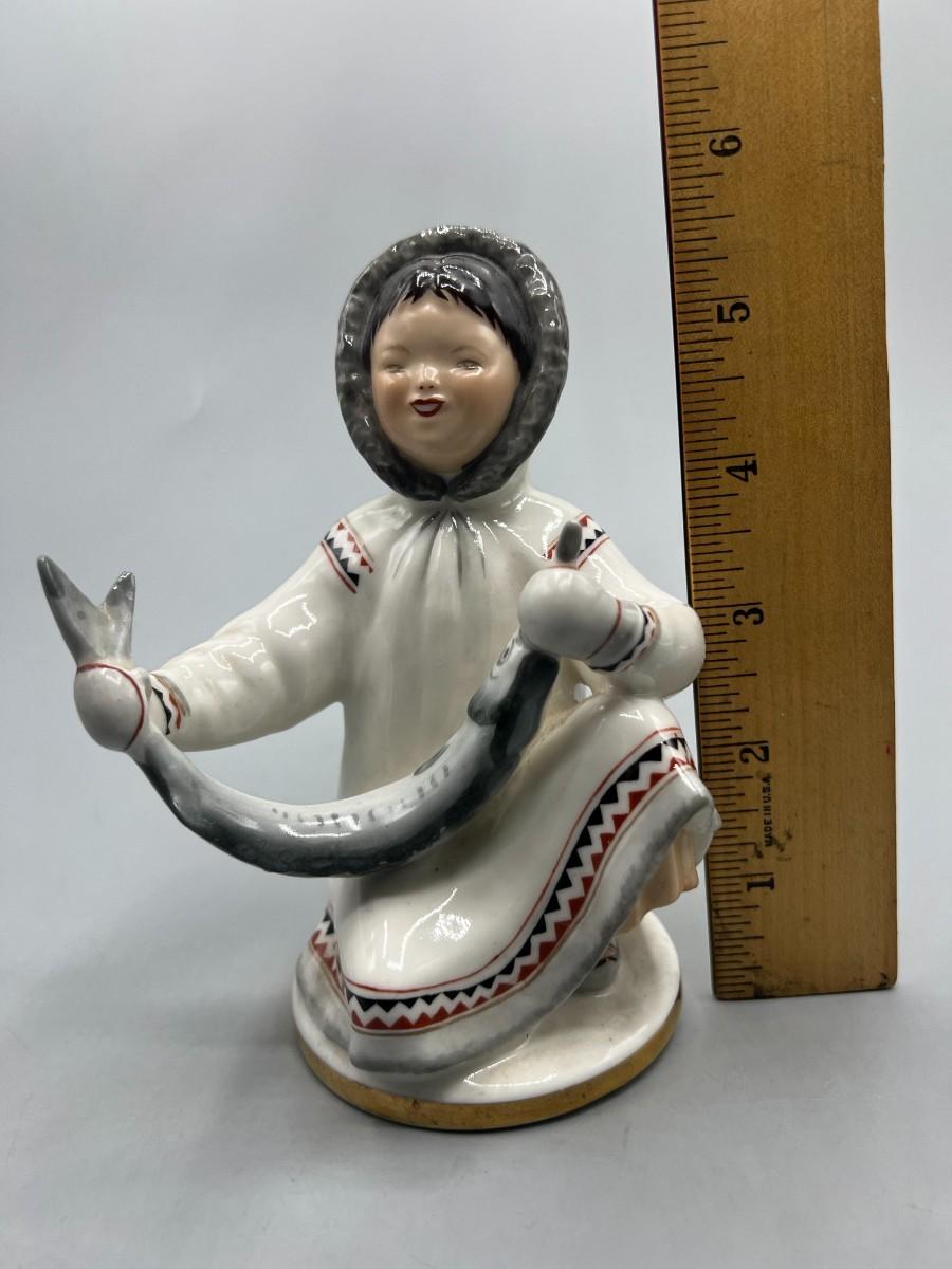 Vintage Royalty Porcelain Lomonosov USSR Stamped Yakut Inuit Boy with Caught Fish Figurine