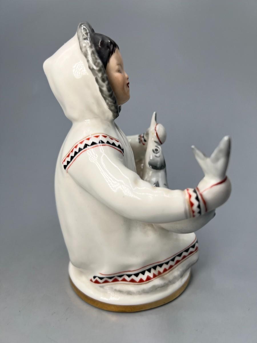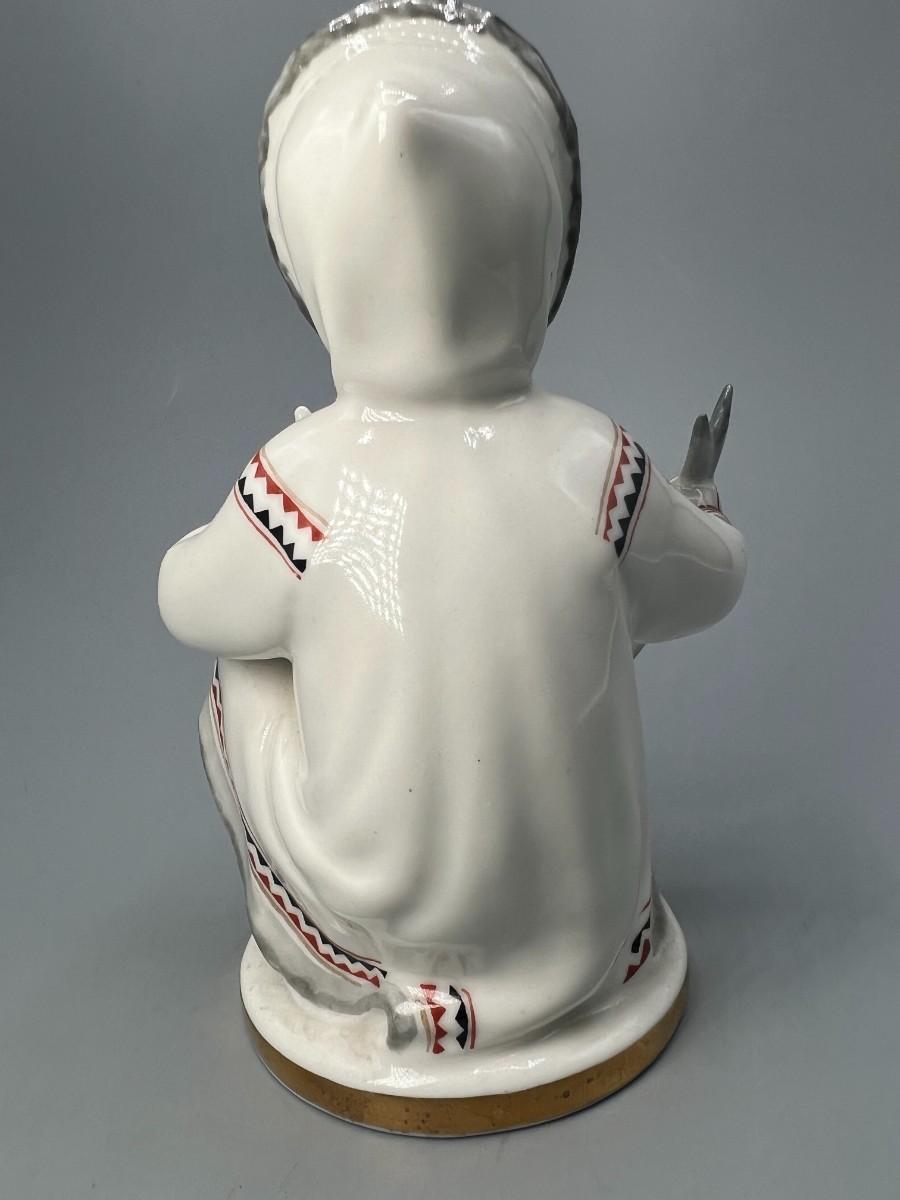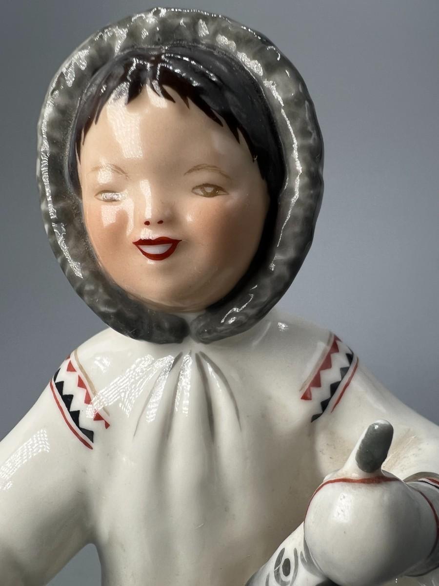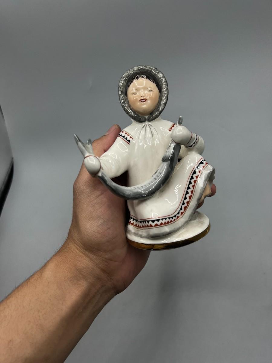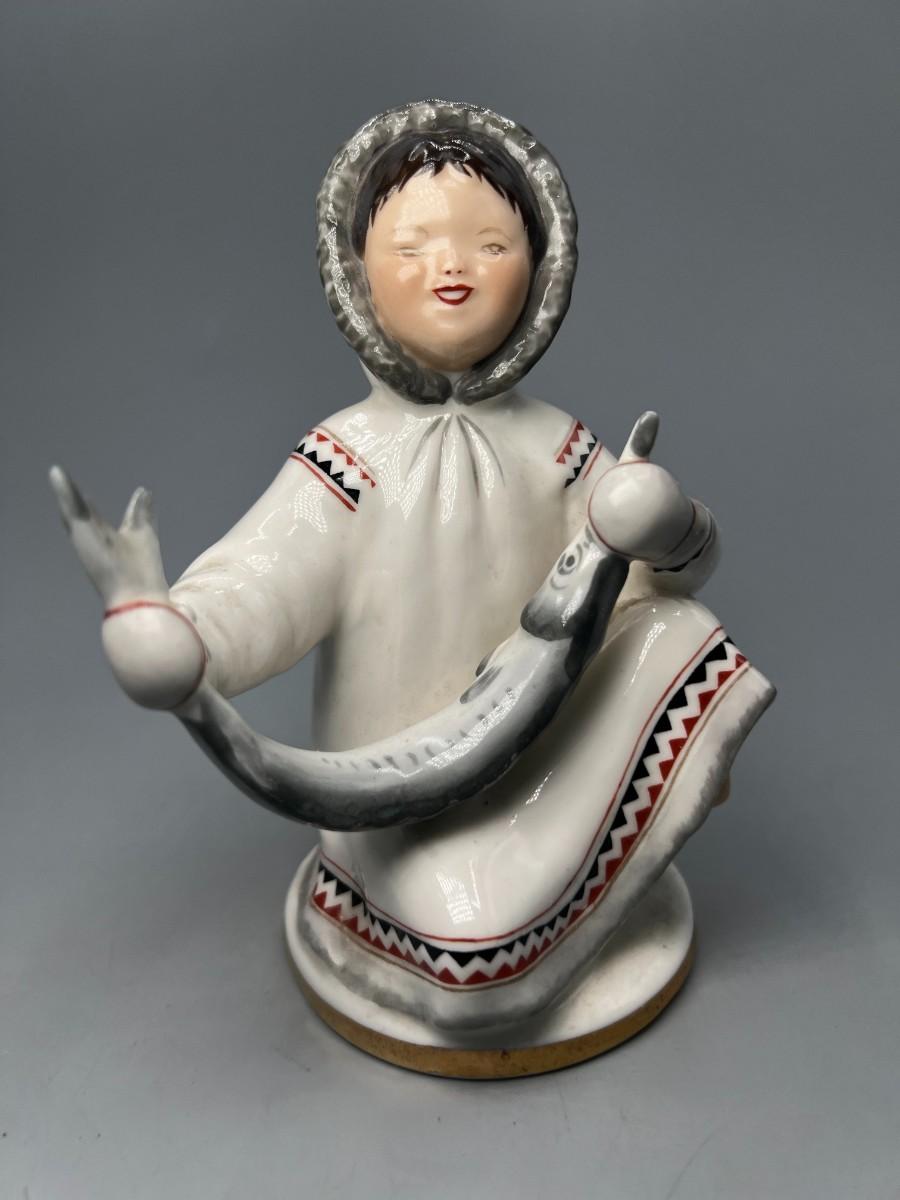 Vintage Royalty Porcelain Lomonosov USSR Stamped Yakut Inuit Boy with Caught Fish Figurine