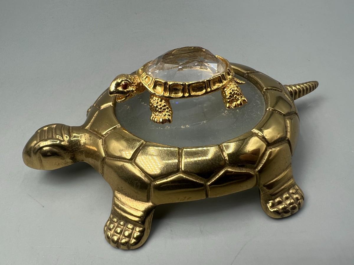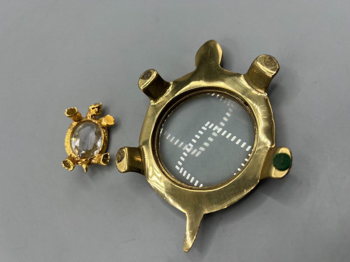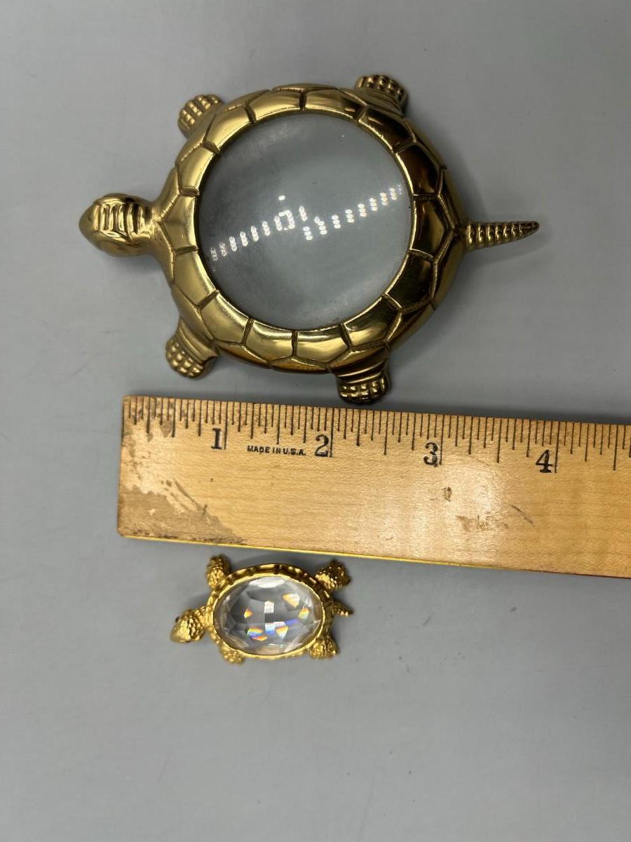 Gold Metal Tortoise Desktop Magnifying Glass & Small Turtle Faux Clear Jewel Trinket Piece