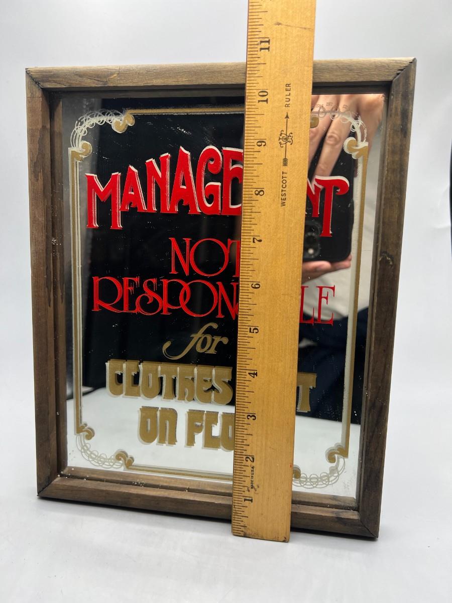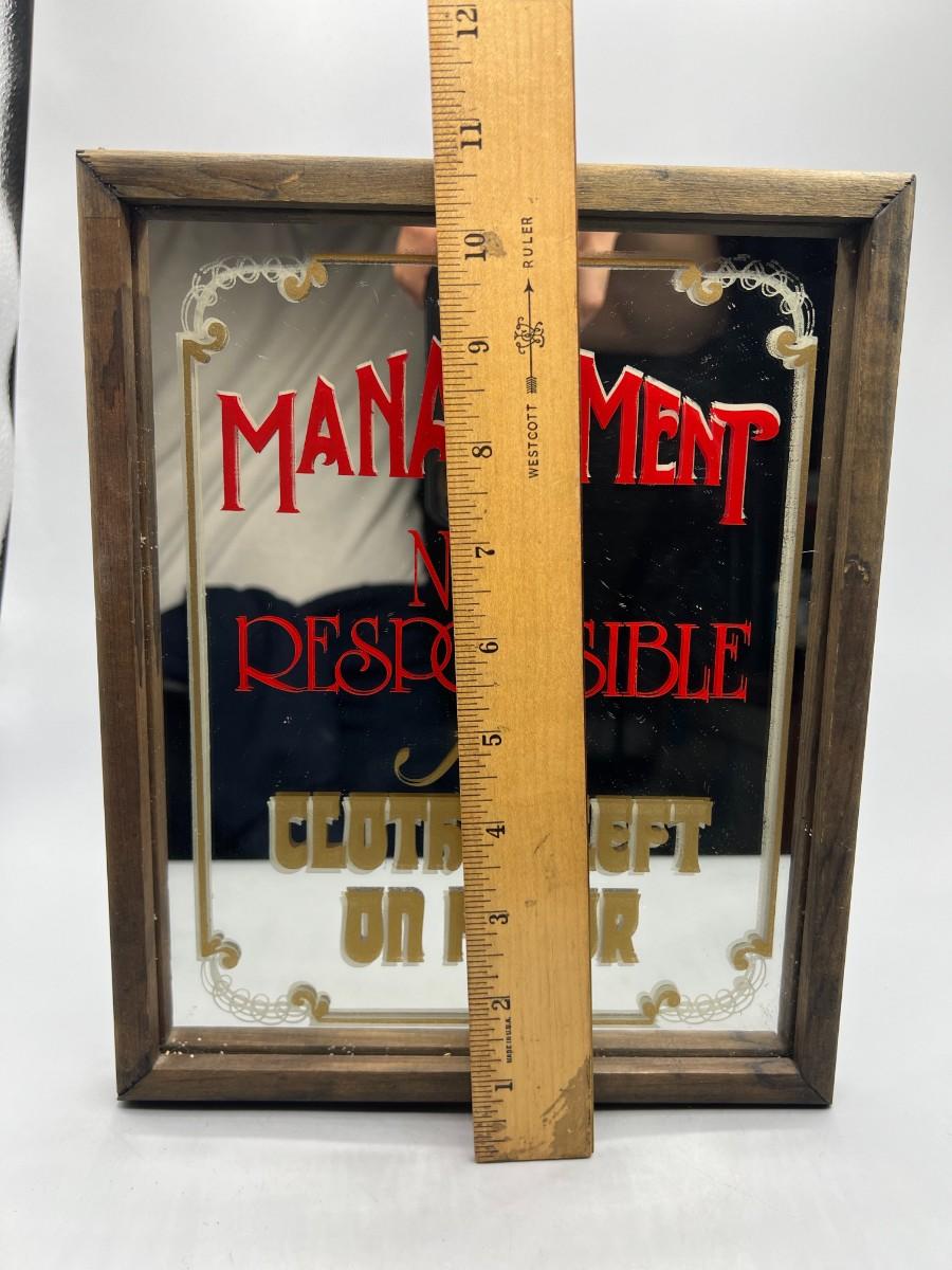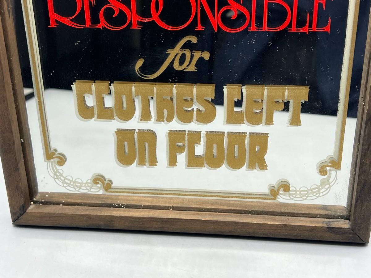 Vintage Barware Novelty Mirror Sign Management Not Responsible for Clothes Left on Floor