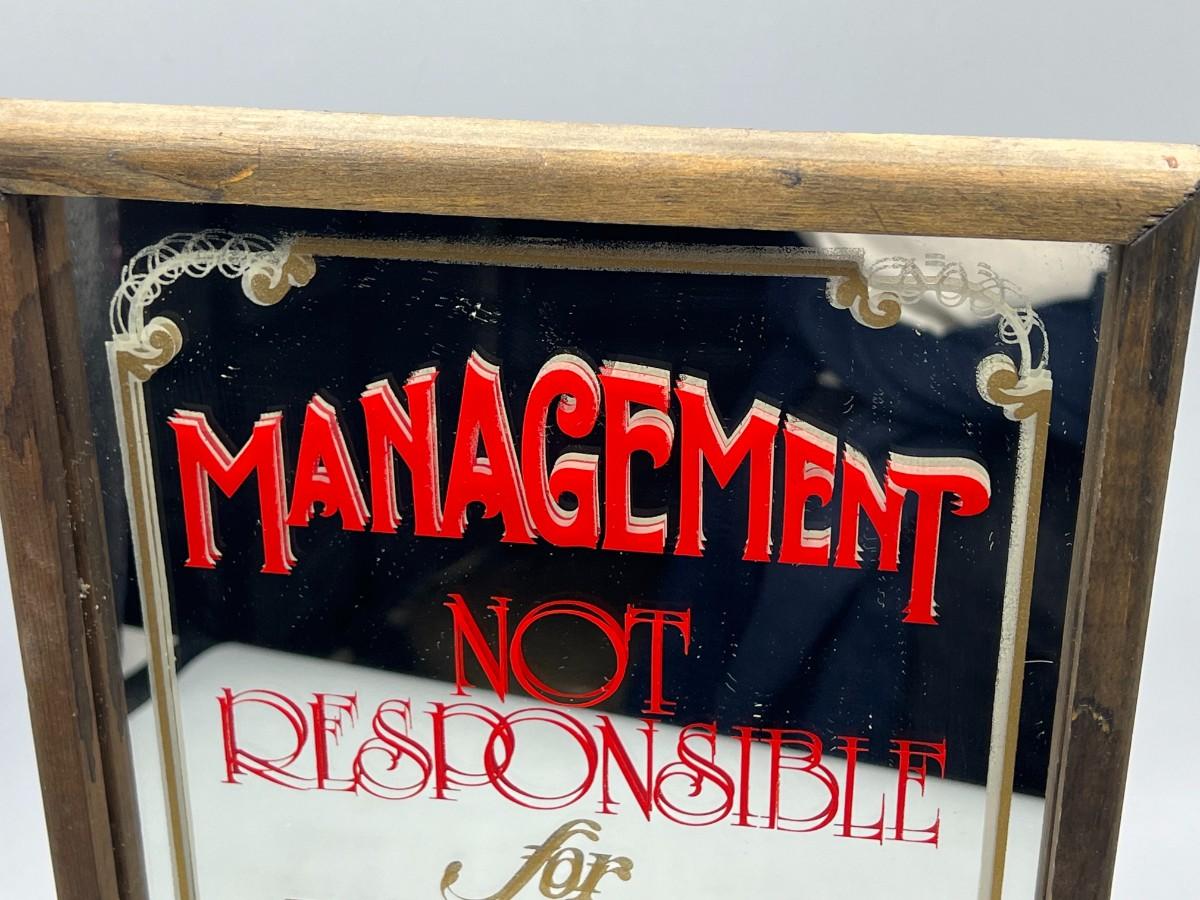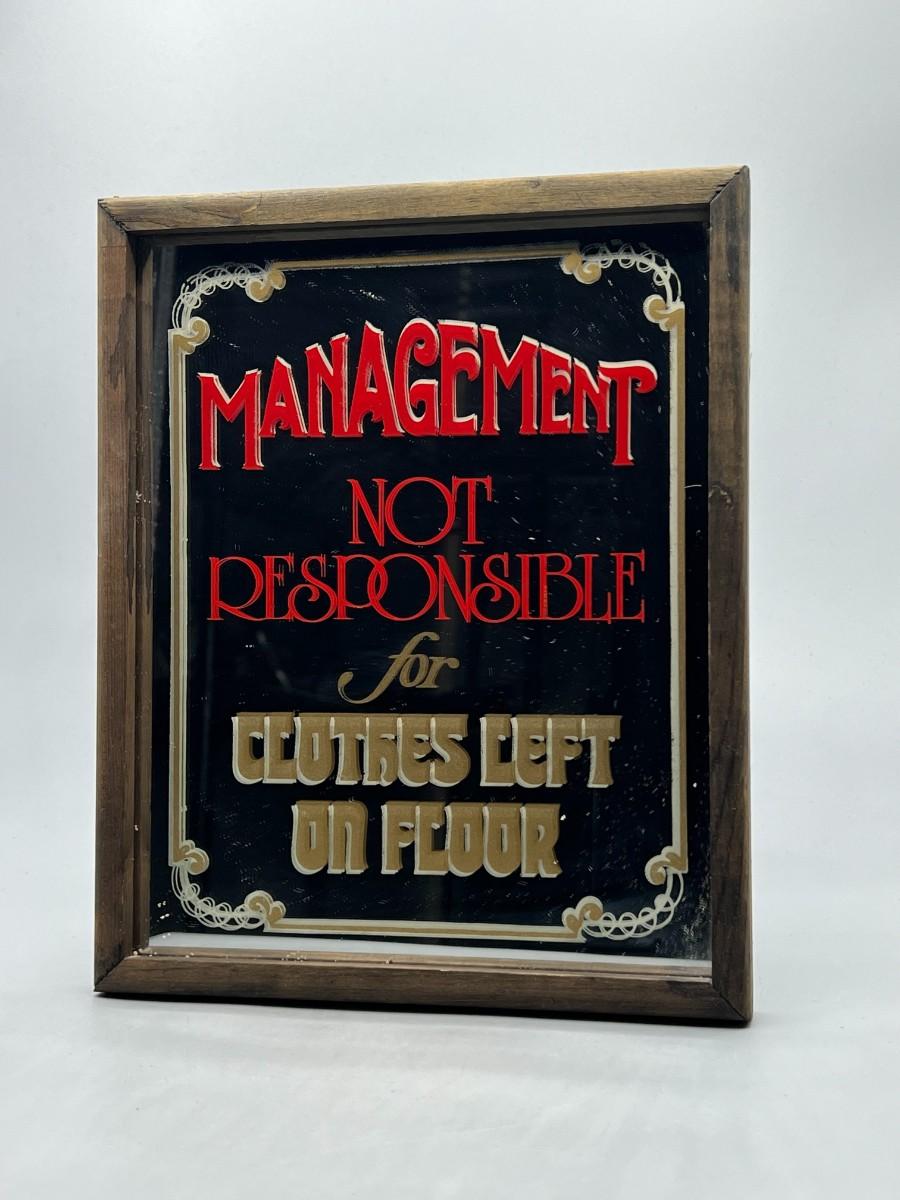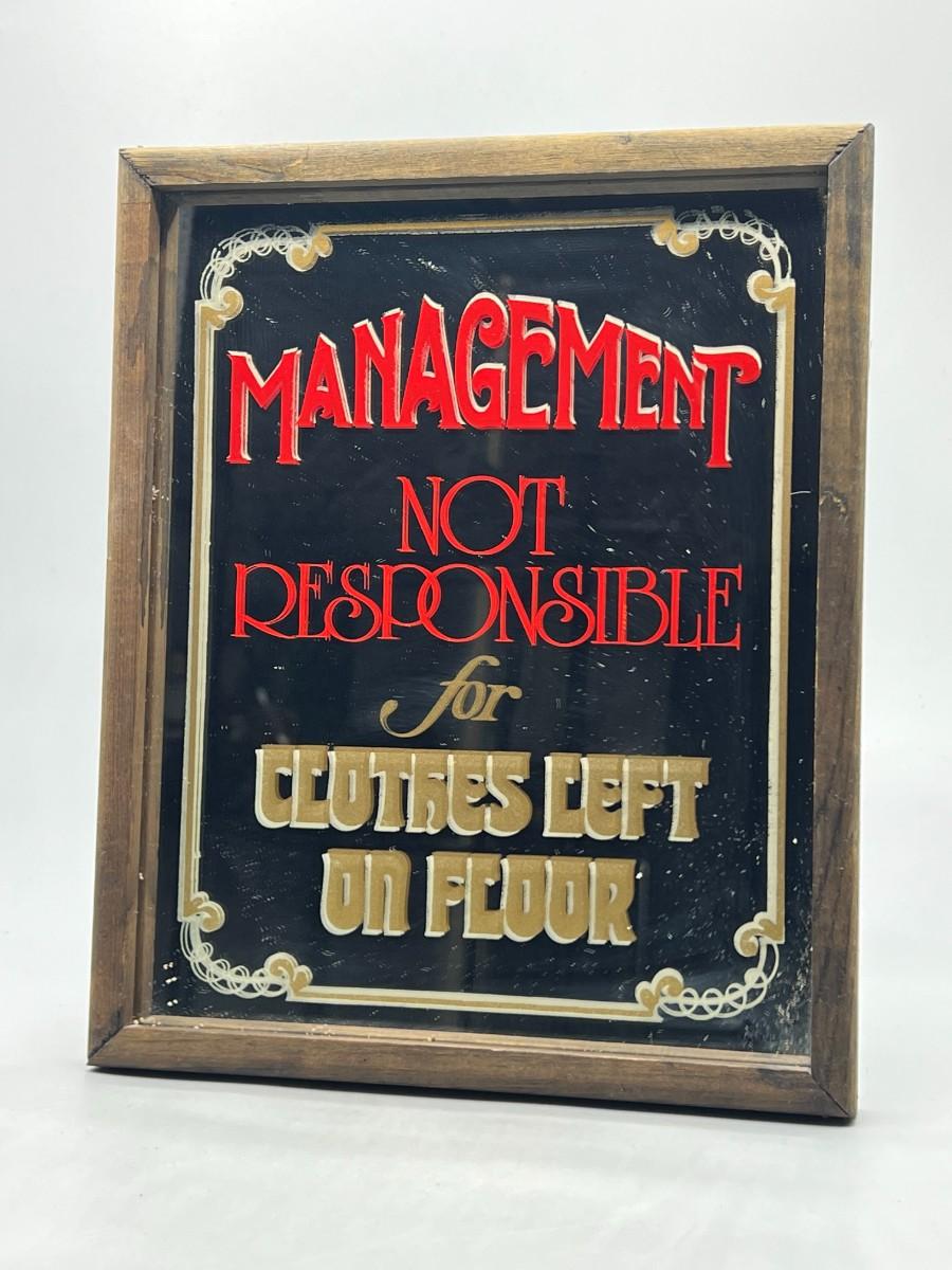 Vintage Barware Novelty Mirror Sign Management Not Responsible for Clothes Left on Floor
