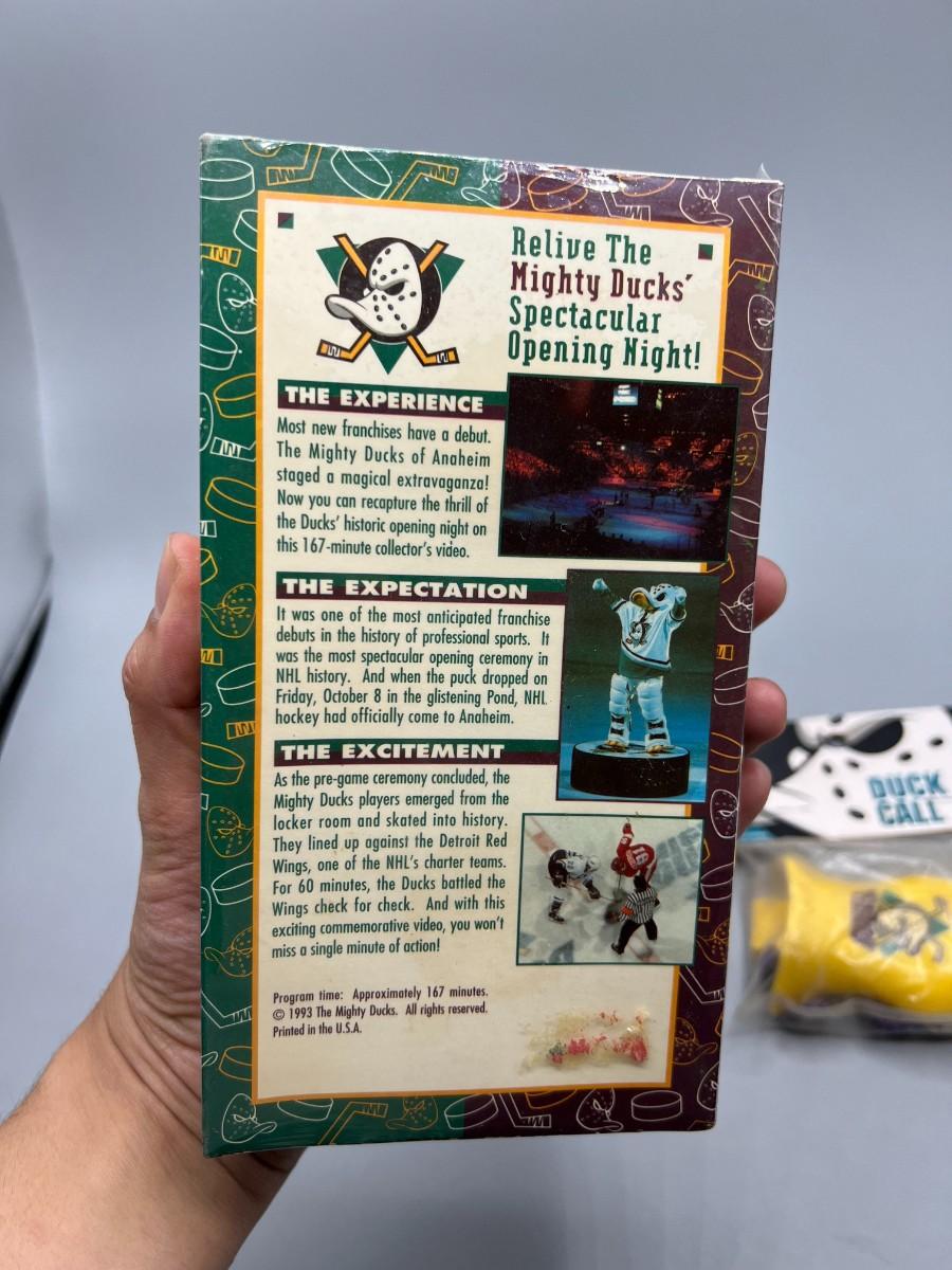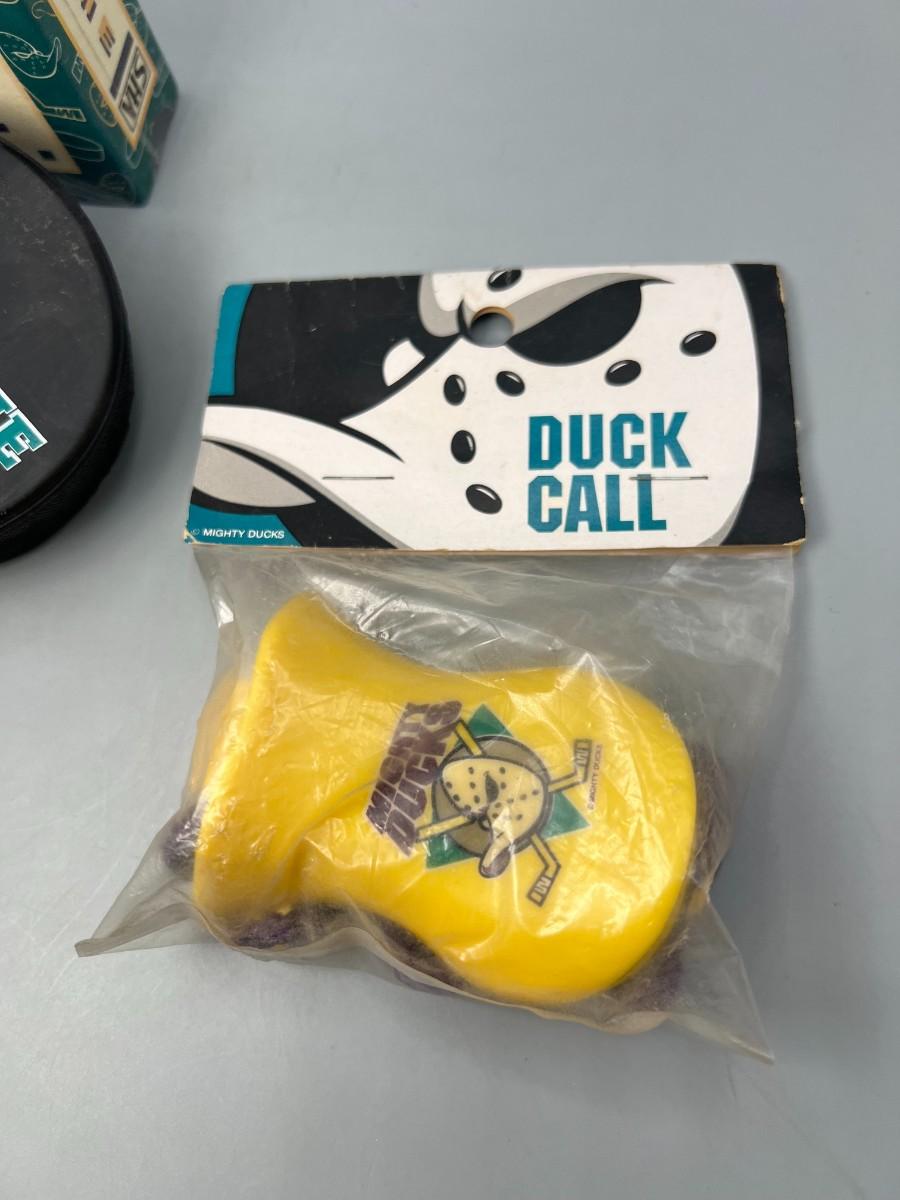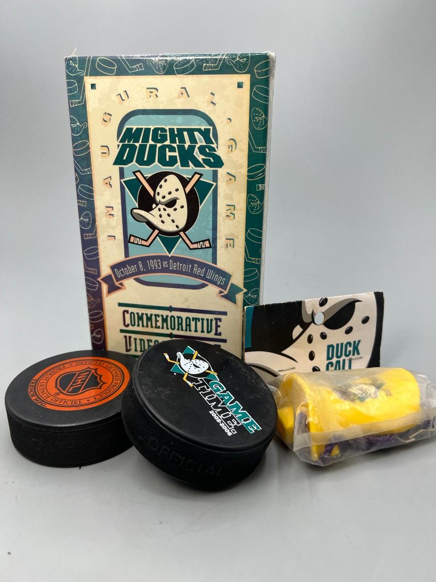 Anaheim Mighty Ducks Sealed Duck Call, Pucks, & Unopened Promotional VHS Tape