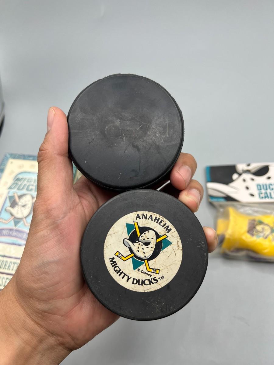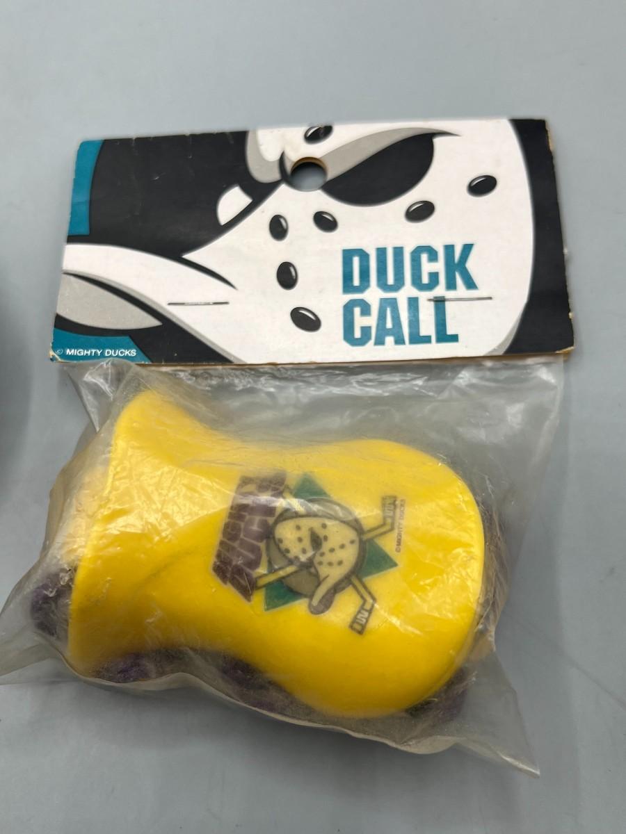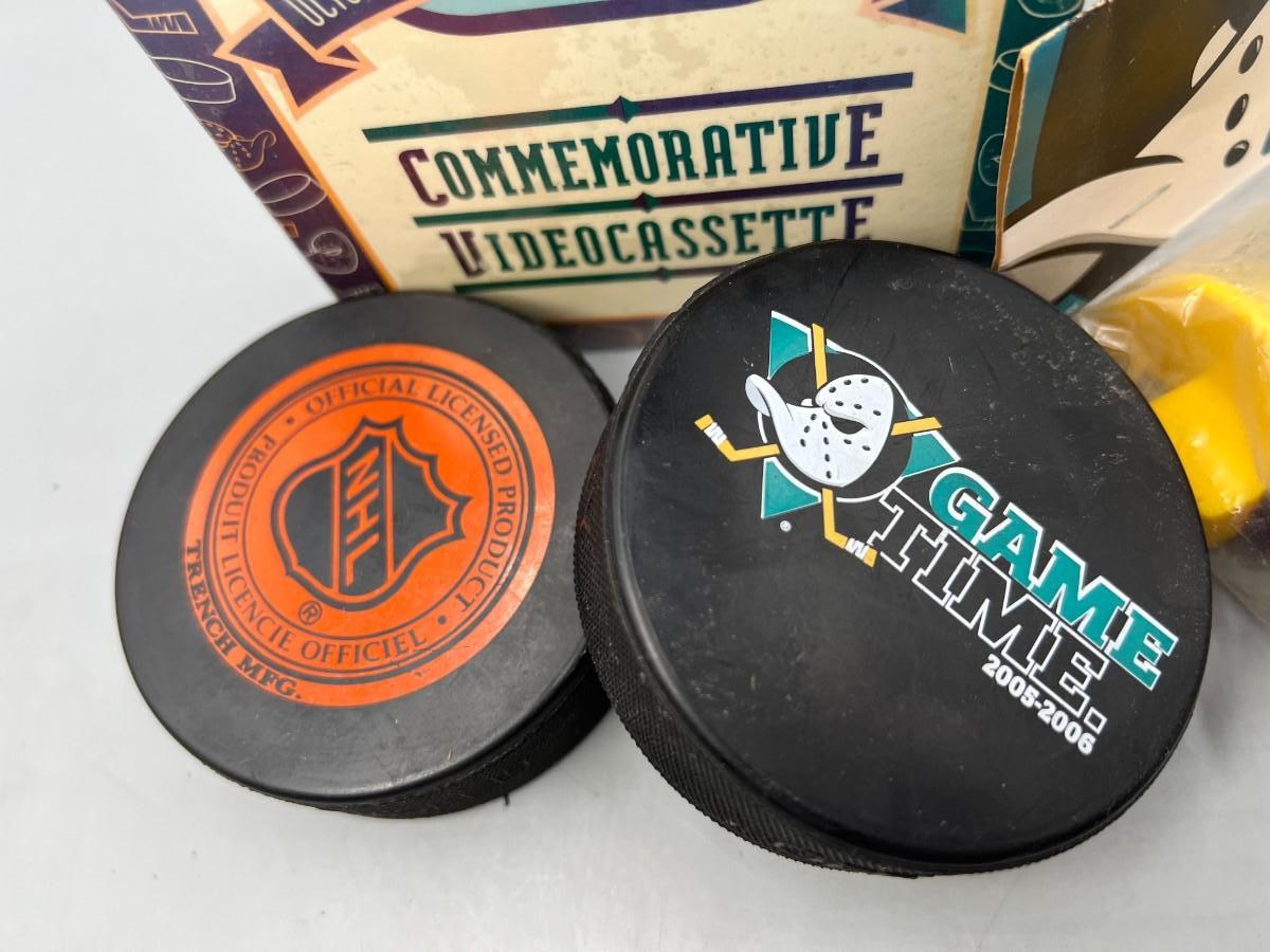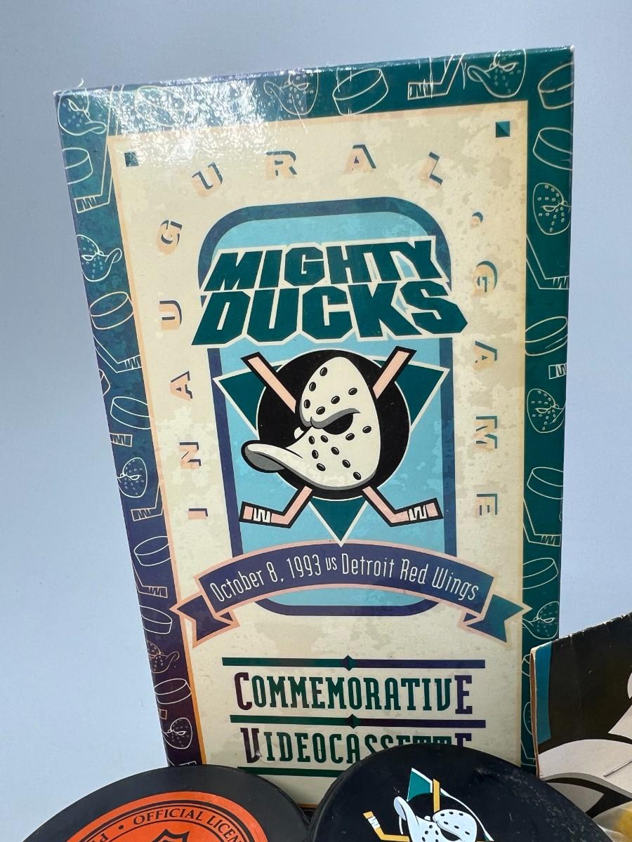 Anaheim Mighty Ducks Sealed Duck Call, Pucks, & Unopened Promotional VHS Tape