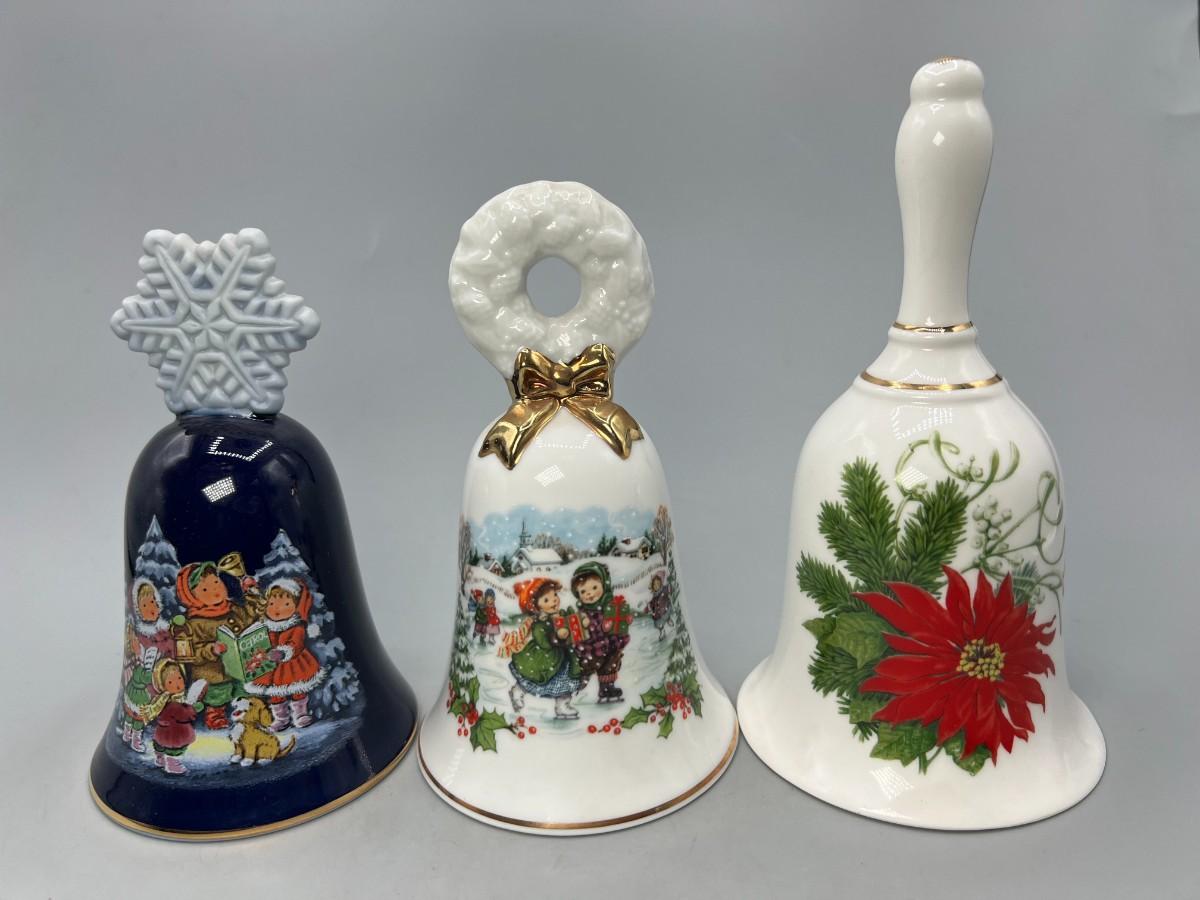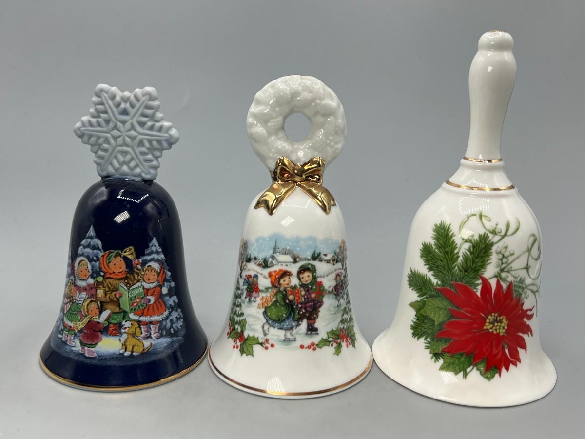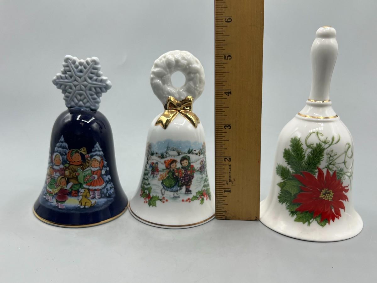 Set of Three Ceramic Porcelain Christmas Holiday Seasonal Bell Figurines