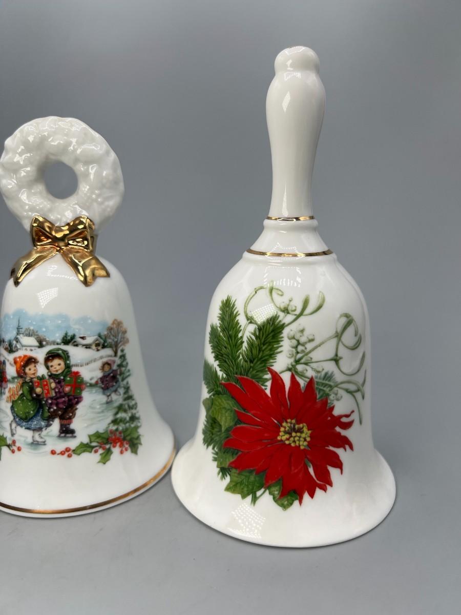 Set of Three Ceramic Porcelain Christmas Holiday Seasonal Bell Figurines. In good condition.