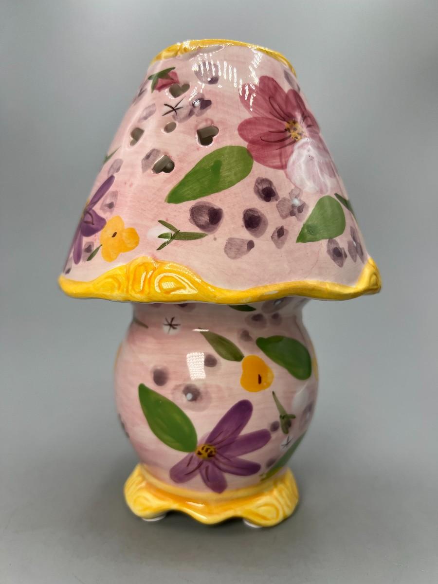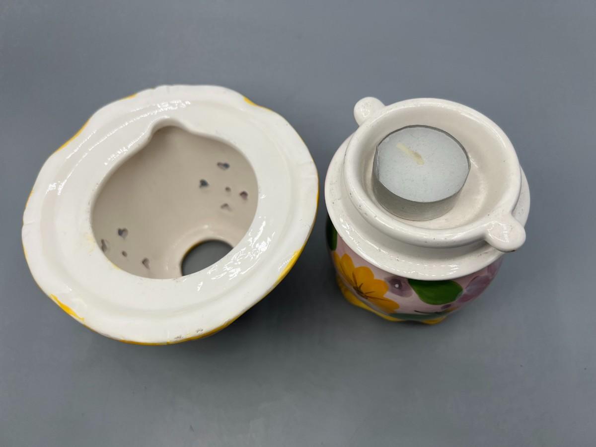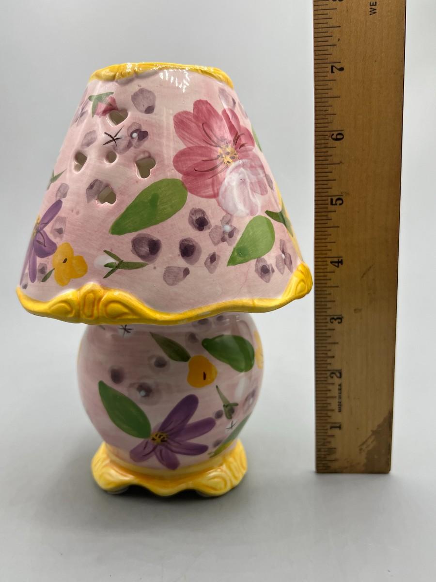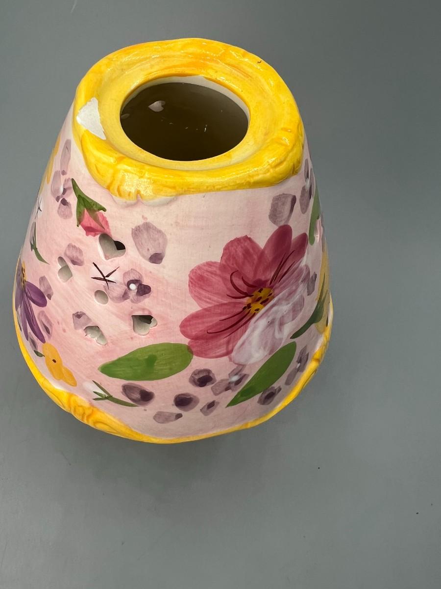 Small Ceramic Pink Flower Painted Tealight Candle Holder. Two pieces, candle goes inside, small cut outs let light shine through. Chip in top, does not affect use and may not be visible depending on where it is displayed.