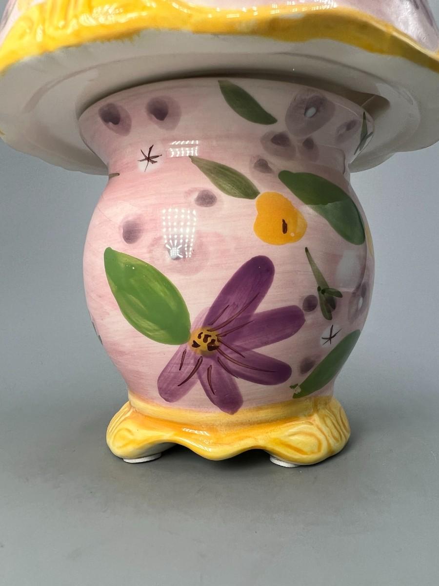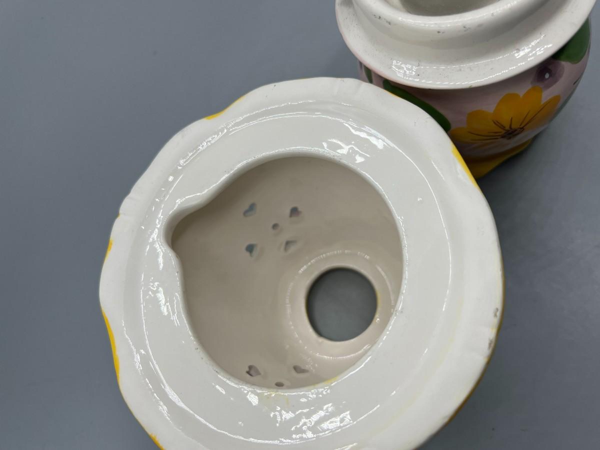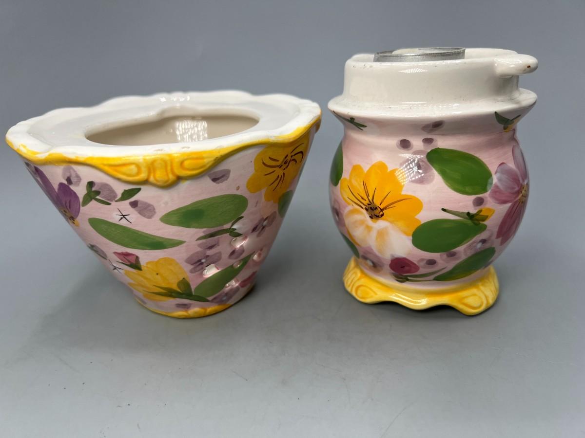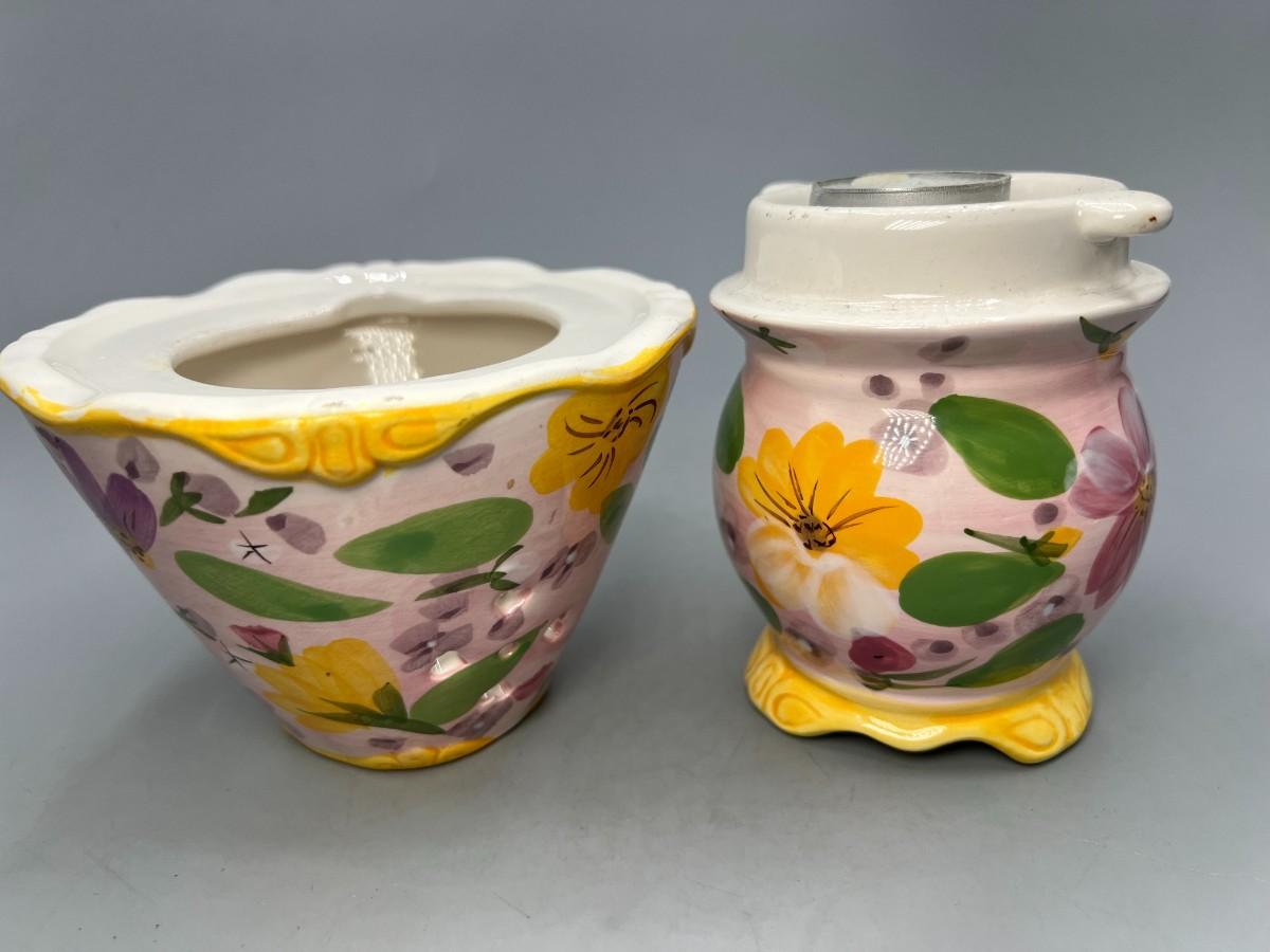 Small Ceramic Pink Flower Painted Tealight Candle Holder. Two pieces, candle goes inside, small cut outs let light shine through. Chip in top, does not affect use and may not be visible depending on where it is displayed.