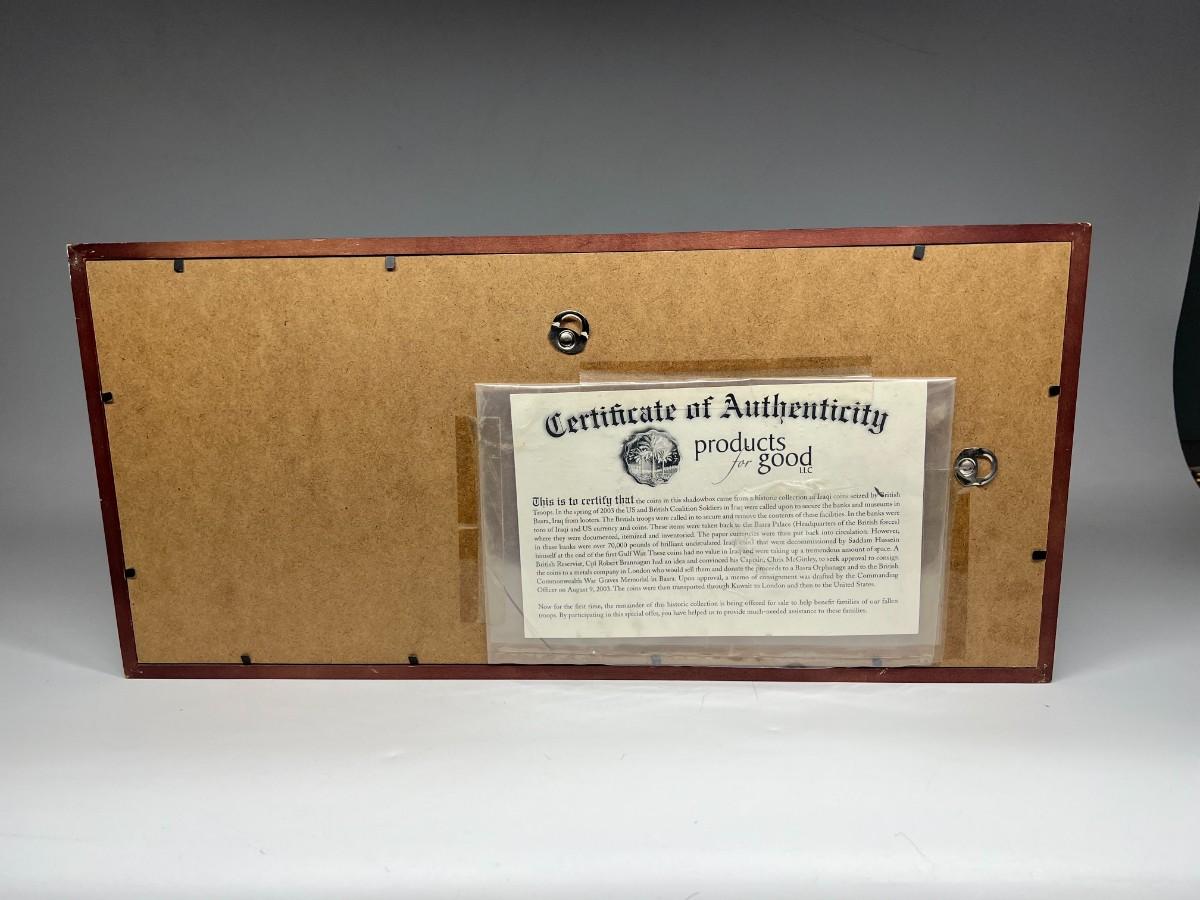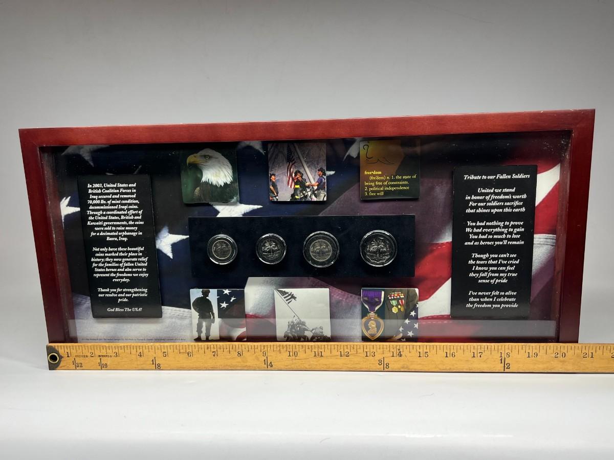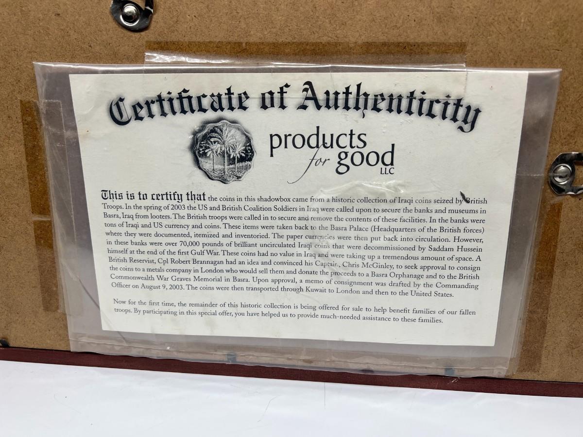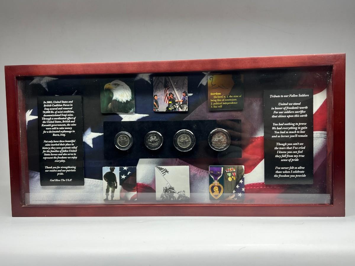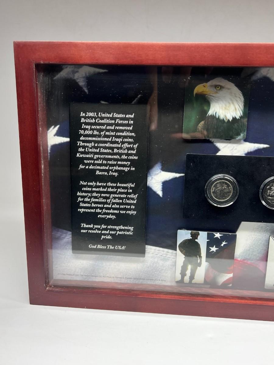 Fallen Solider Memorial Shadowbox with Four Uncirculated Iraqi Coins from Products for Good with COA. In good condition. COA attached to the back.