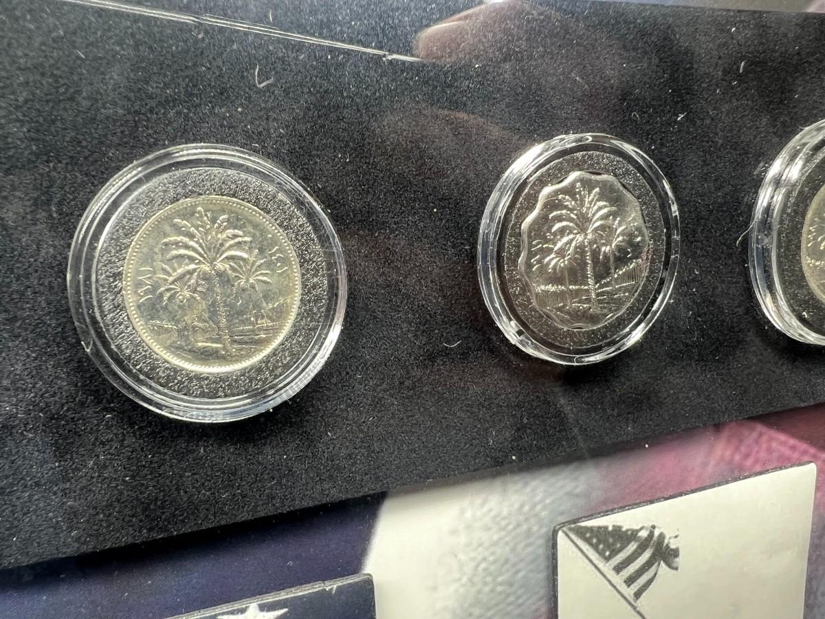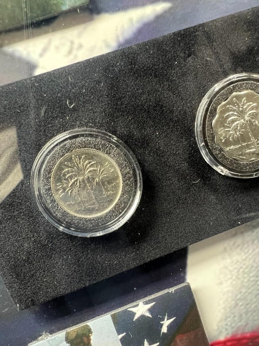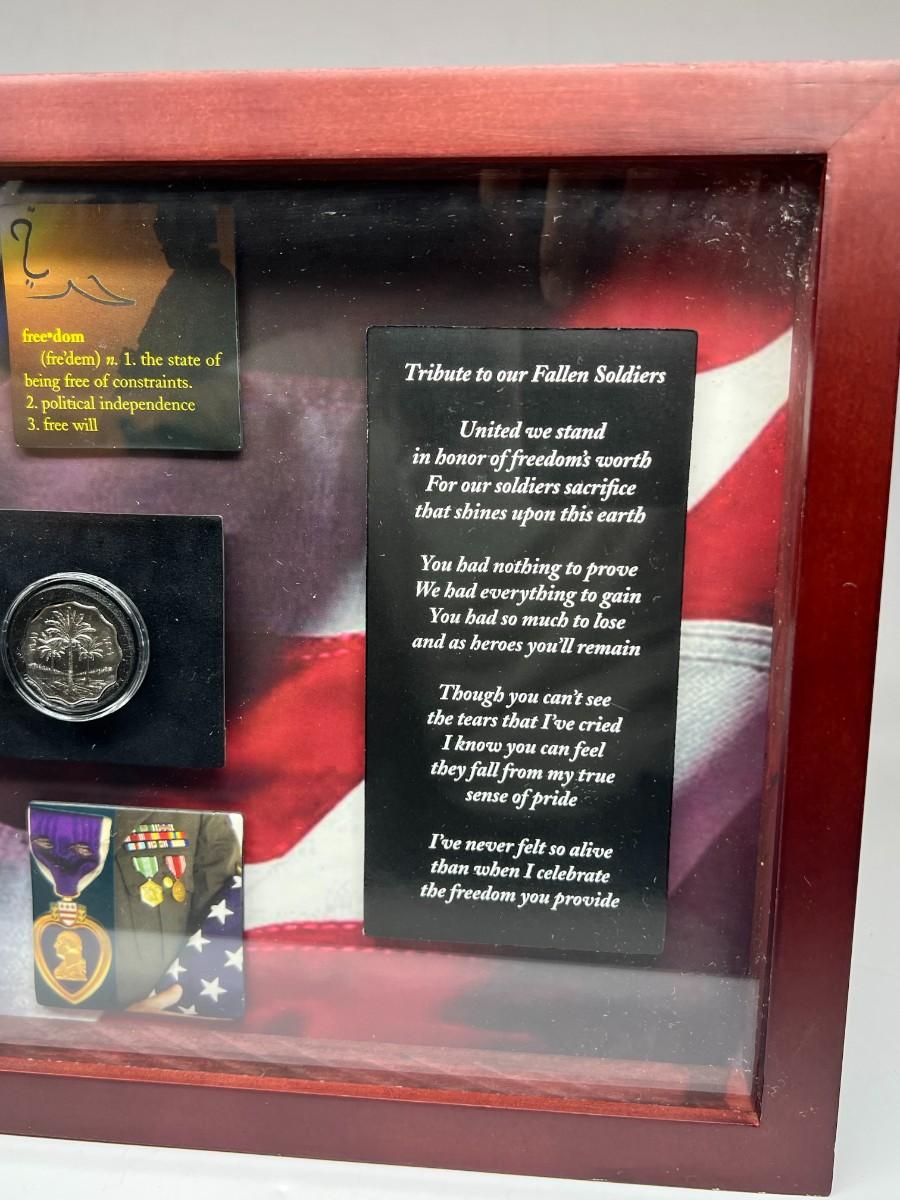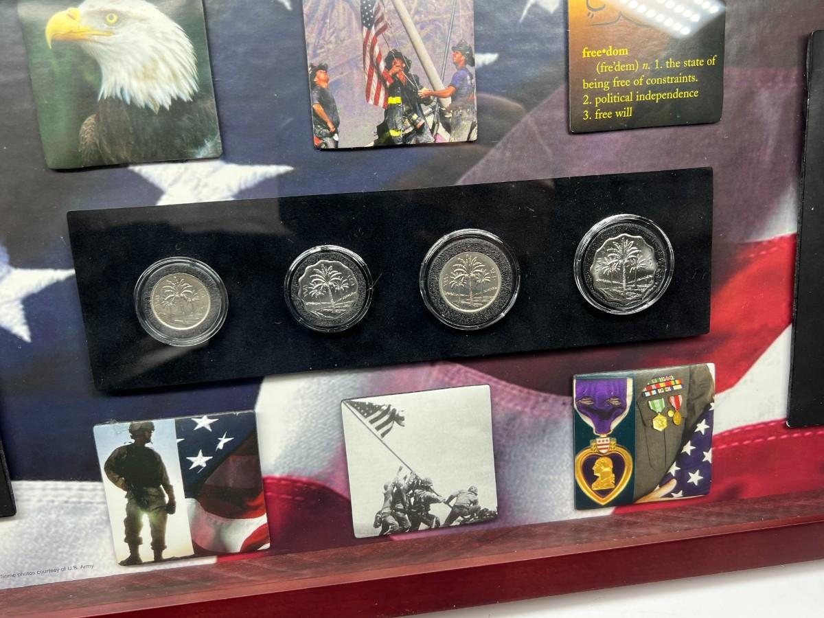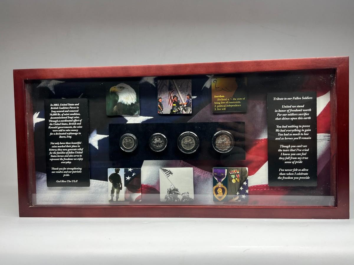 Fallen Solider Memorial Shadowbox with Four Uncirculated Iraqi Coins from Products for Good with COA. In good condition. COA attached to the back.