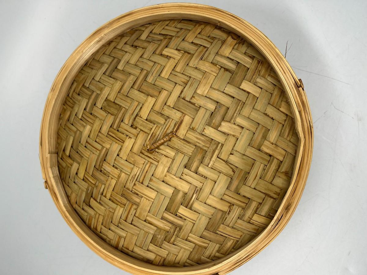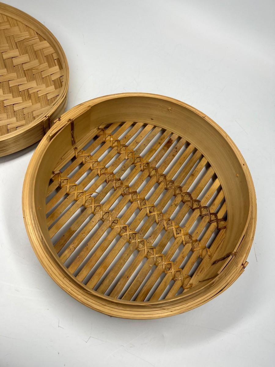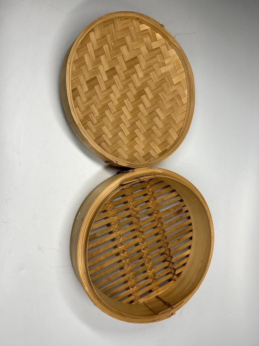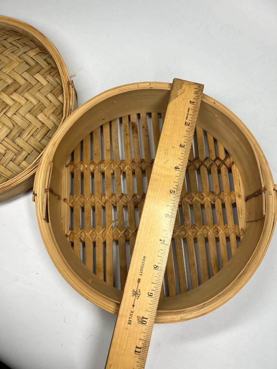Vintage Bamboo Rattan Cane Lidded Steamer Basket. Good condition. Displays well.
