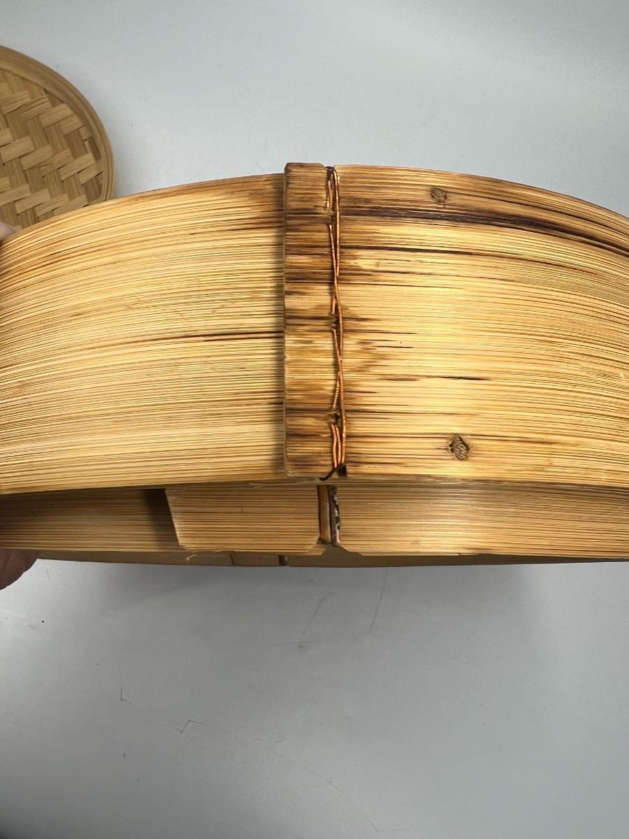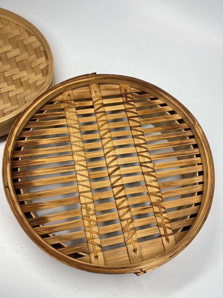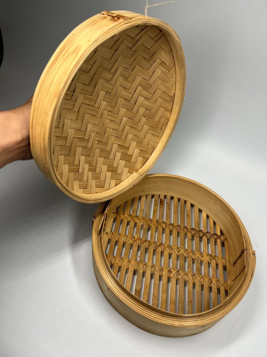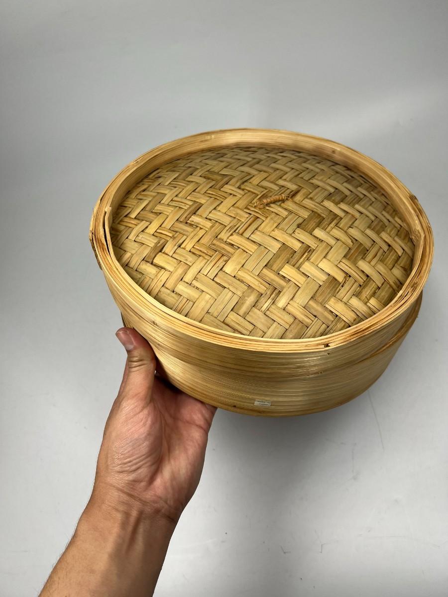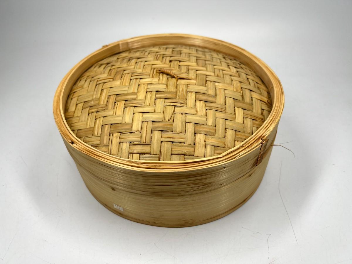 Vintage Bamboo Rattan Cane Lidded Steamer Basket. Good condition. Displays well.