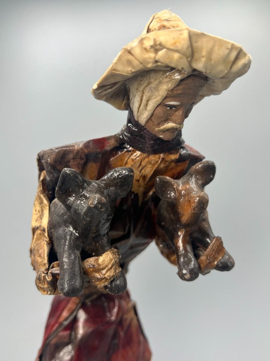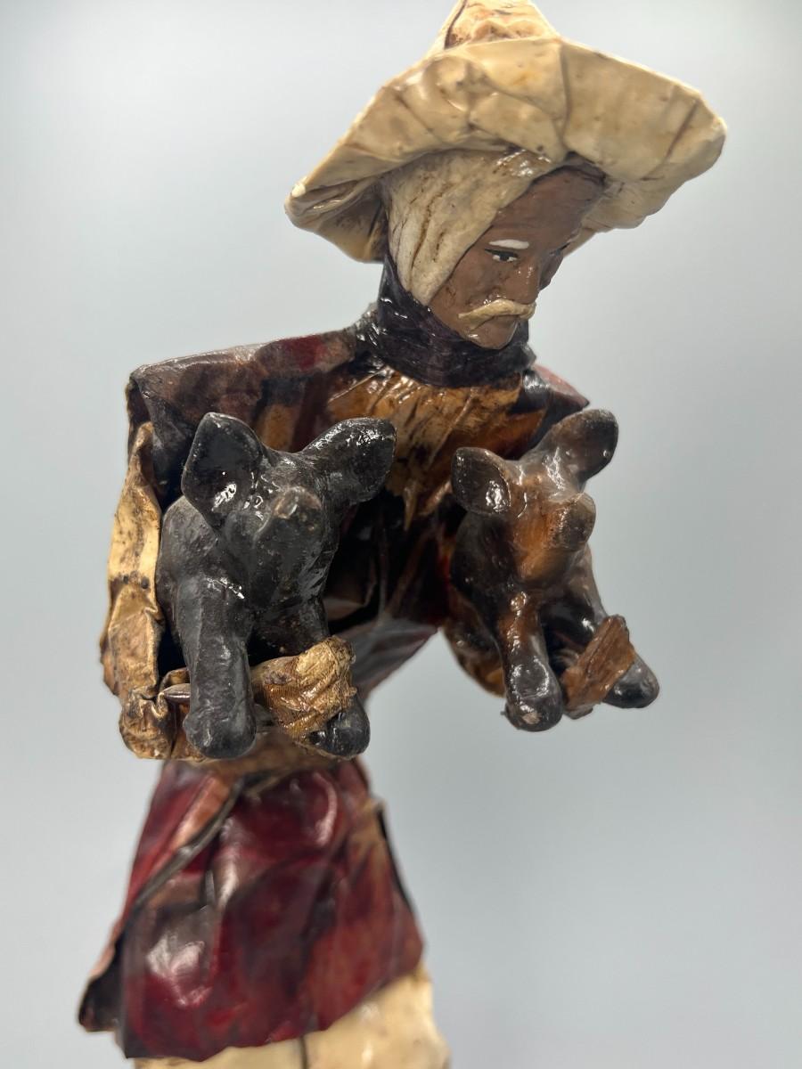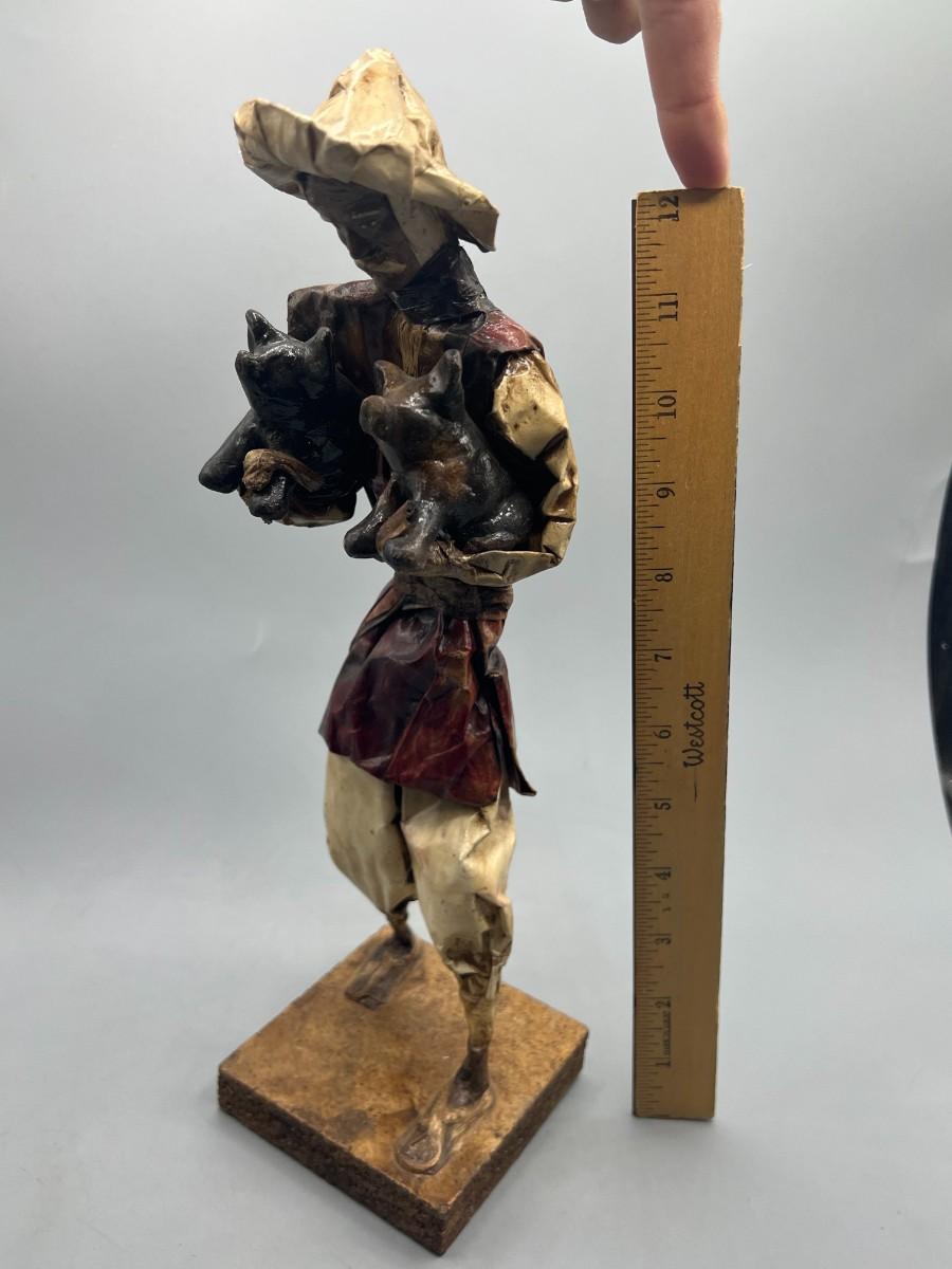Vintage Mexican Folk Art Handmade Paper Mache Figurine of Agricultural Man Carrying Livestock