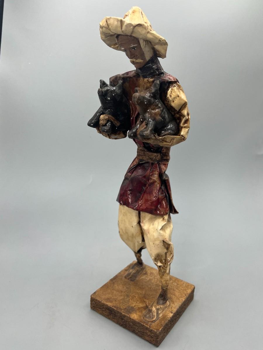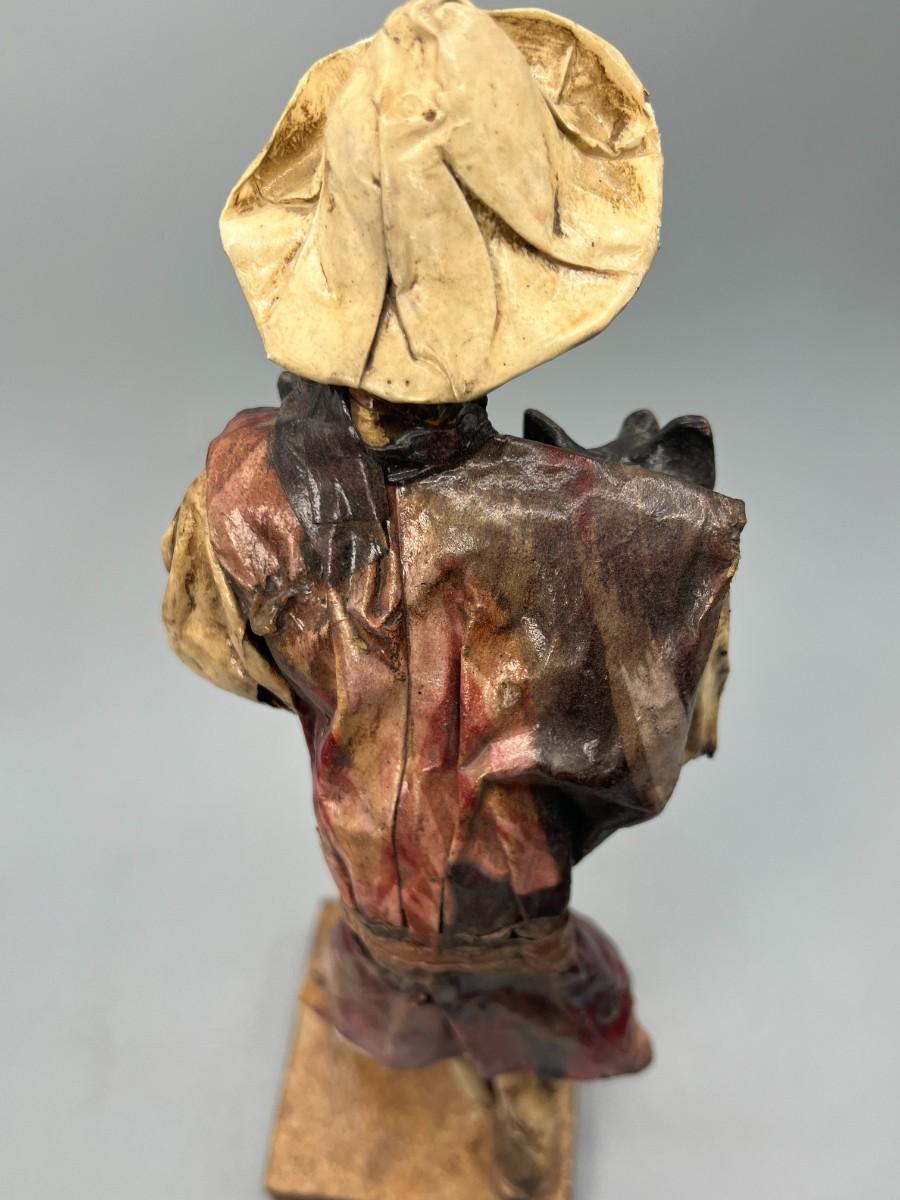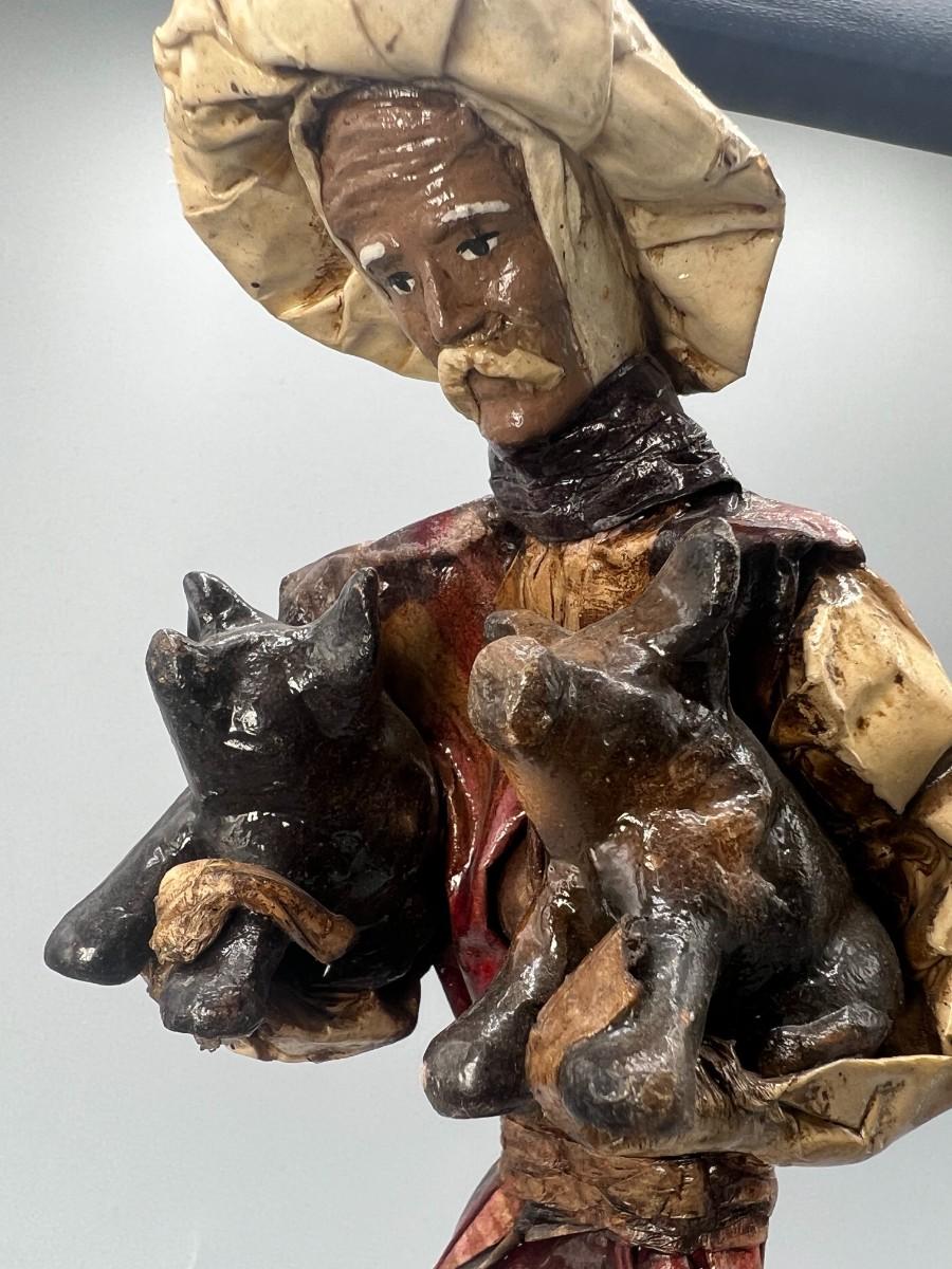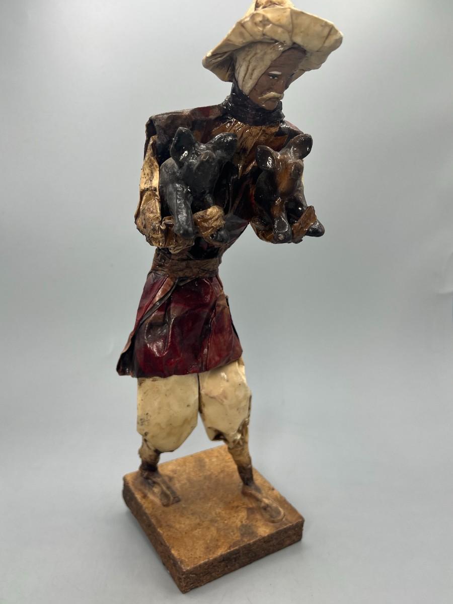 Vintage Mexican Folk Art Handmade Paper Mache Figurine of Agricultural Man Carrying Livestock