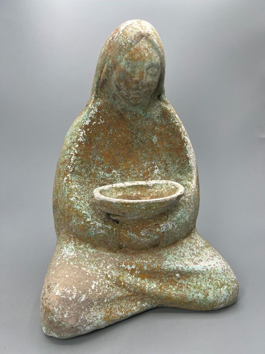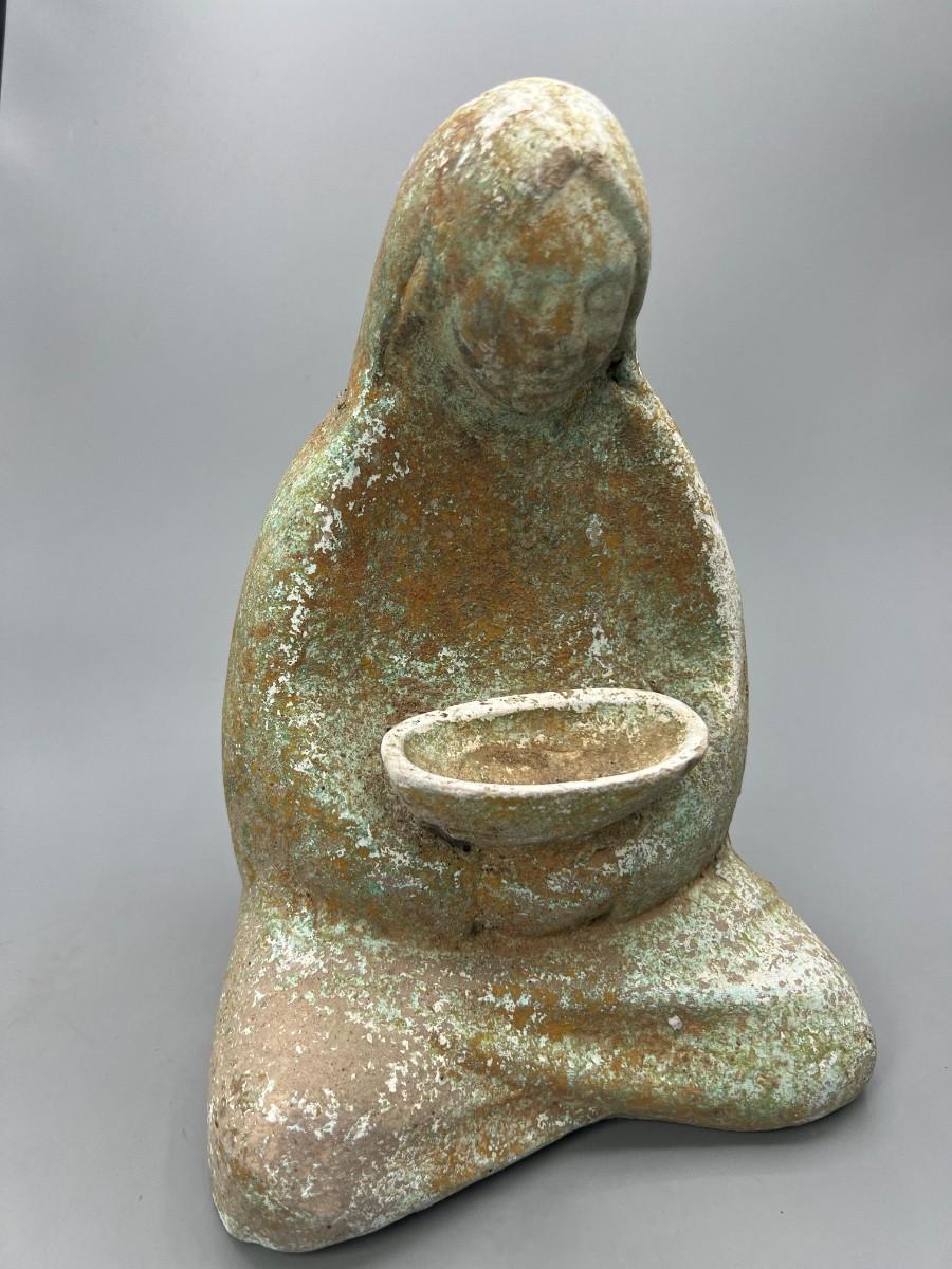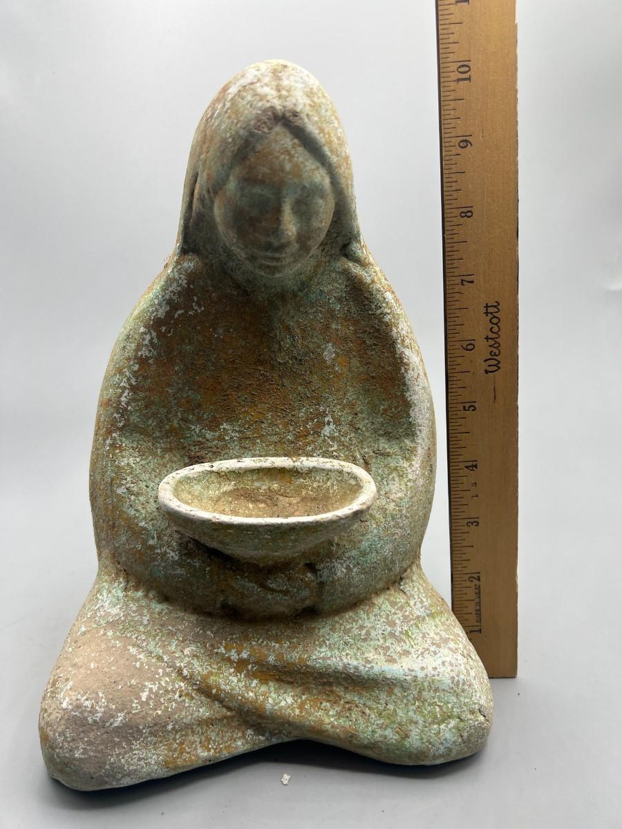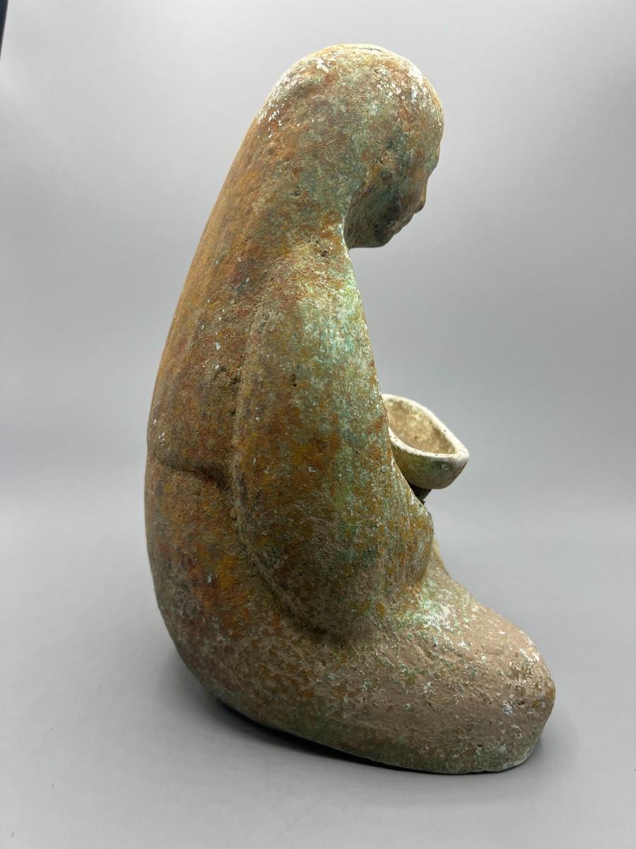 Weathered Stone Plaster Hollow Statue of Sitting Woman with Bowl