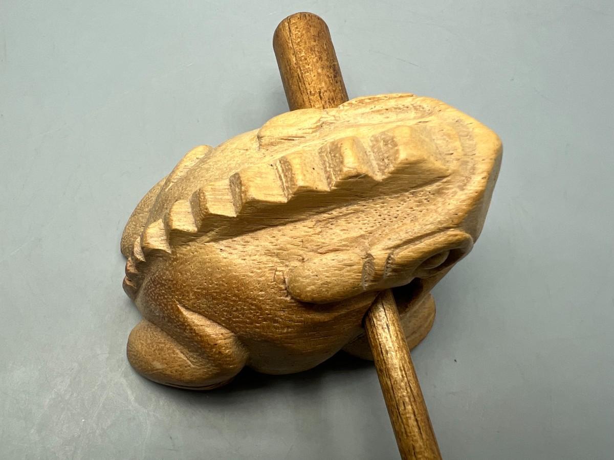There is no damage to the wood and in good useable condition. Works perfectly, sounds like a frog!