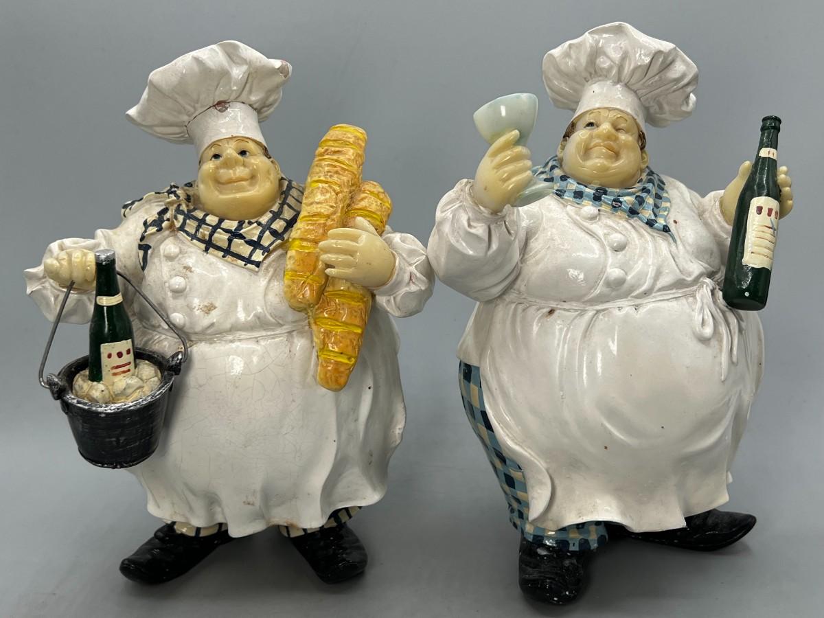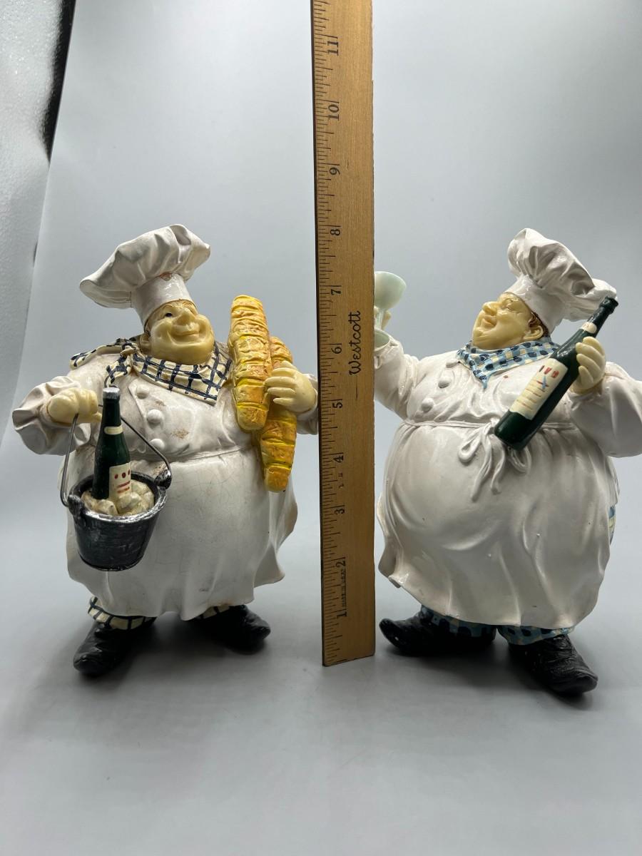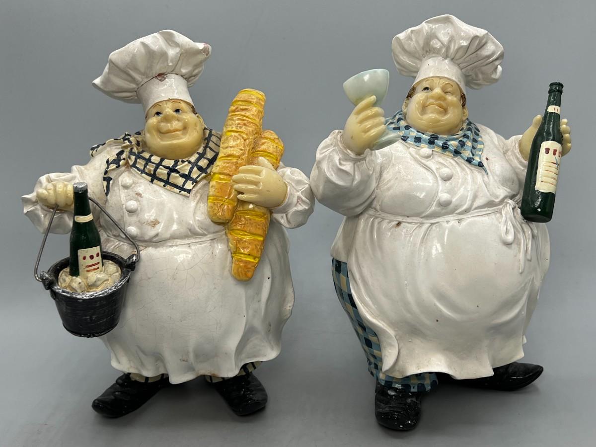 Pair of Round Chubby Kitchen Chef Polyresin Figurines Champagne Bucket & Wine Glass