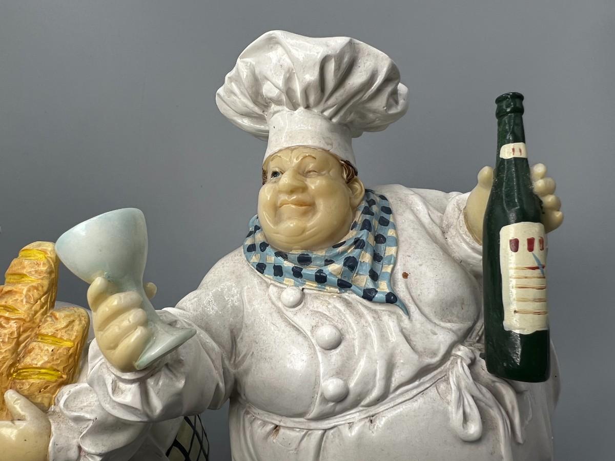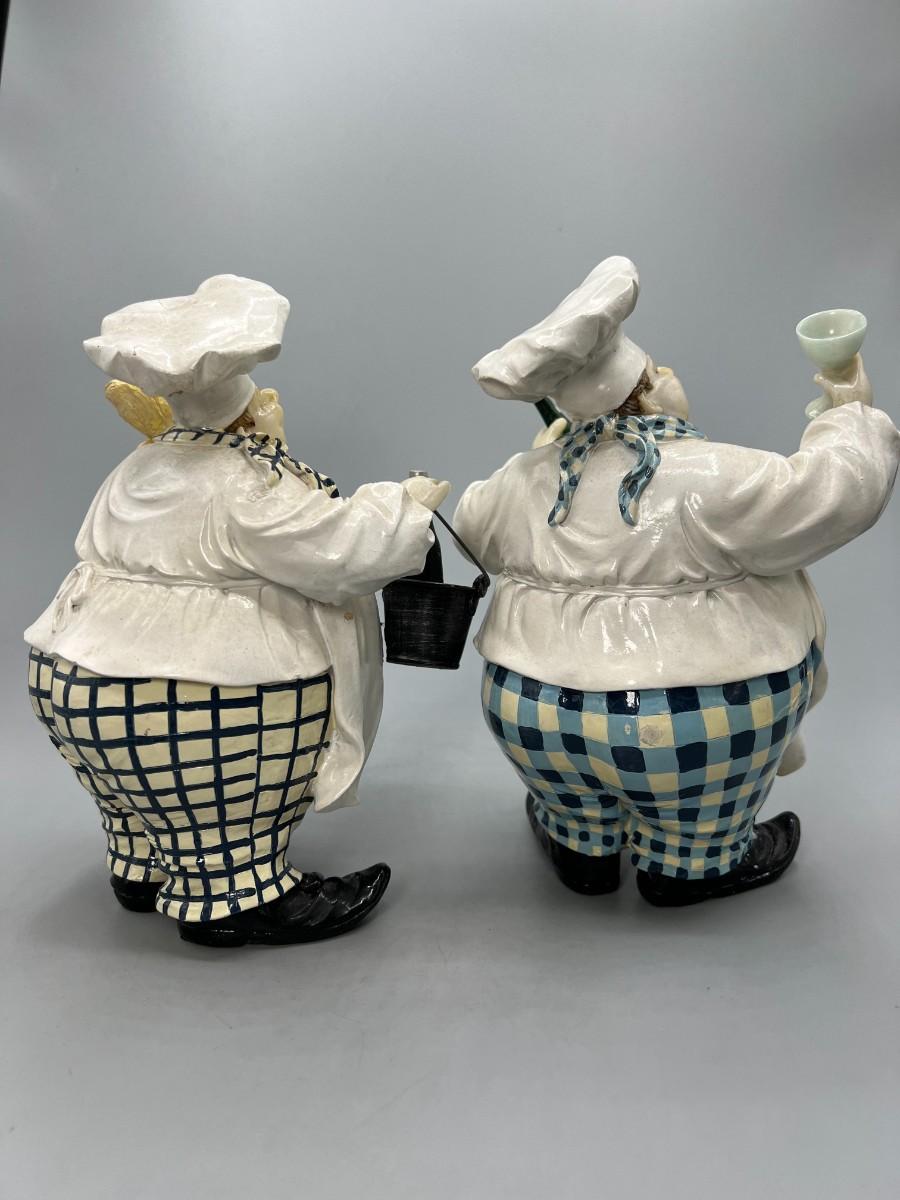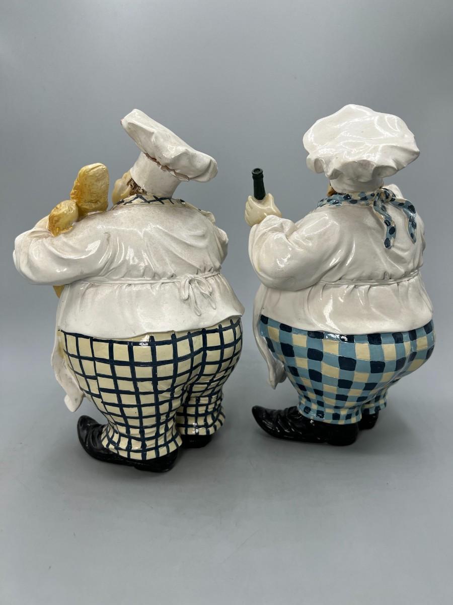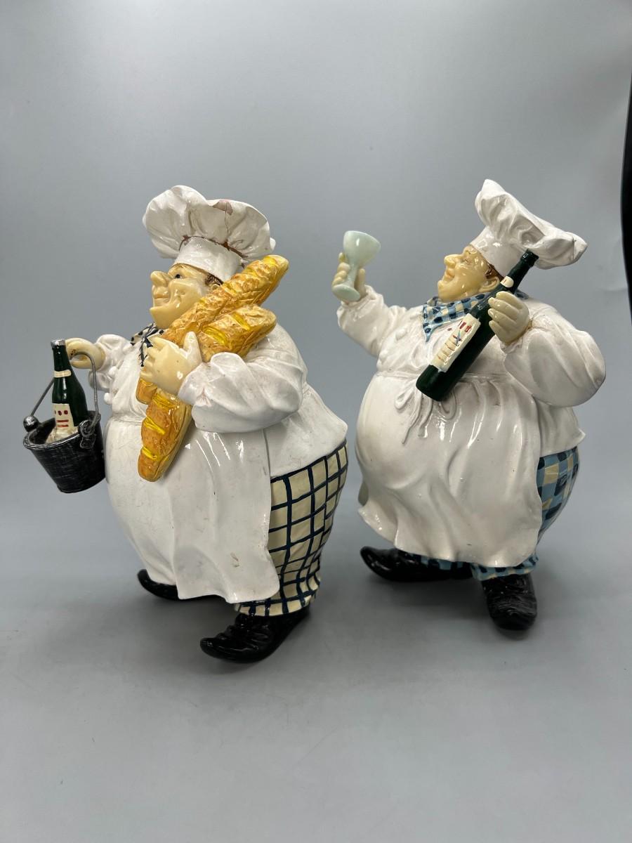 Pair of Round Chubby Kitchen Chef Polyresin Figurines Champagne Bucket & Wine Glass