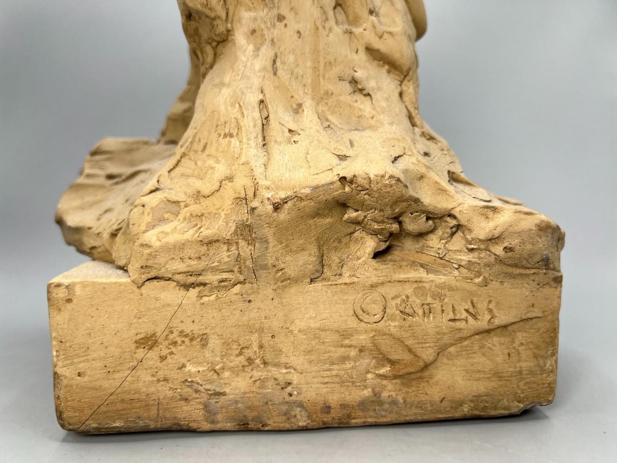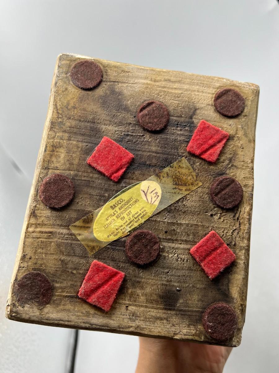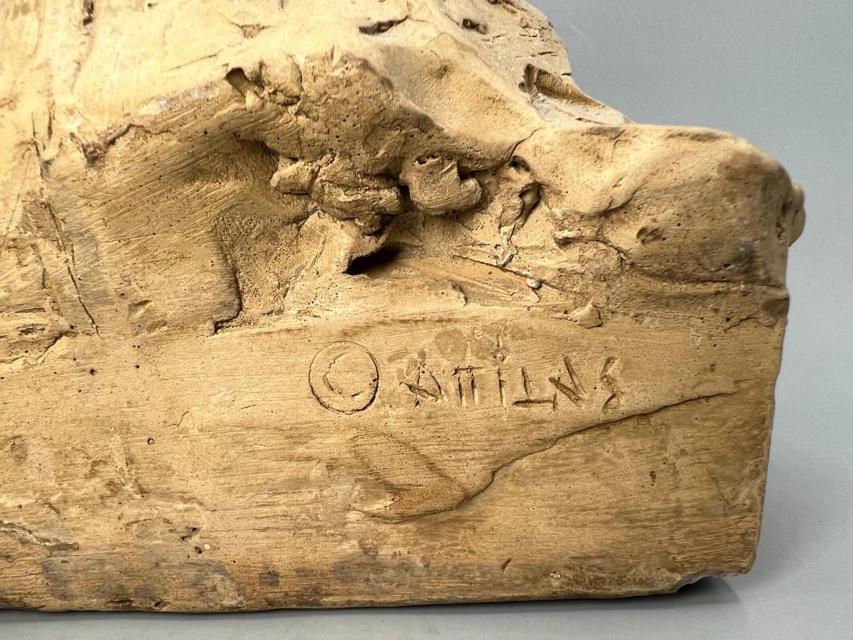 There is a tag tapped on the bottom that reads Basco Attila's Antiquity Italian Reproductions of Art. There is a light crack on the backside of the sculpture, but there is no other damage and in good condition.