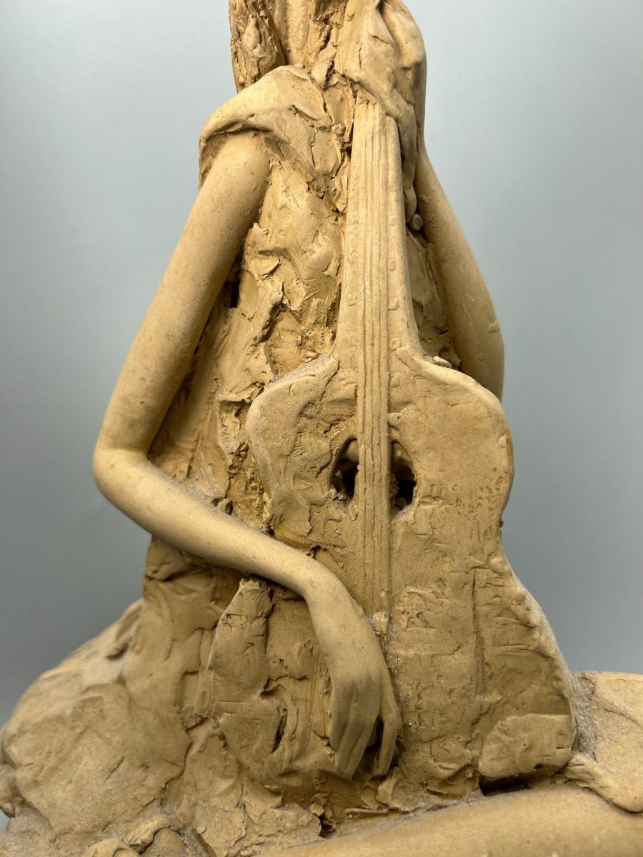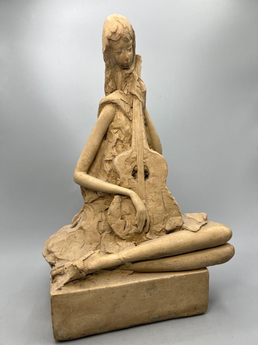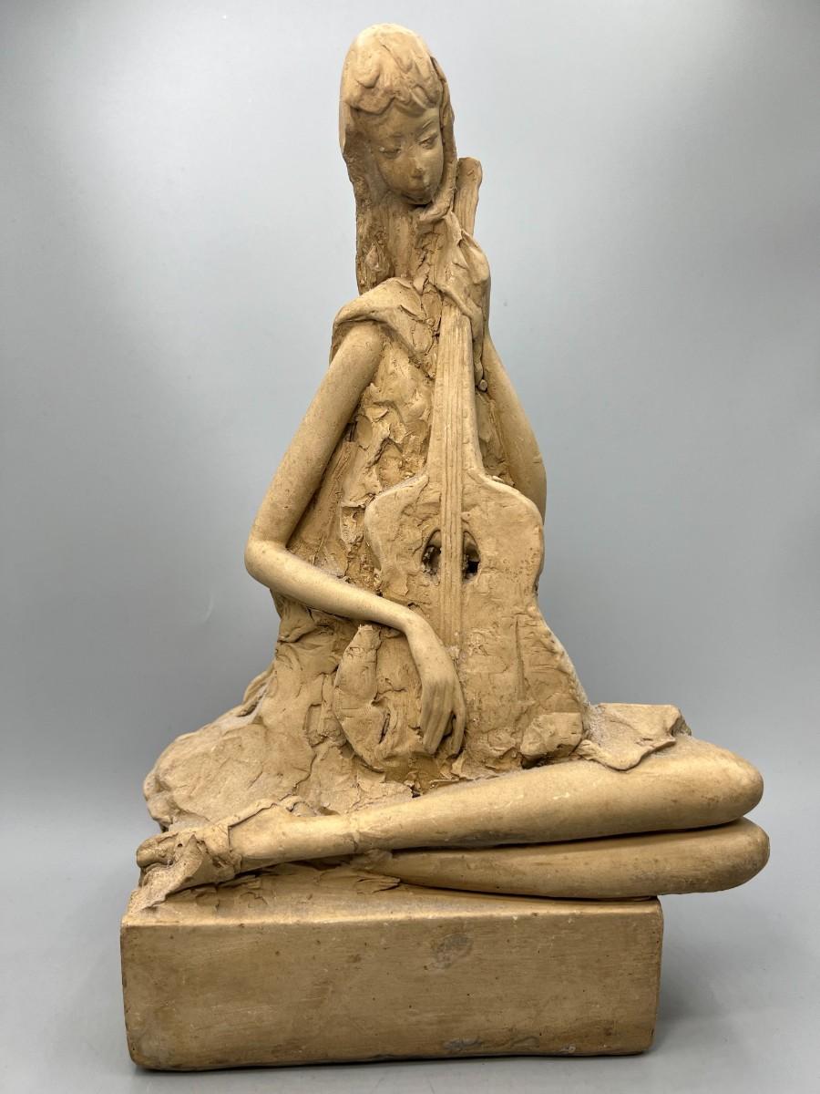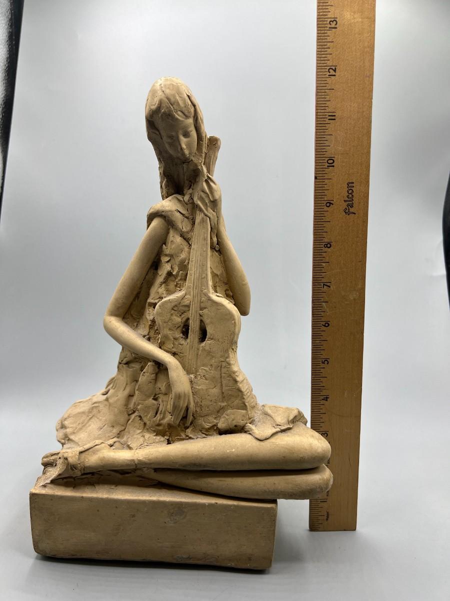 Vintage Abstract Cubist Art Clay Sculpture of Woman Playing Acoustic Guitar