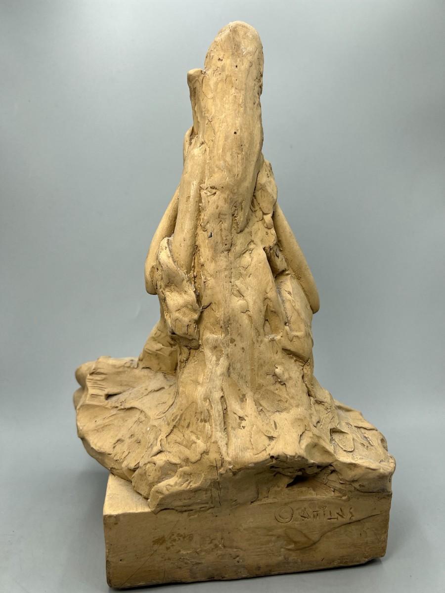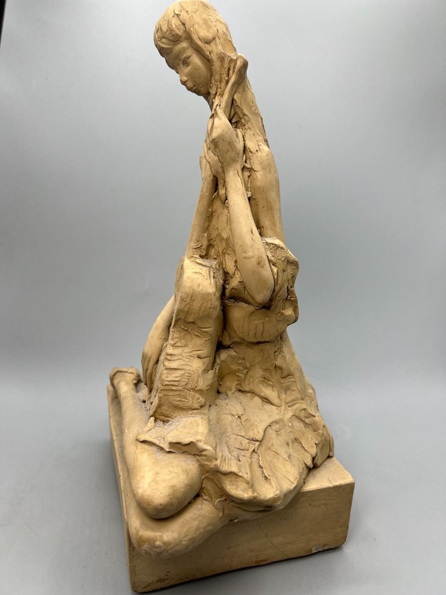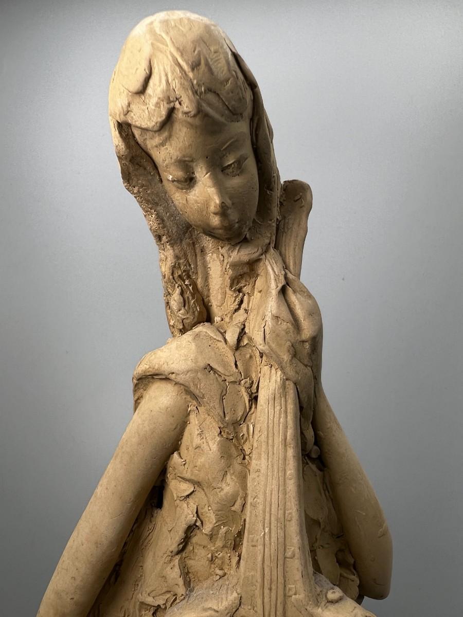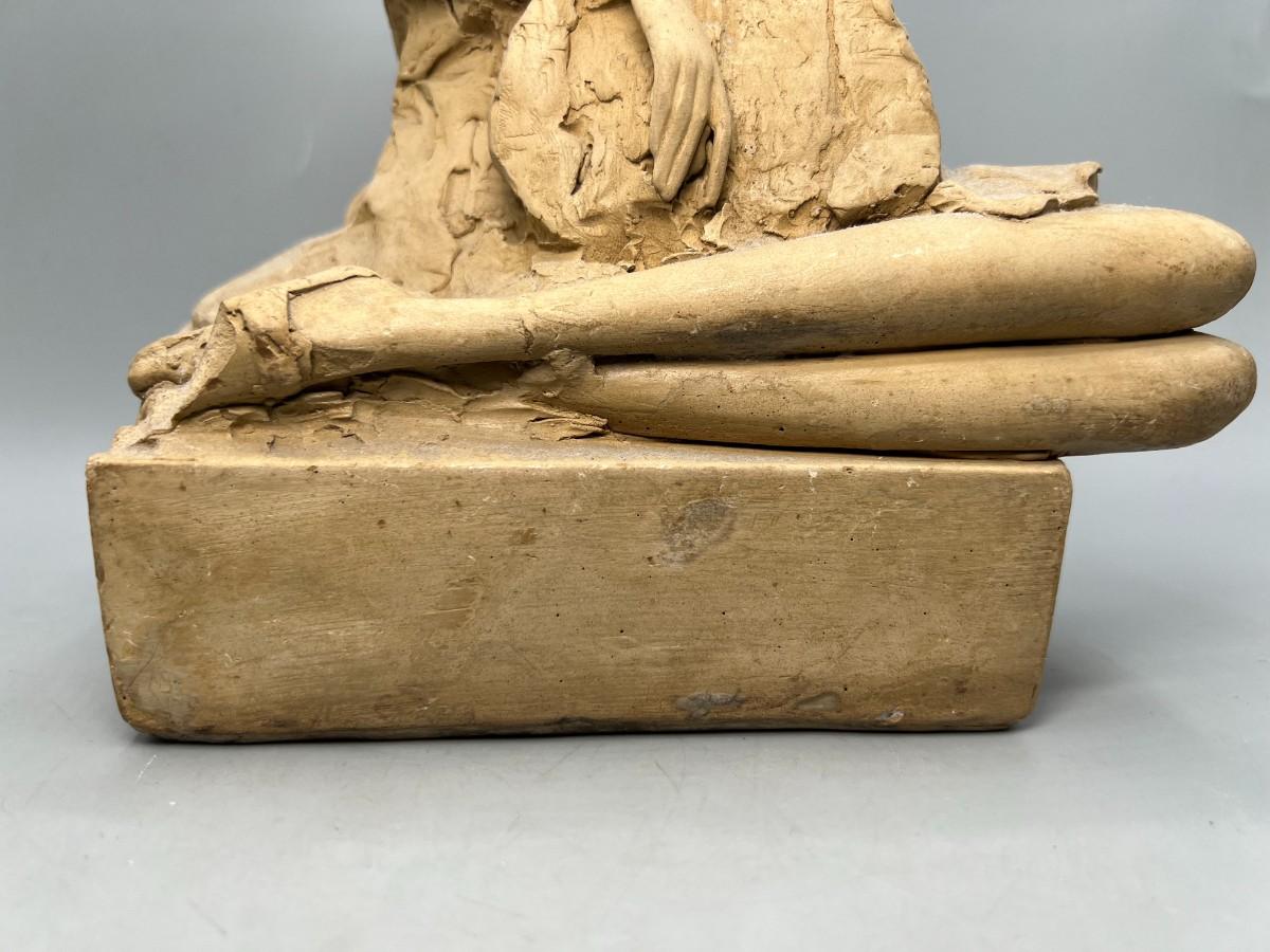 Vintage Abstract Cubist Art Clay Sculpture of Woman Playing Acoustic Guitar