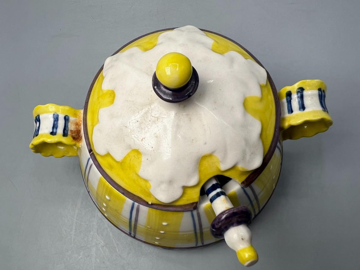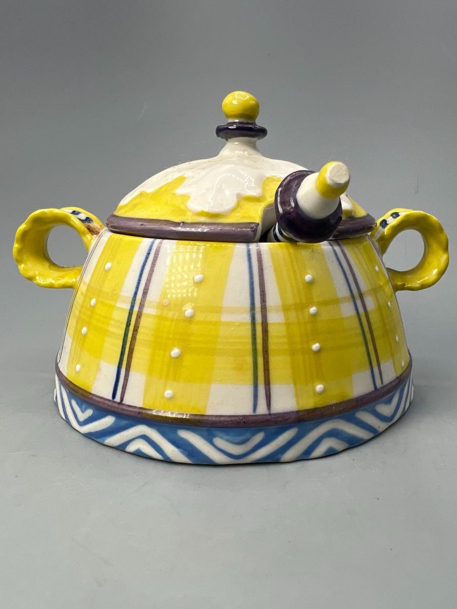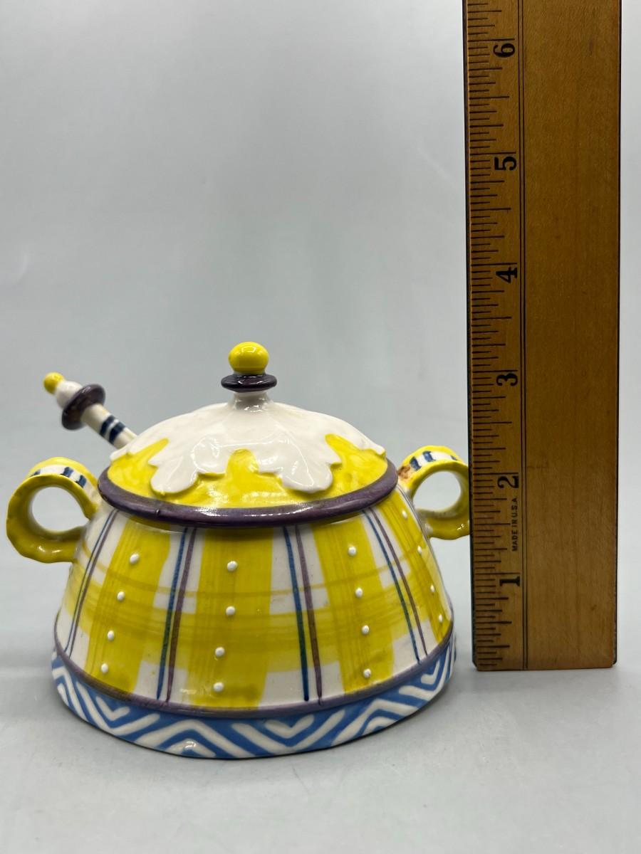 Ceramic Plaid Stripe Yellow Crimped Lidded Sugar Bowl