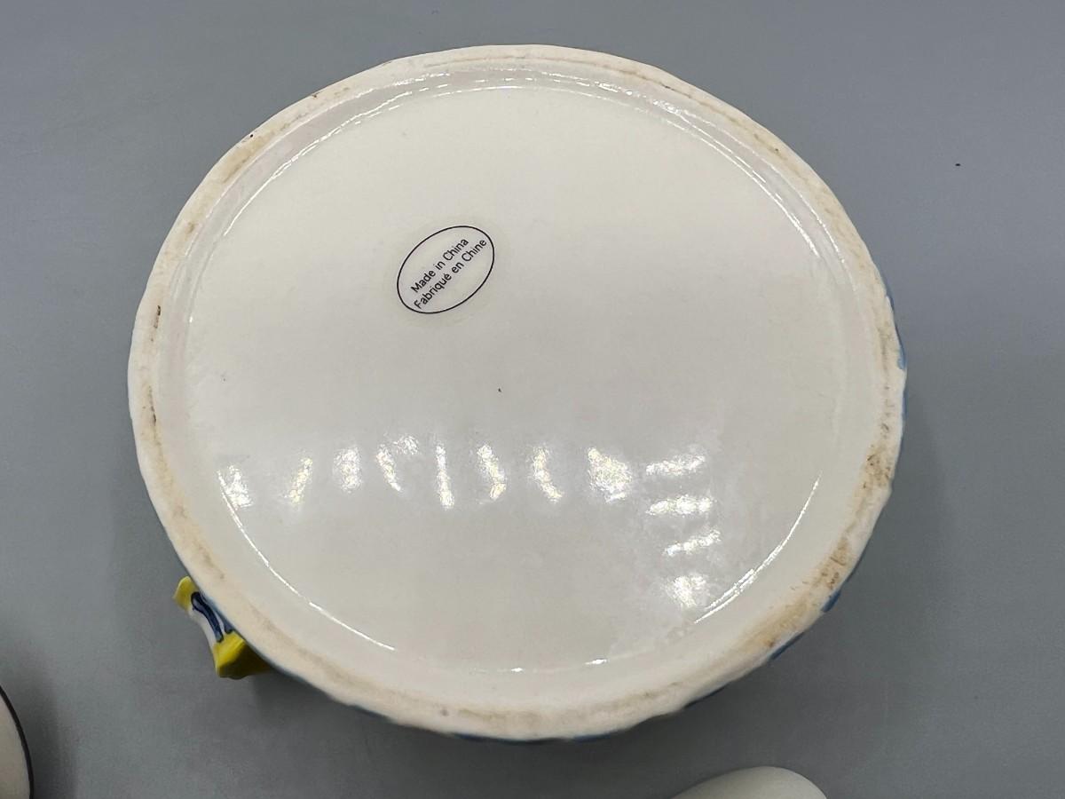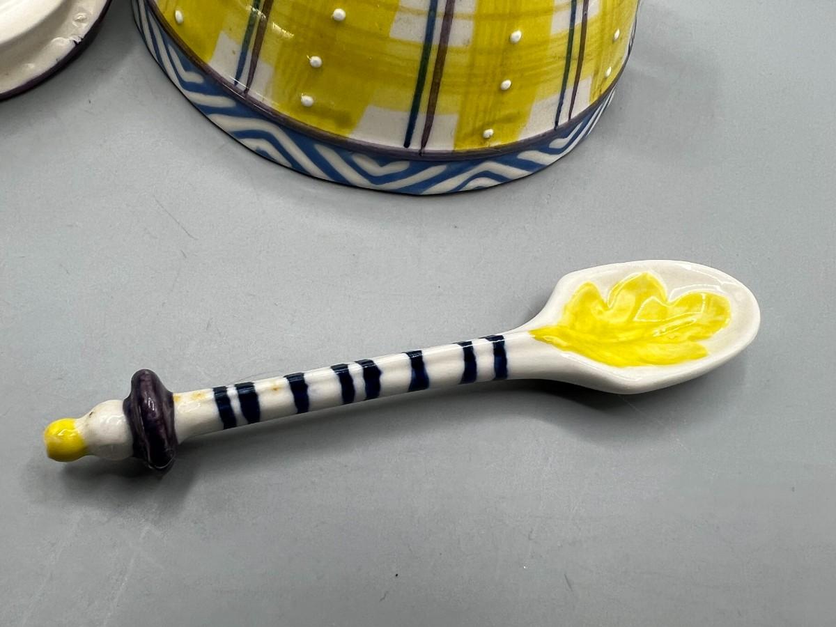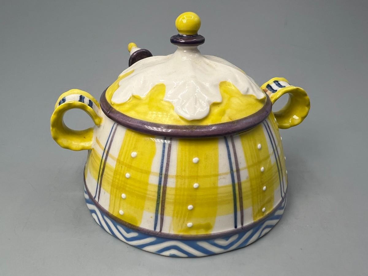 Ceramic Plaid Stripe Yellow Crimped Lidded Sugar Bowl