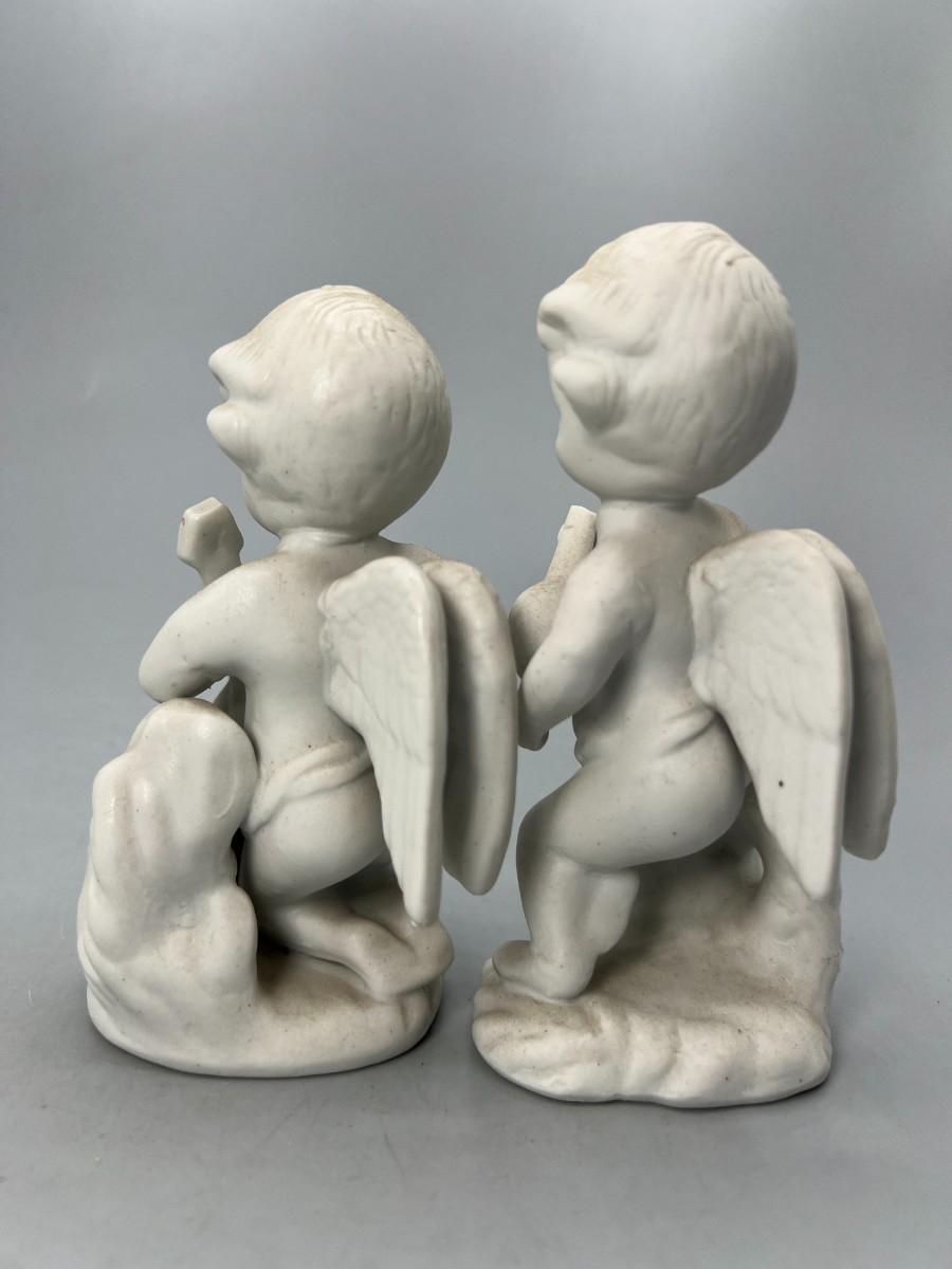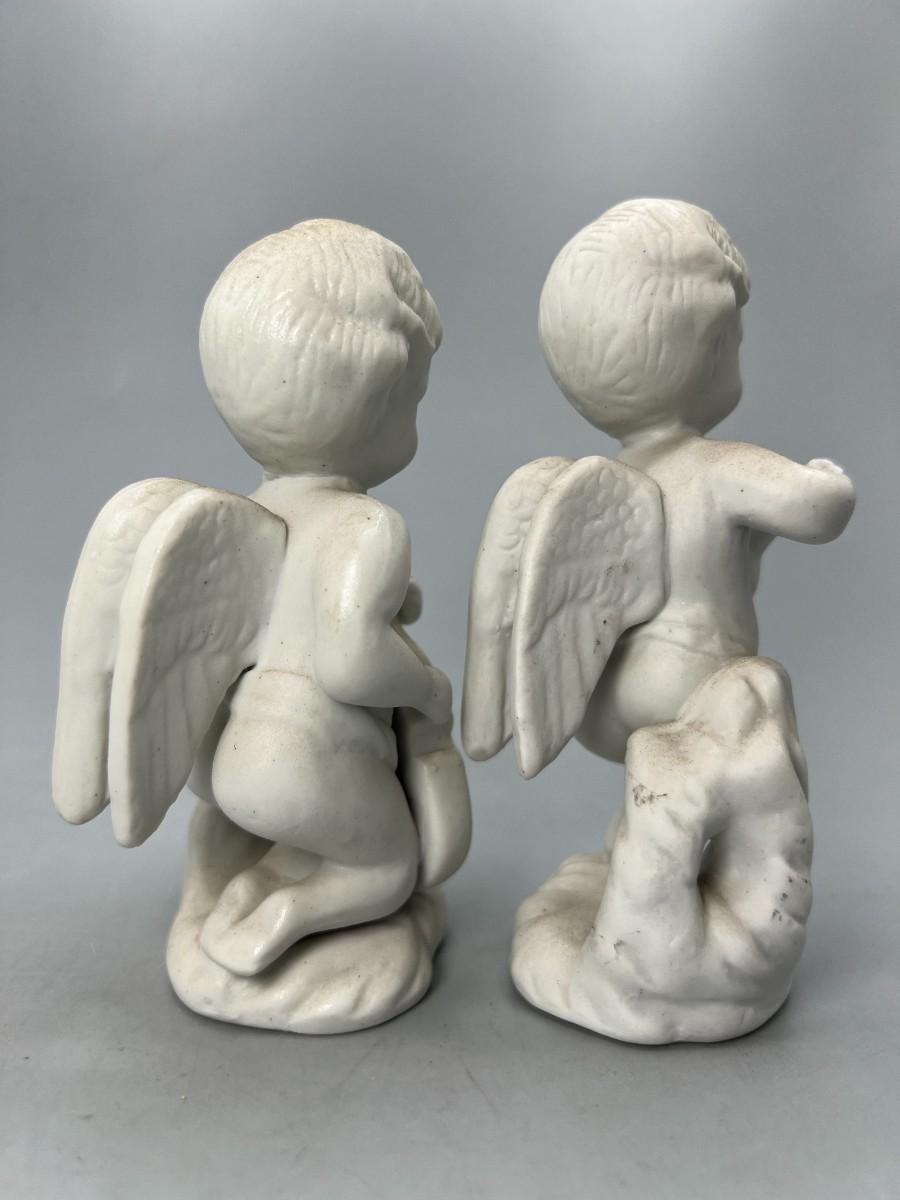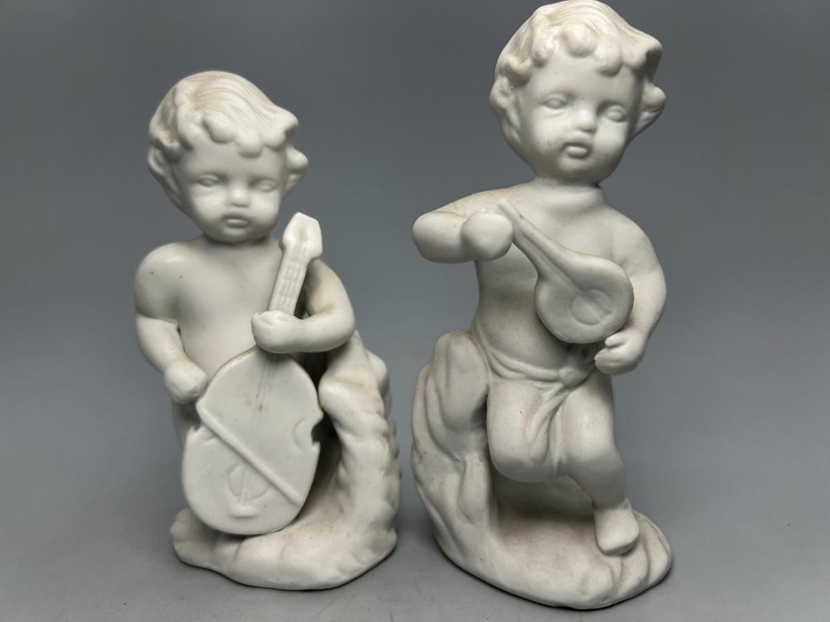 Pair of White Porcelain Ceramic Cherub Angels Playing Instruments Figurines. In good vintage condition. Previously displayed, may be dusty.