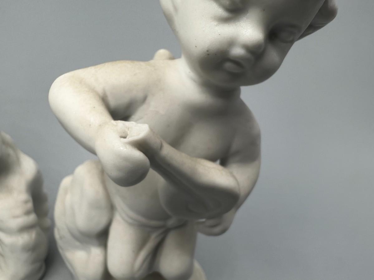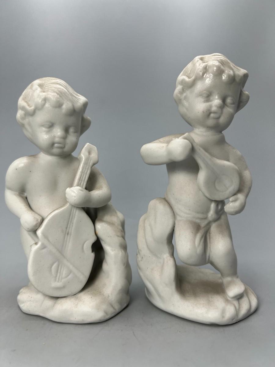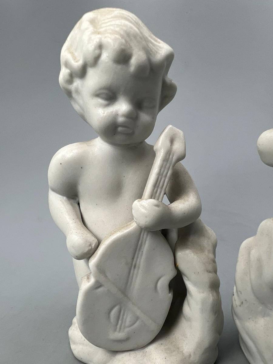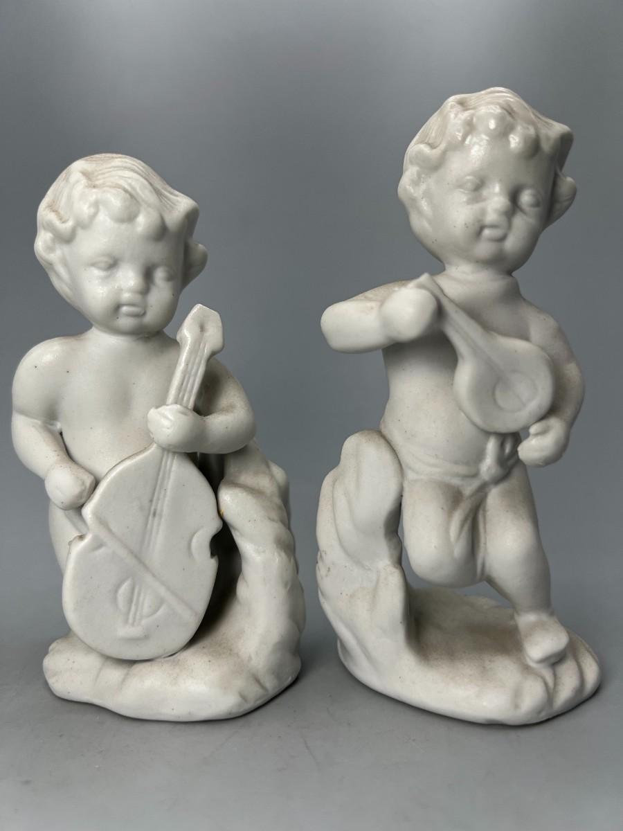 Pair of White Porcelain Ceramic Cherub Angels Playing Instruments Figurines. In good vintage condition. Previously displayed, may be dusty.