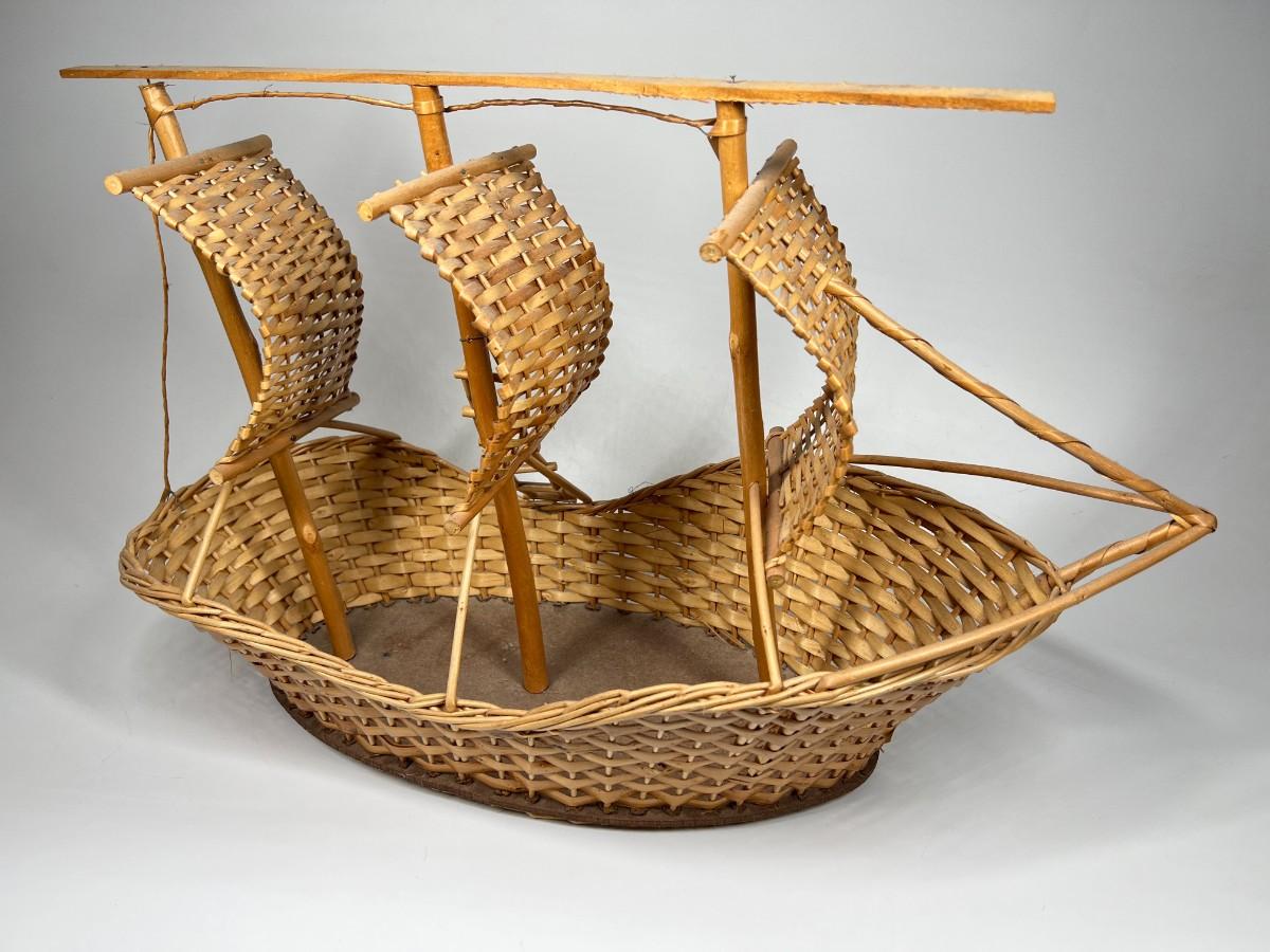Vintage Reed Woven Sailboat Sailing Ship Boat Basket Made in Portugal. In good condition. About 24" size.