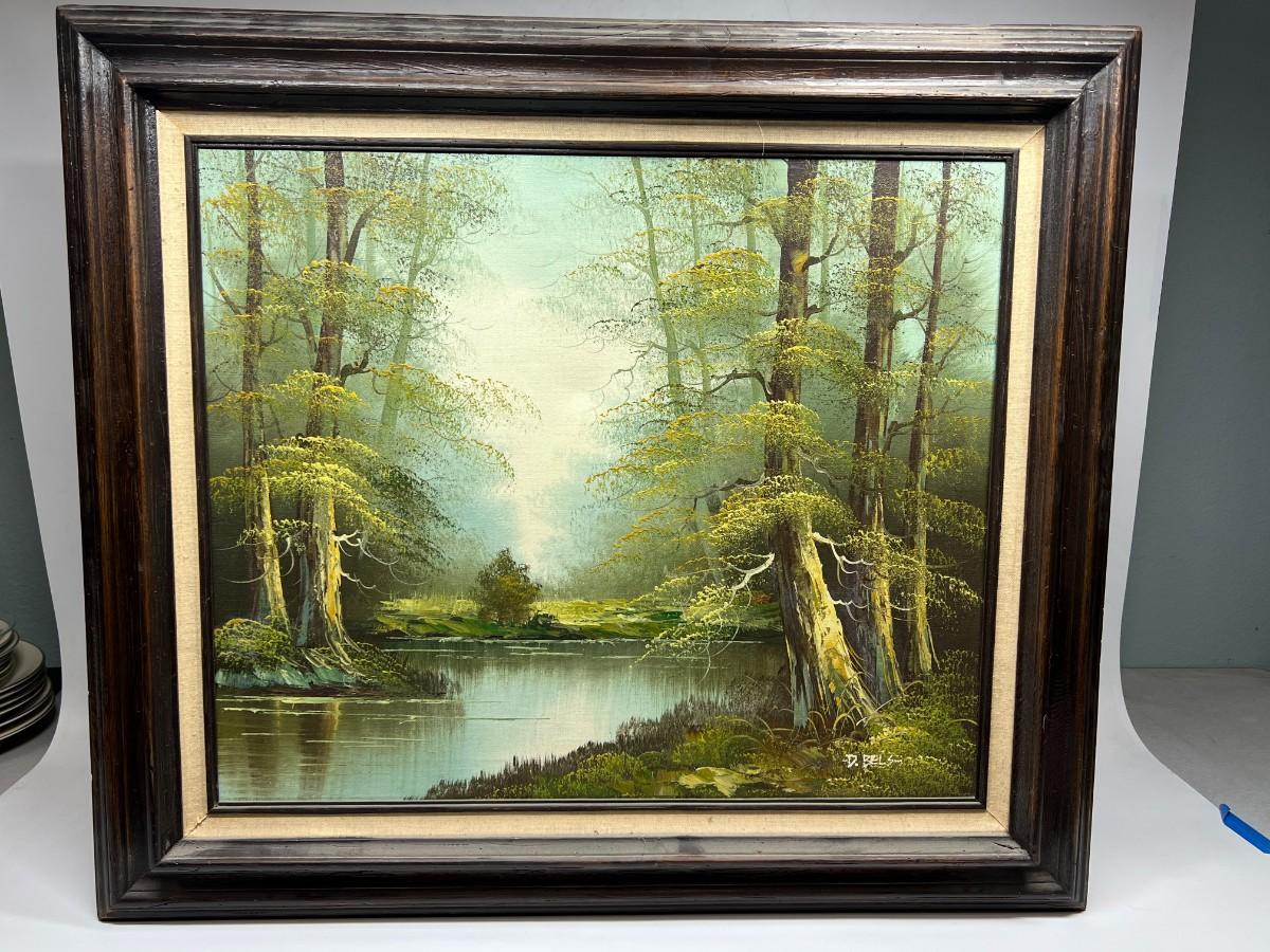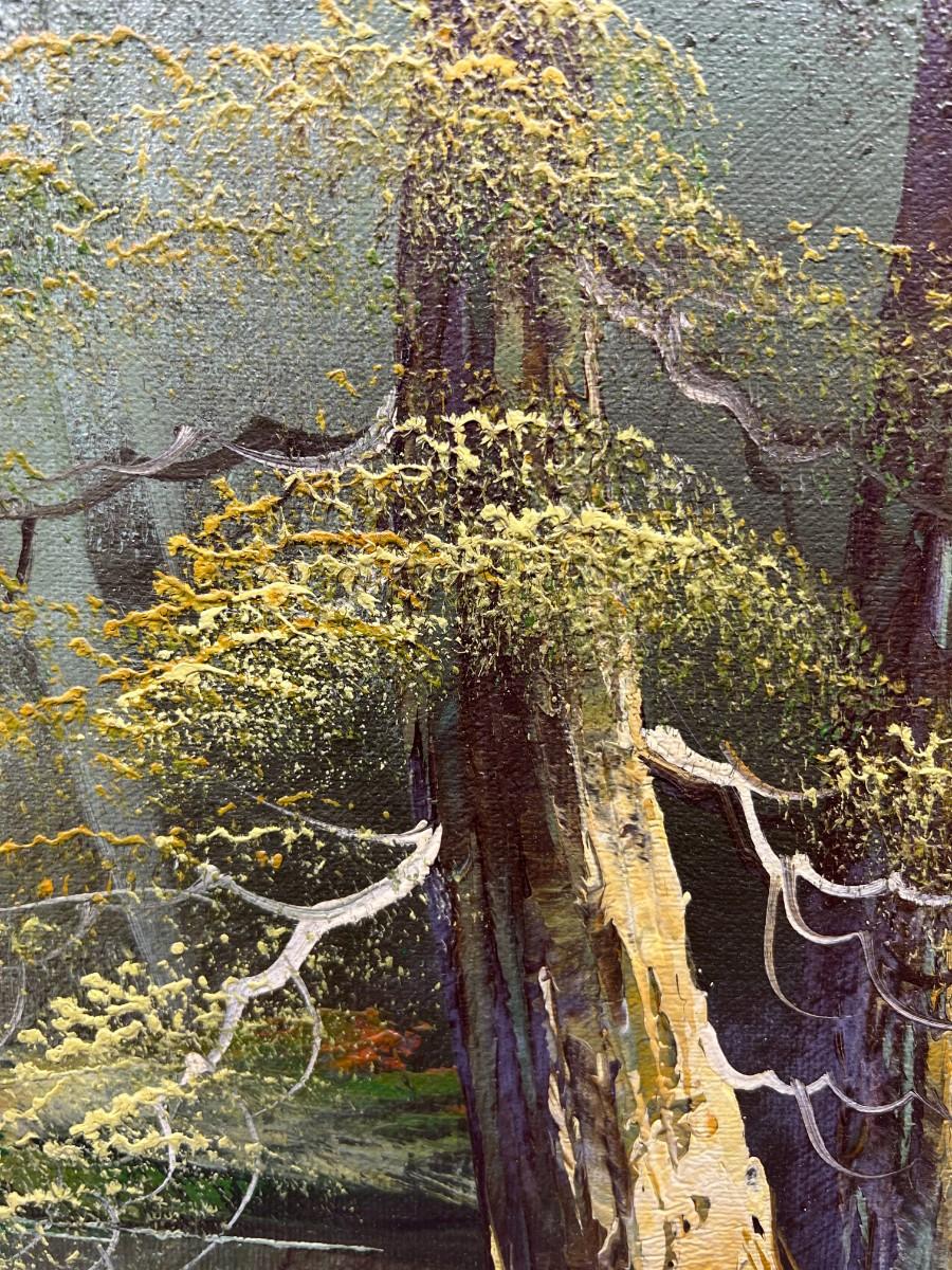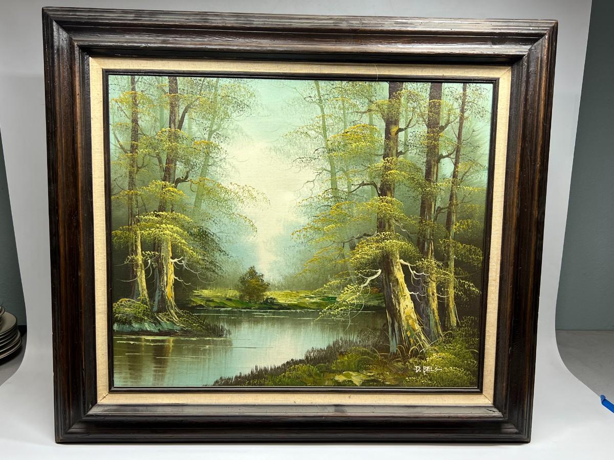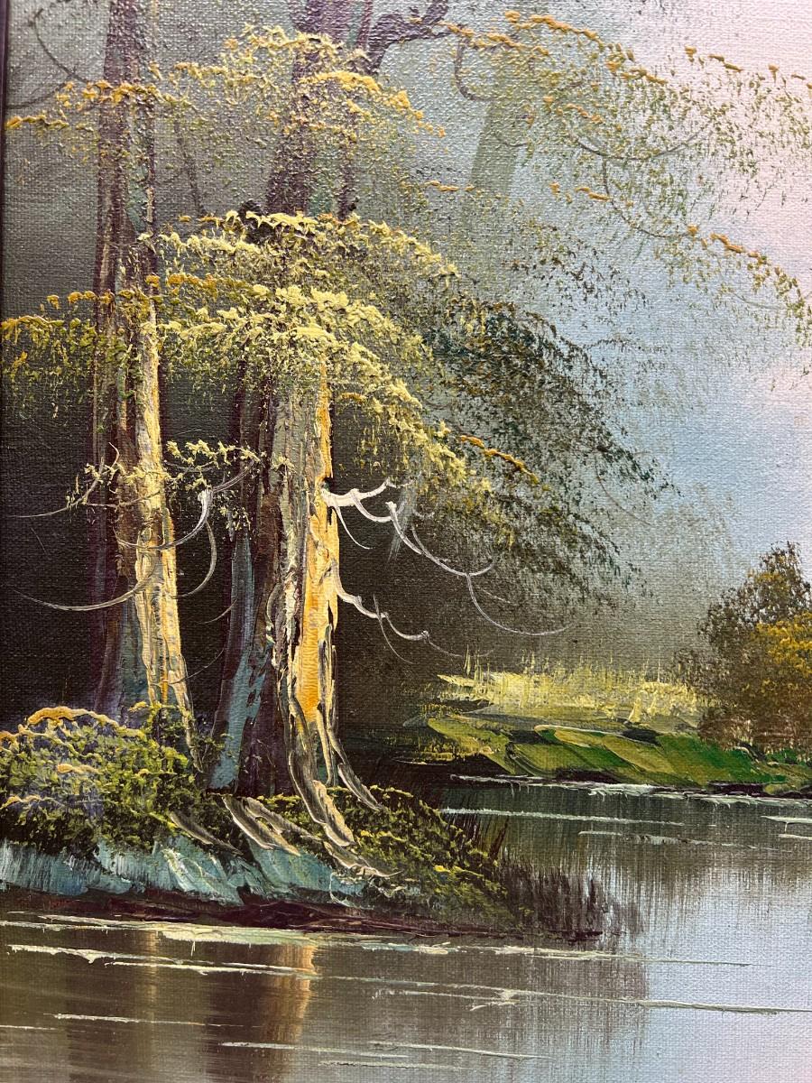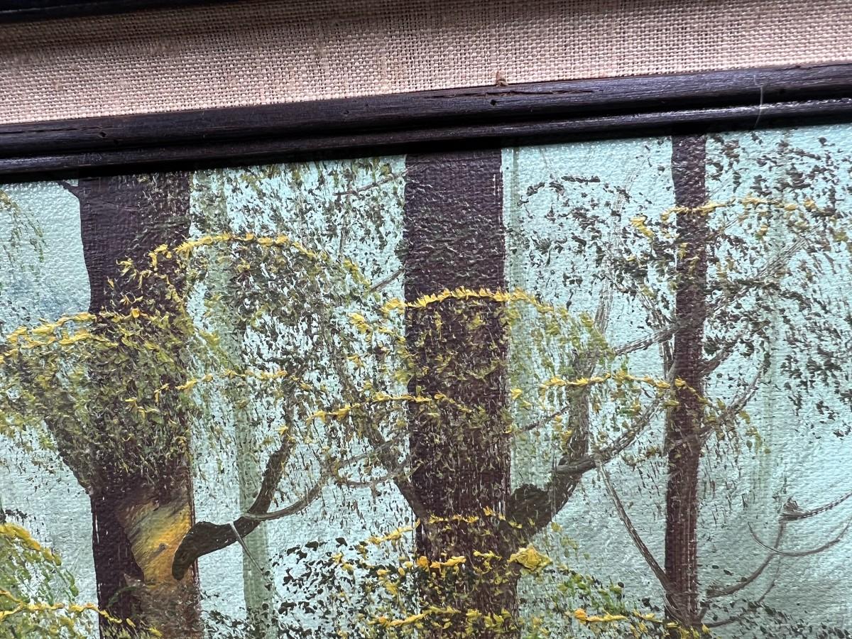 Vintage Springtime Trees Along Creek Oil Painting Artist Signed. In good condition. Canvas size is 20x24.