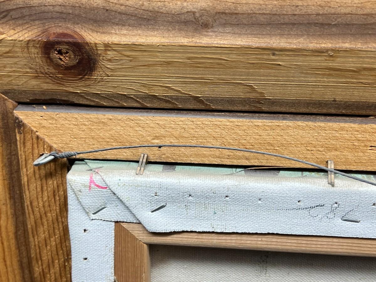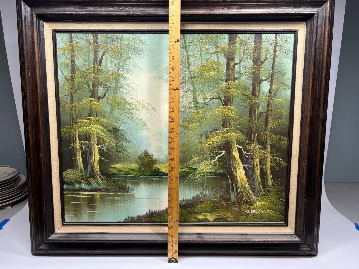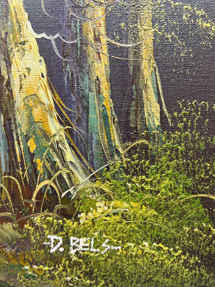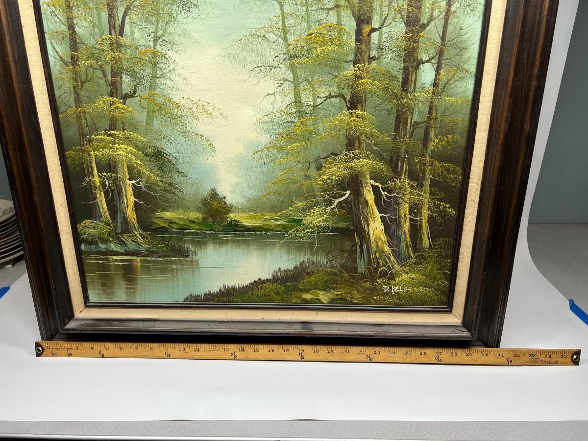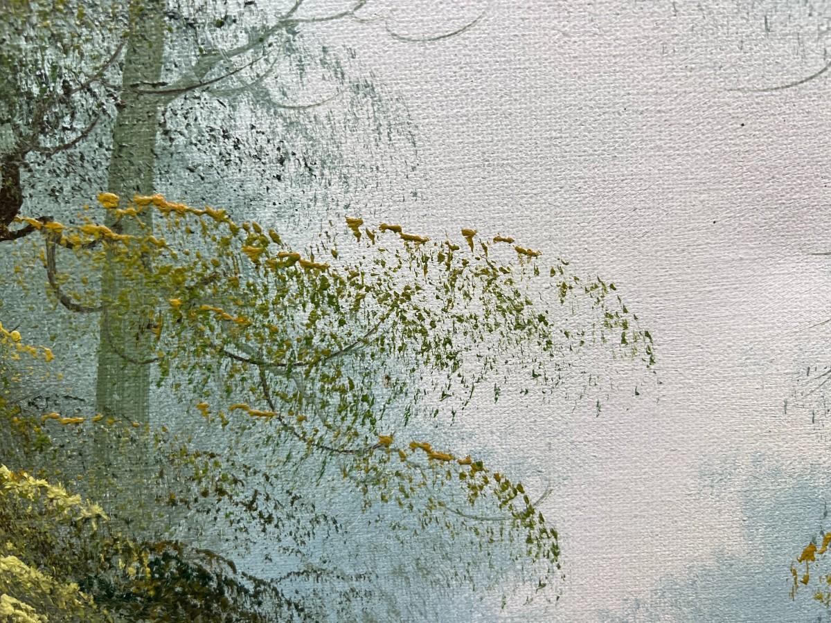 Vintage Springtime Trees Along Creek Oil Painting Artist Signed. In good condition. Canvas size is 20x24.