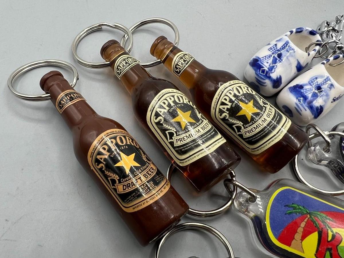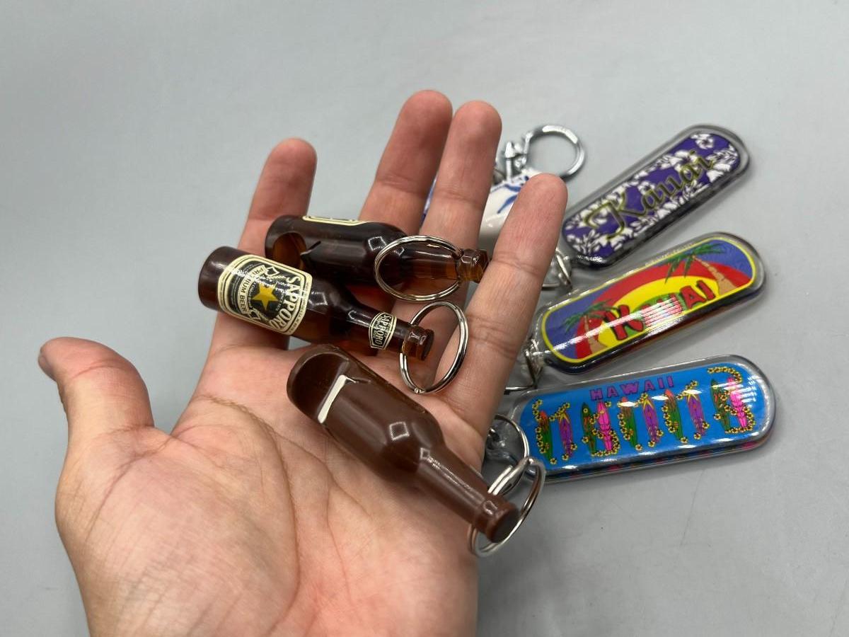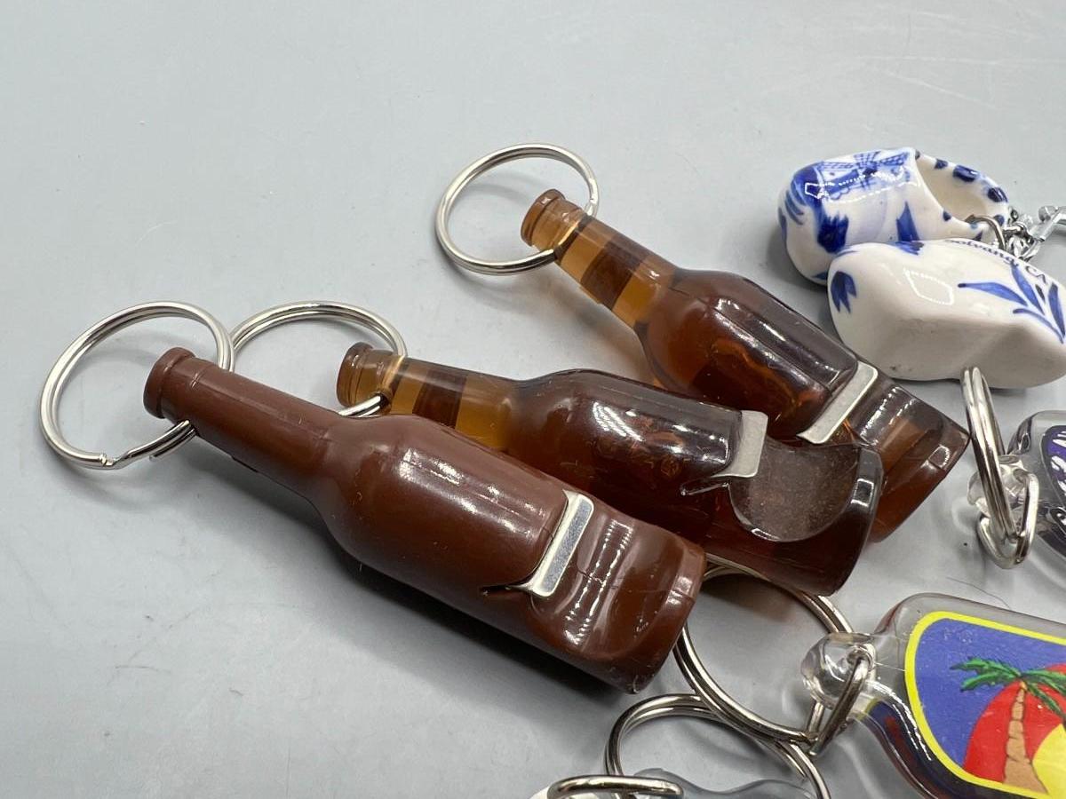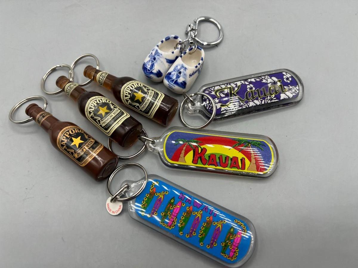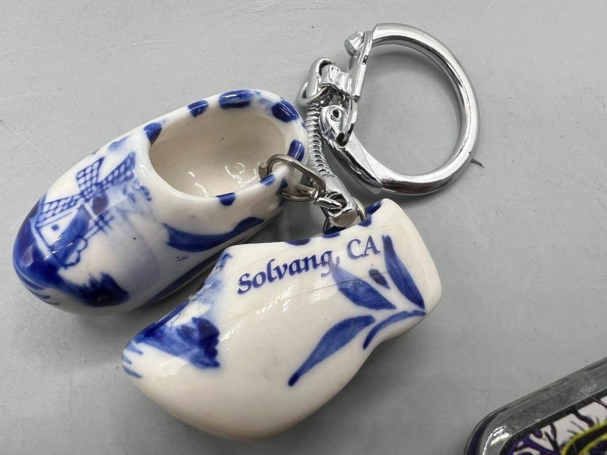 Lot of Novelty Key Chains, Beer Bottle Opener, Solvang Souvenir Clogs, & More