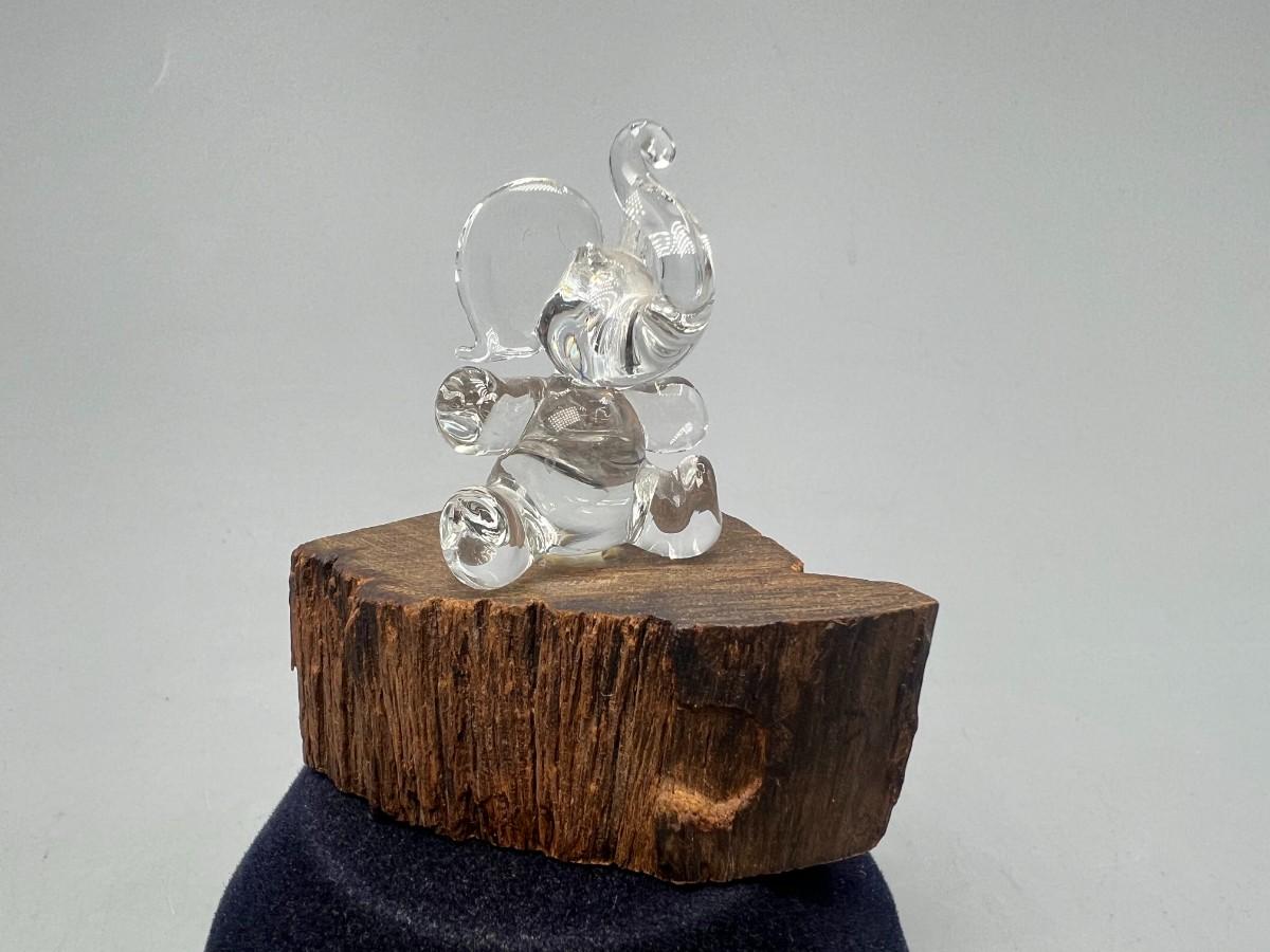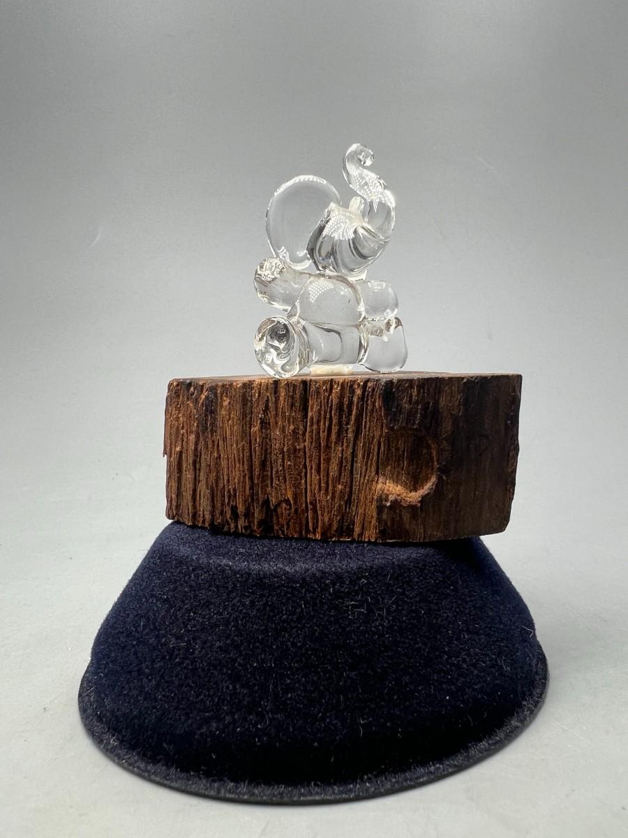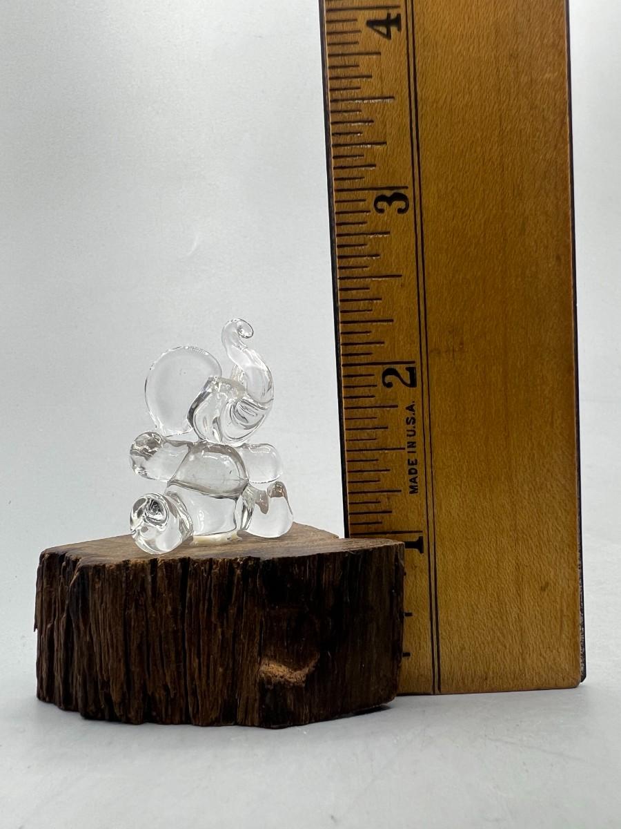 Small Trinket Cute Glass Sculptural Elephant Sitting on Piece of Wood