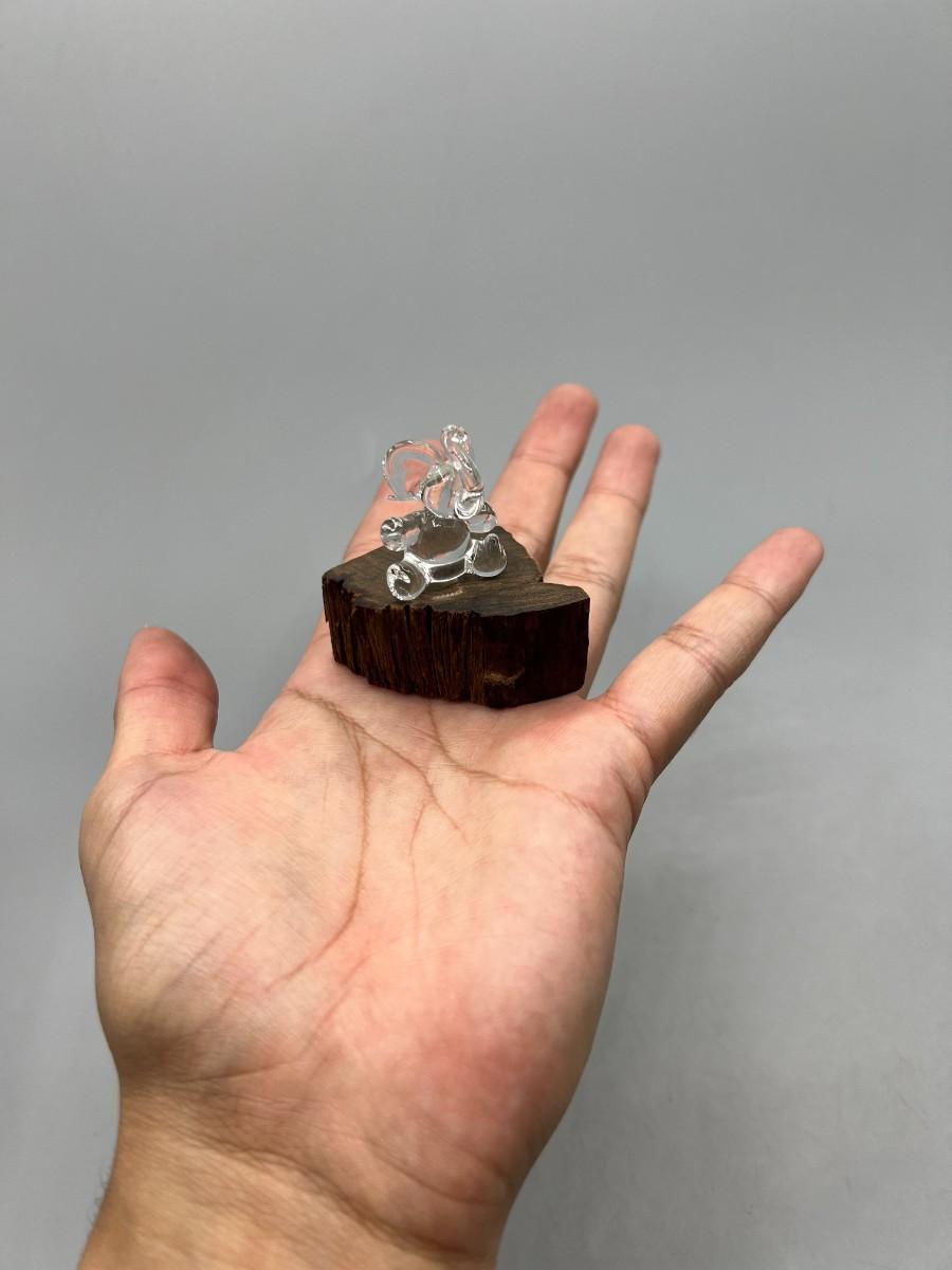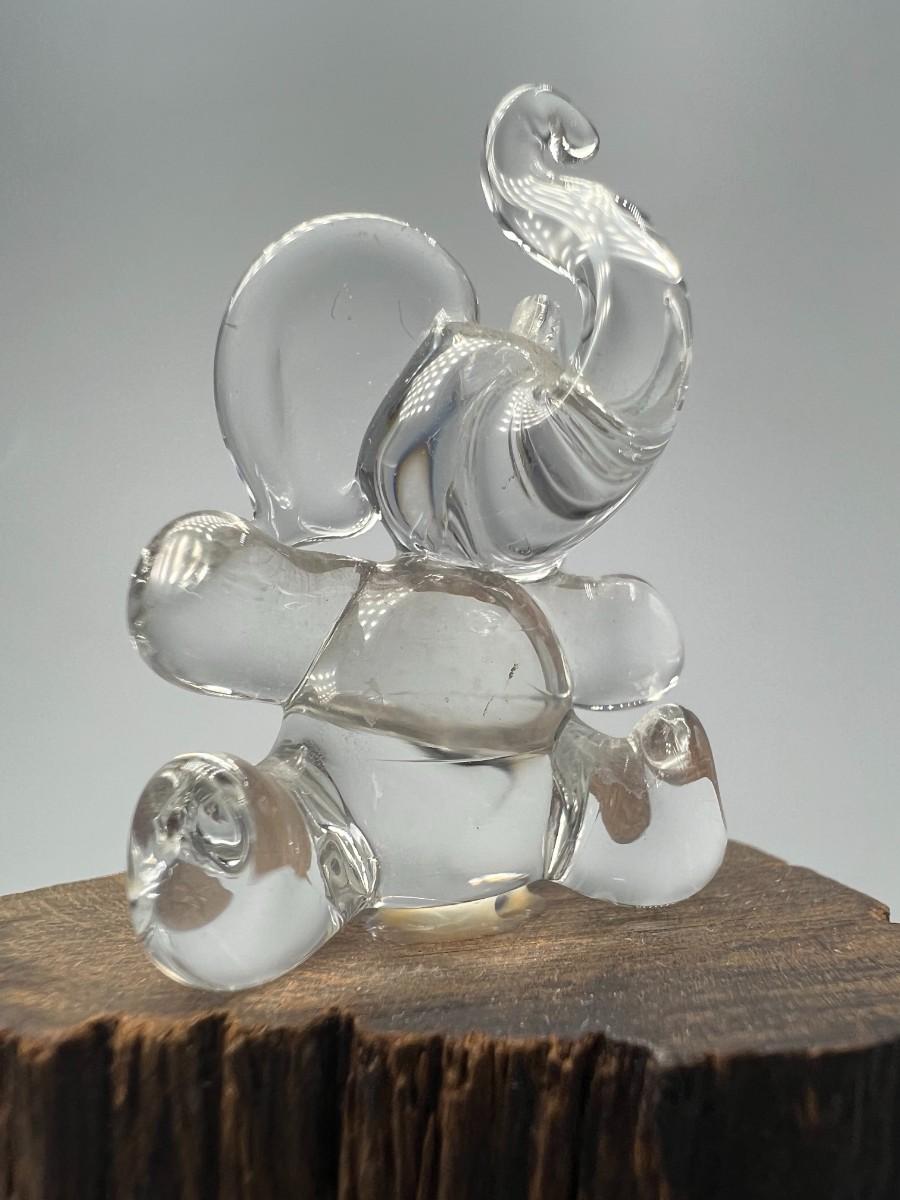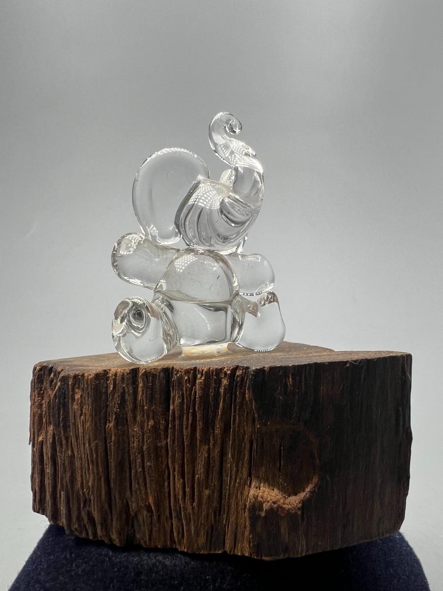 Small Trinket Cute Glass Sculptural Elephant Sitting on Piece of Wood