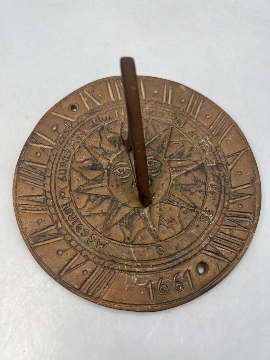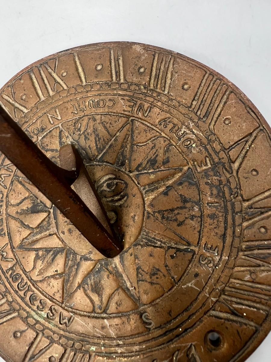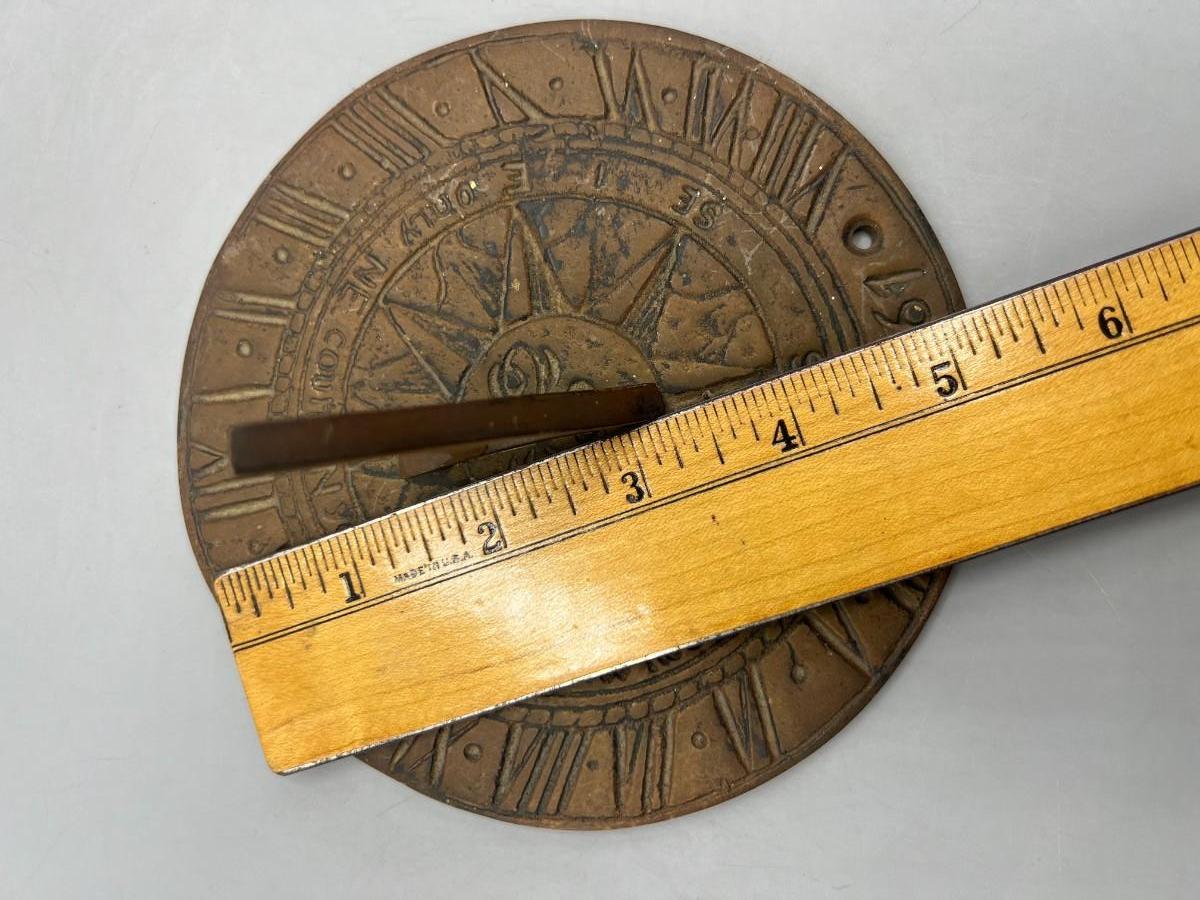 There is no damage to the metal sun dial and is in good collectible or displayable condition. Check pictures for more details and sizing.