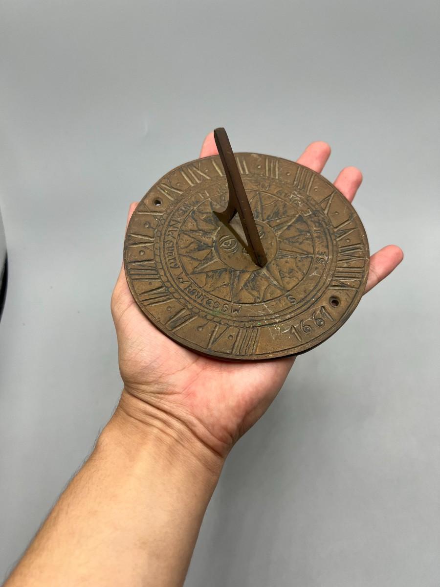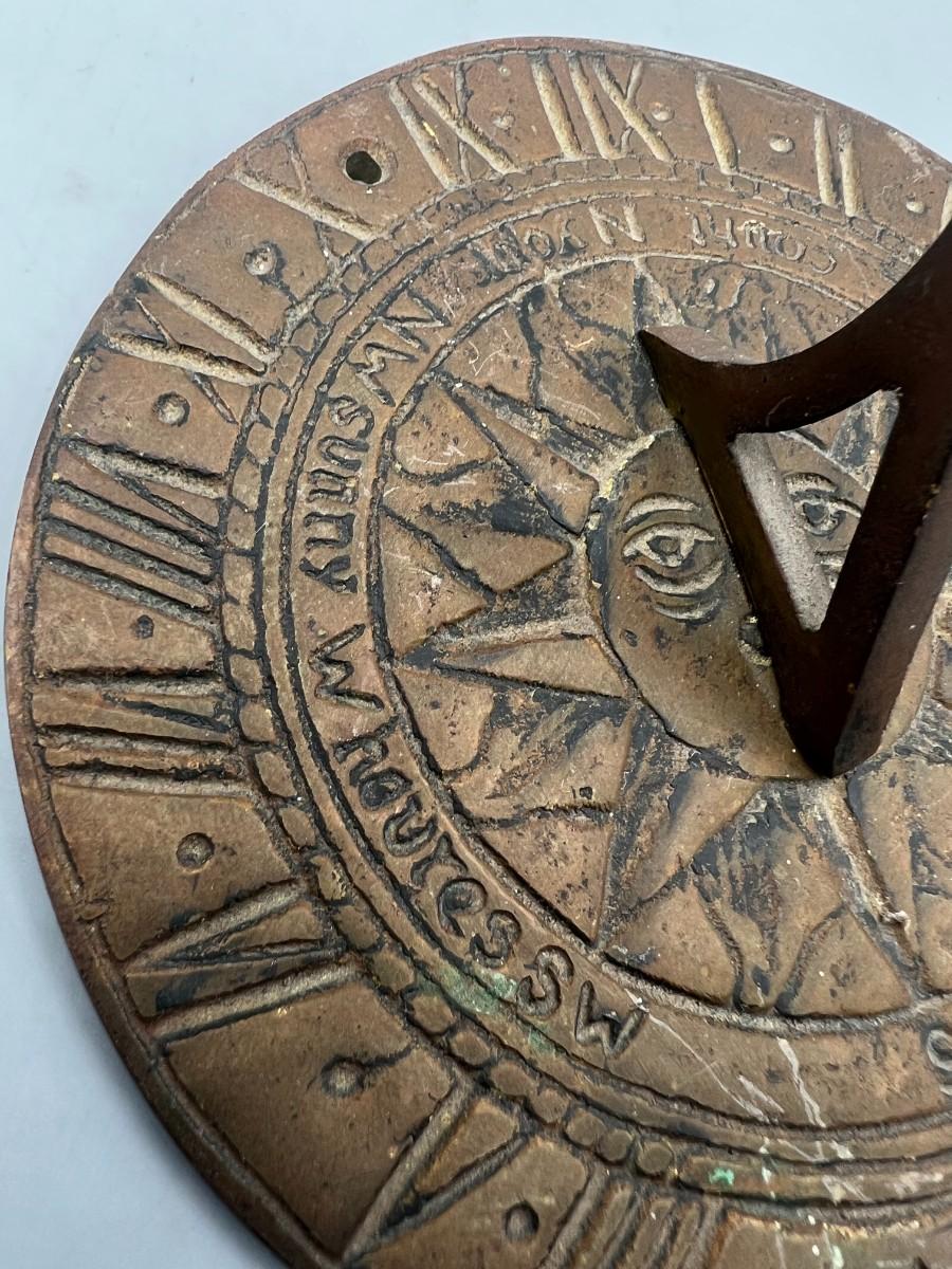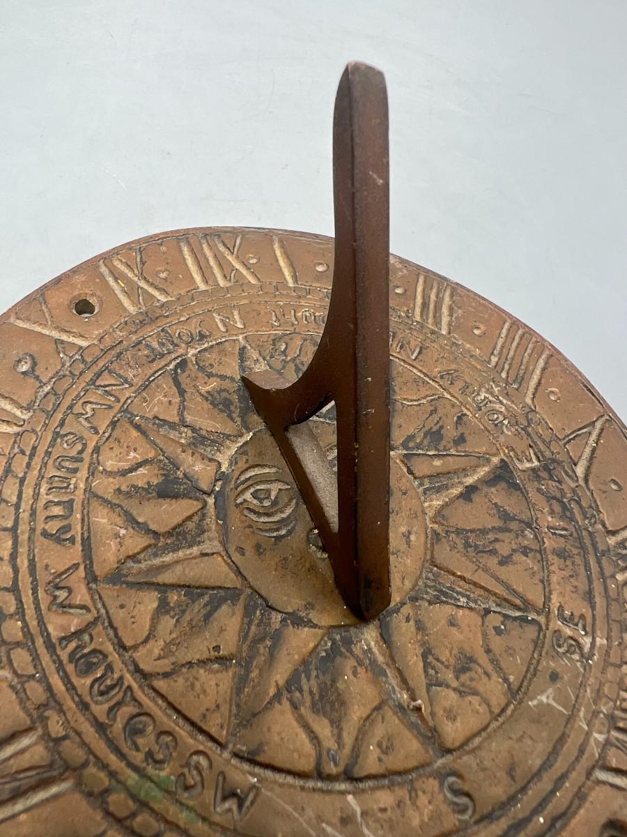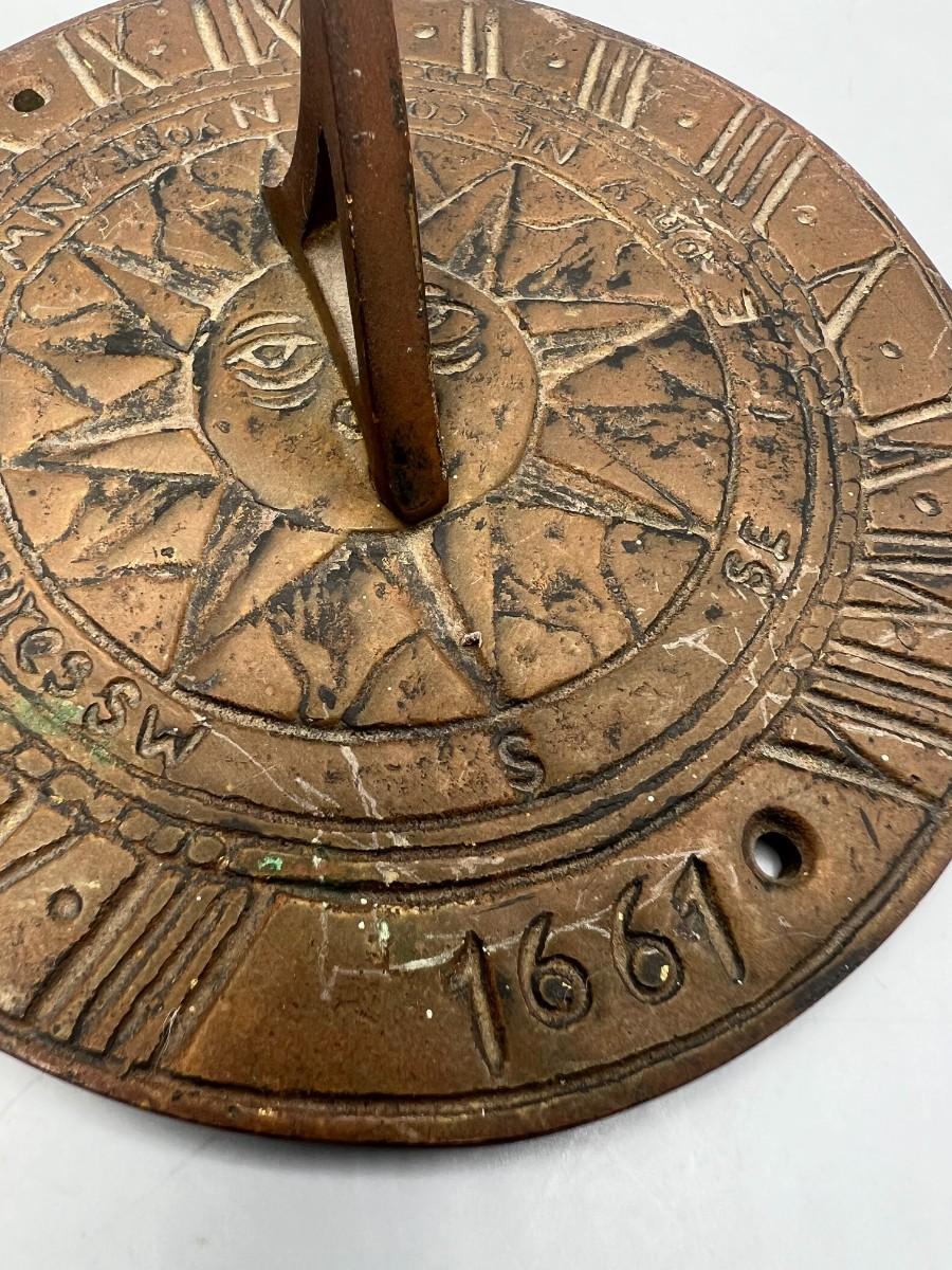 There is no damage to the metal sun dial and is in good collectible or displayable condition. Check pictures for more details and sizing.