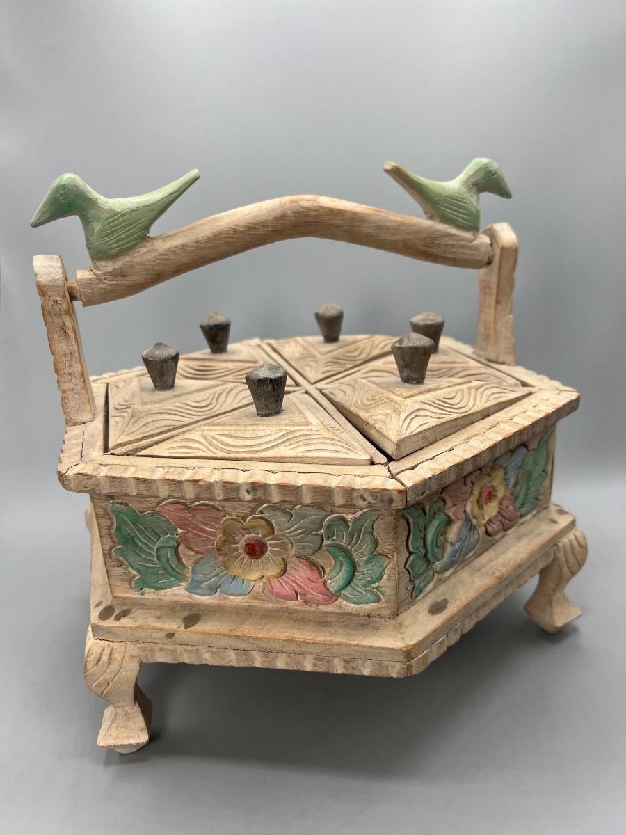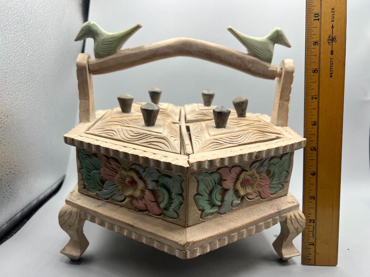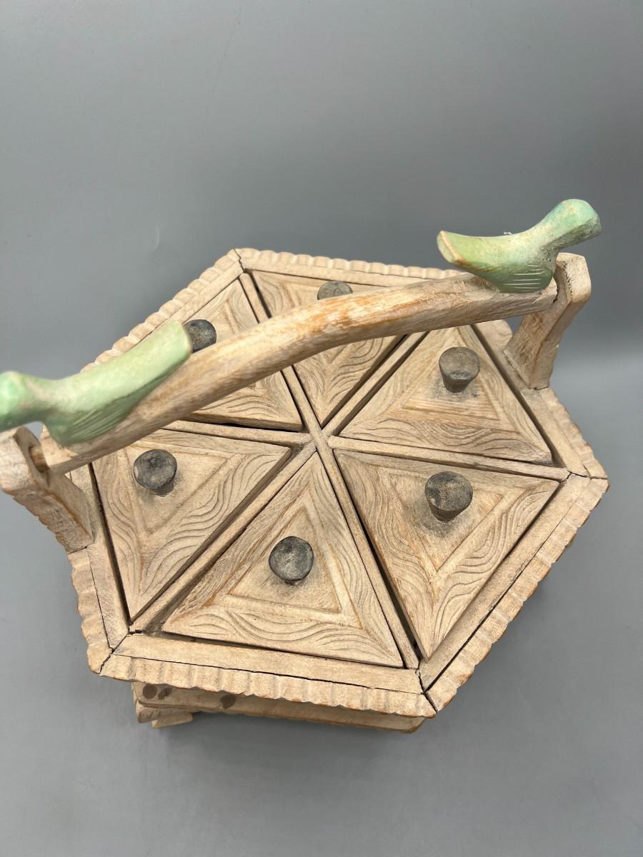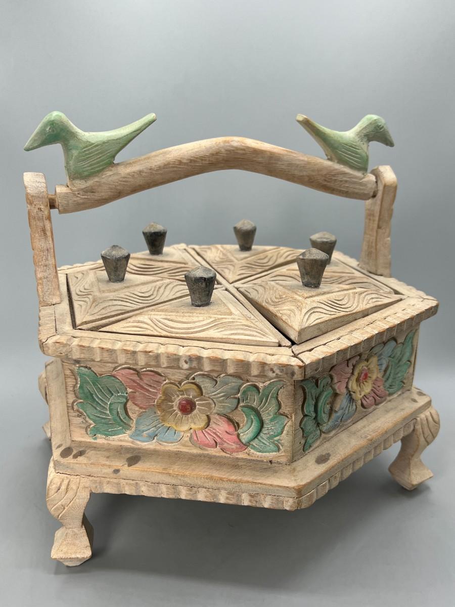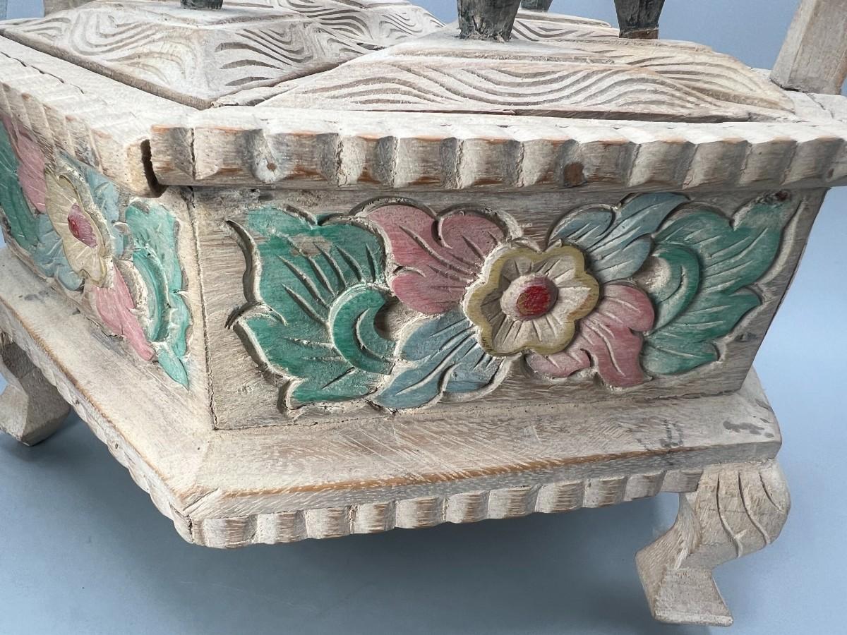 Carved Wooden Hexagon Flower Motif Divided Lidded Tea Ingredient Organizer