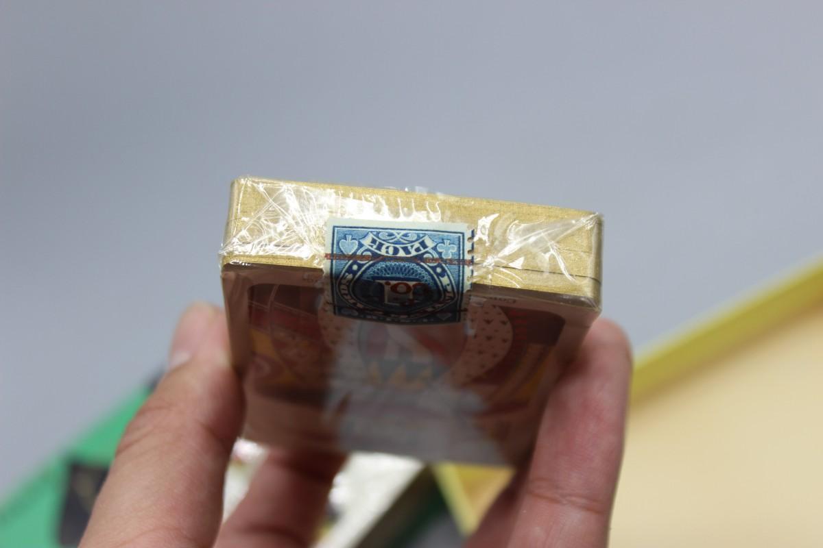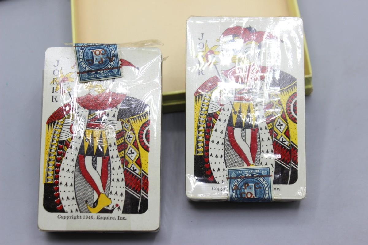 One of the cards is open but has not been fully removed from the plastic wrapping, the other card deck has not been opened and is still sealed by the original stamp. In overall good condition.