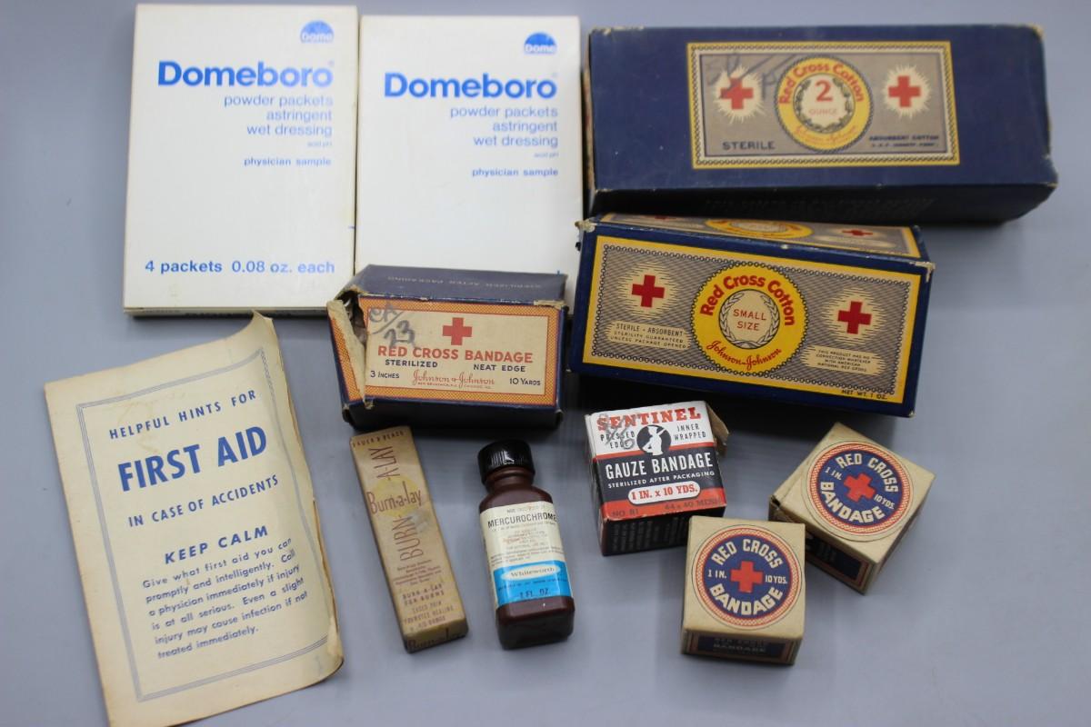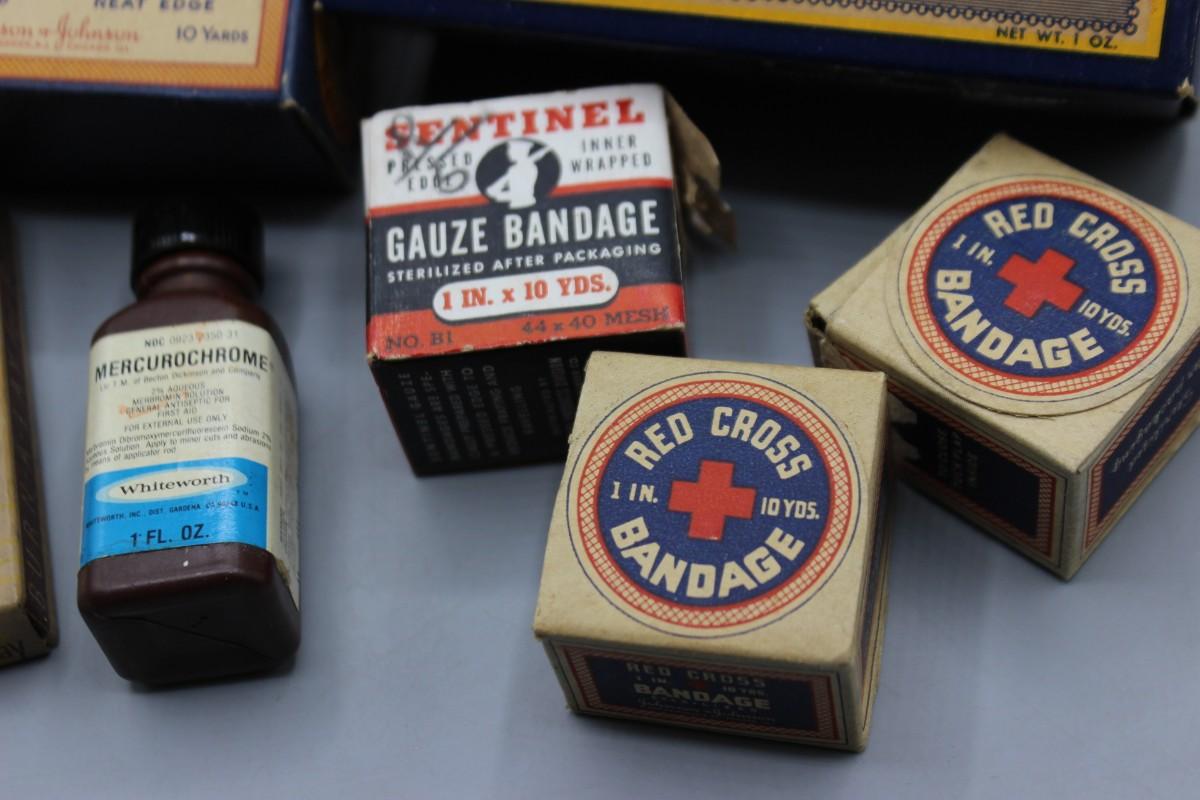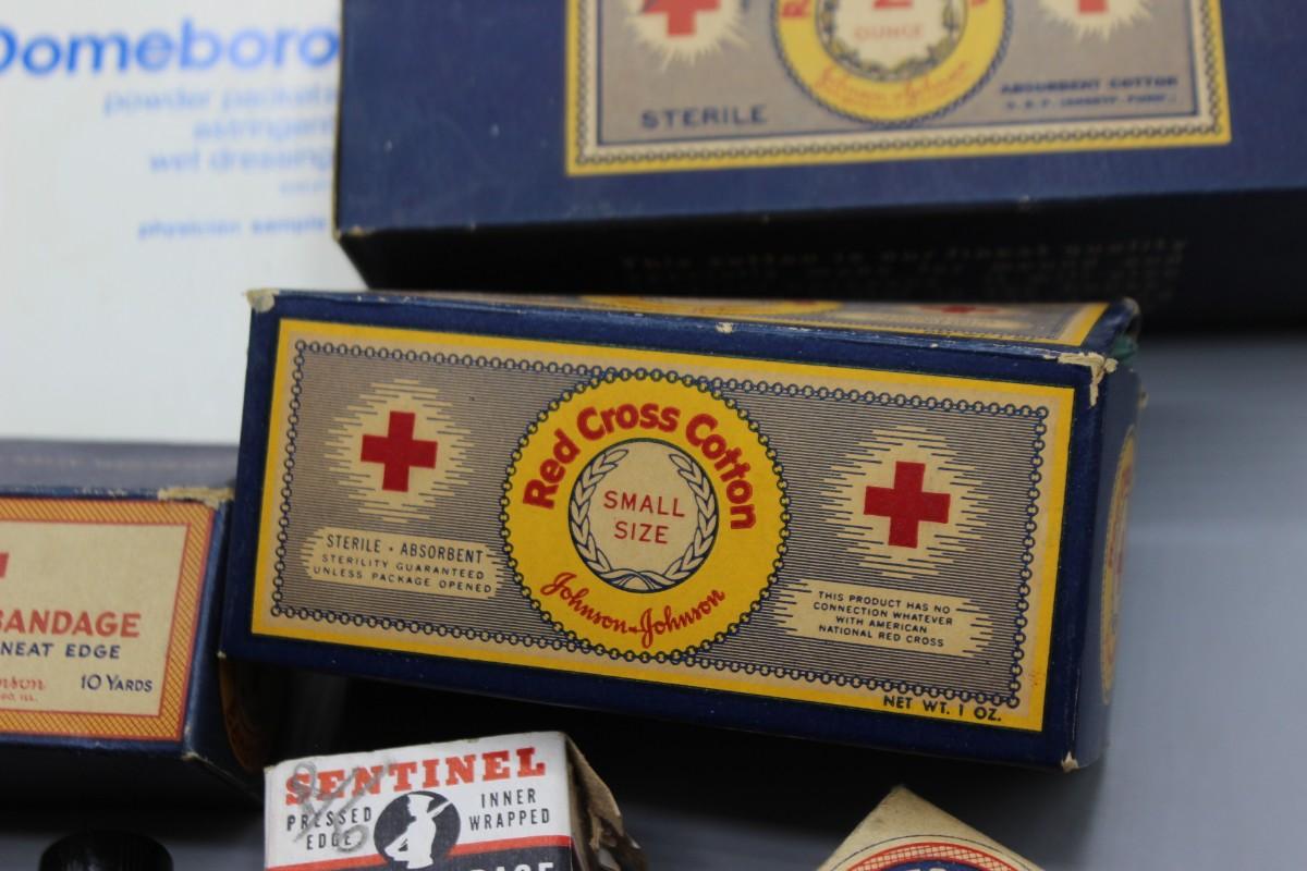 Lot of Vintage First Aid Supplies Red Cross Bandages, Gauzes, Sentinel & More