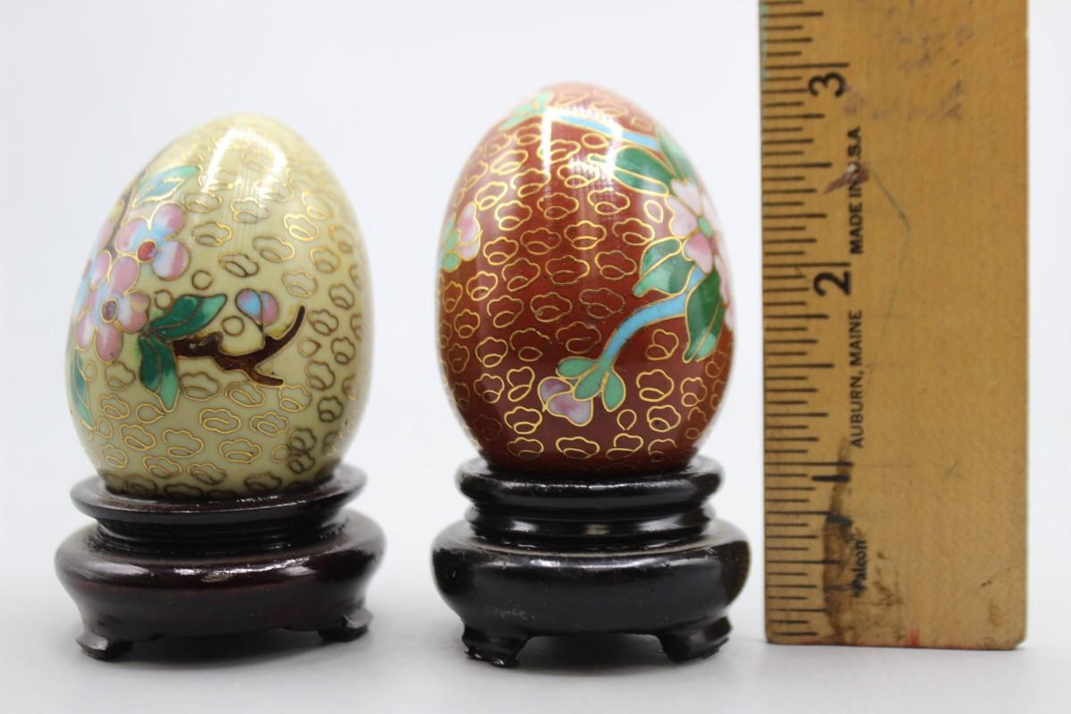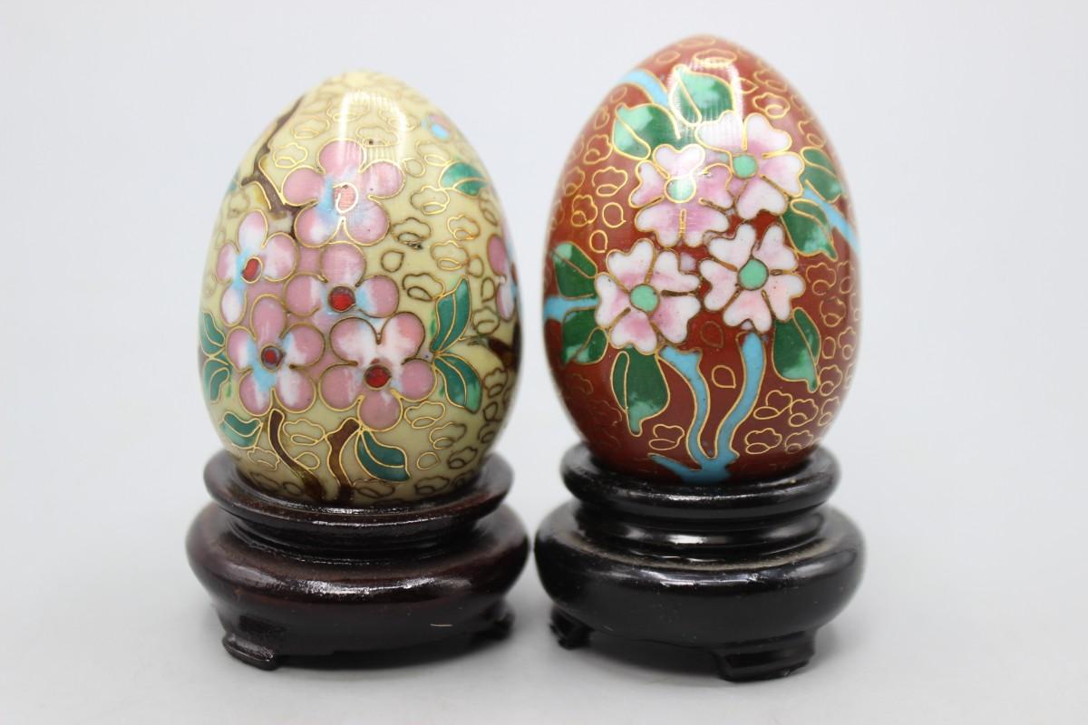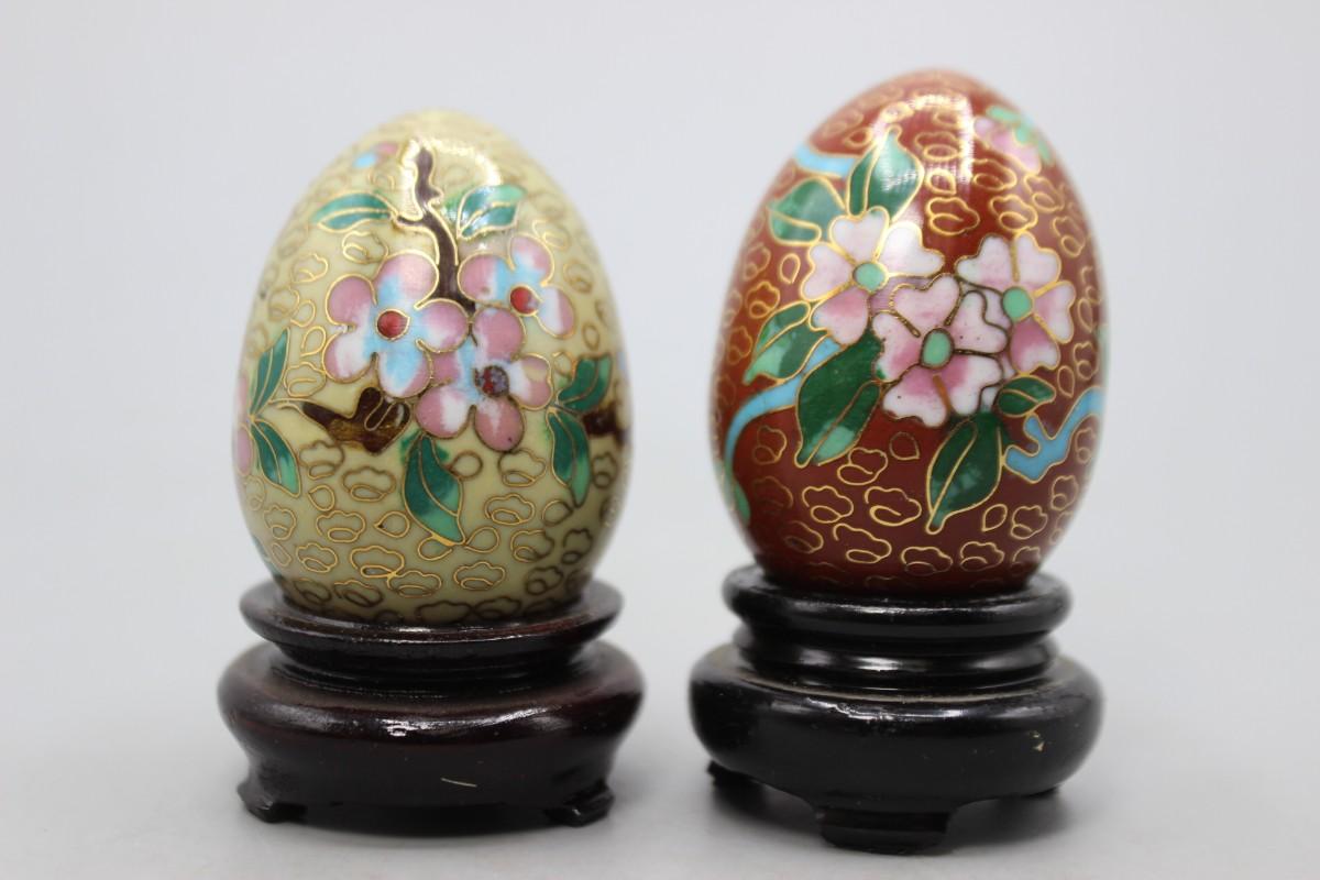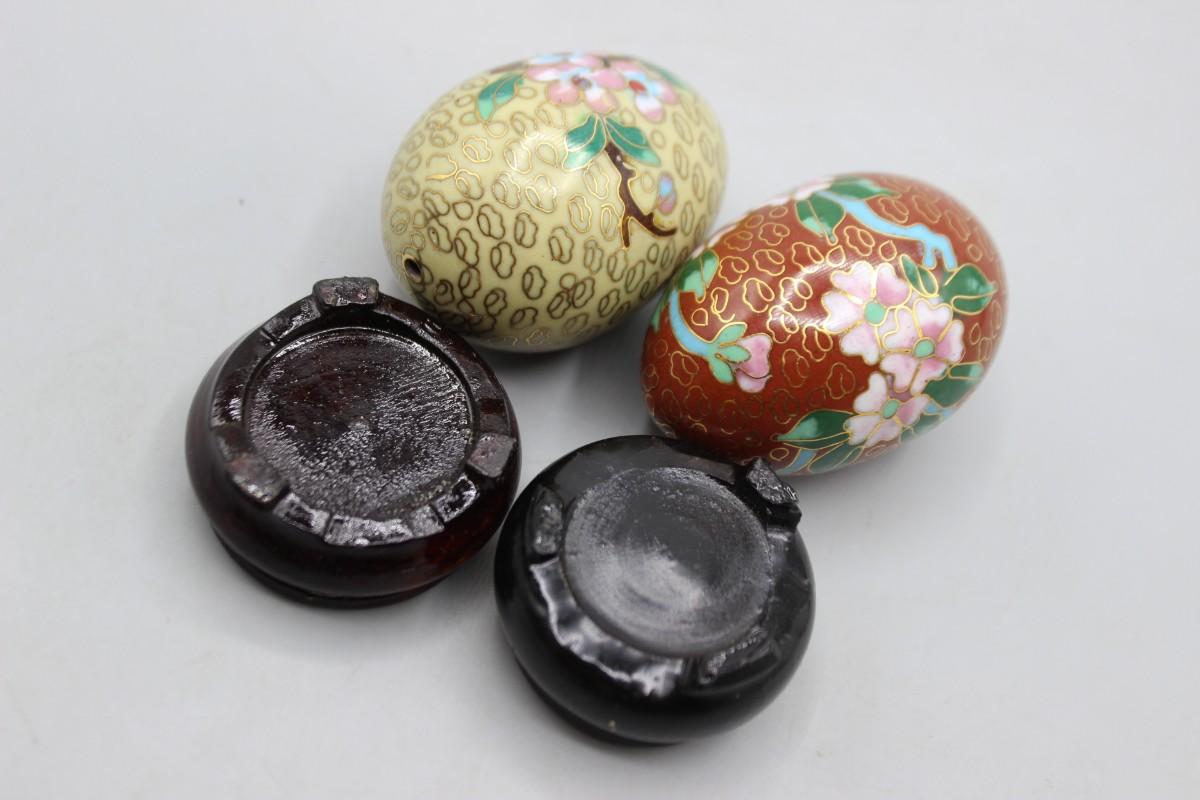 Vintage Cloisonne Enamelled Oriental Flower Eggs with Wood Pedestals