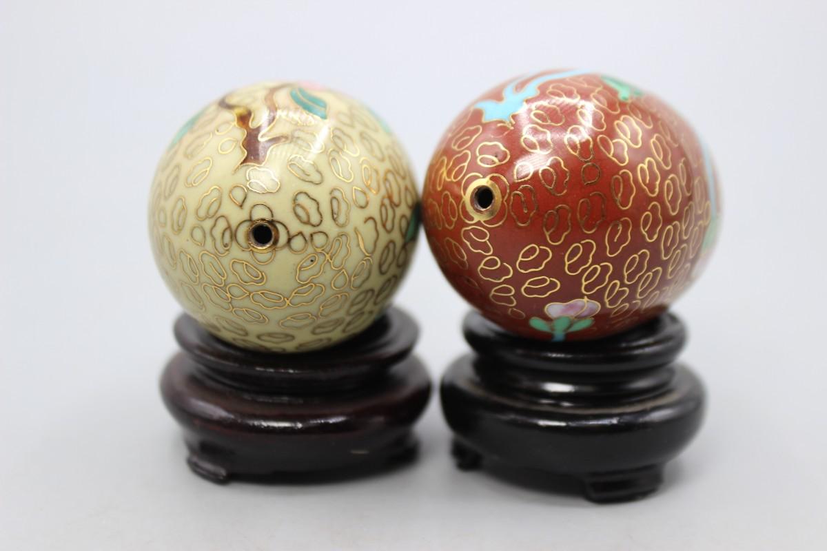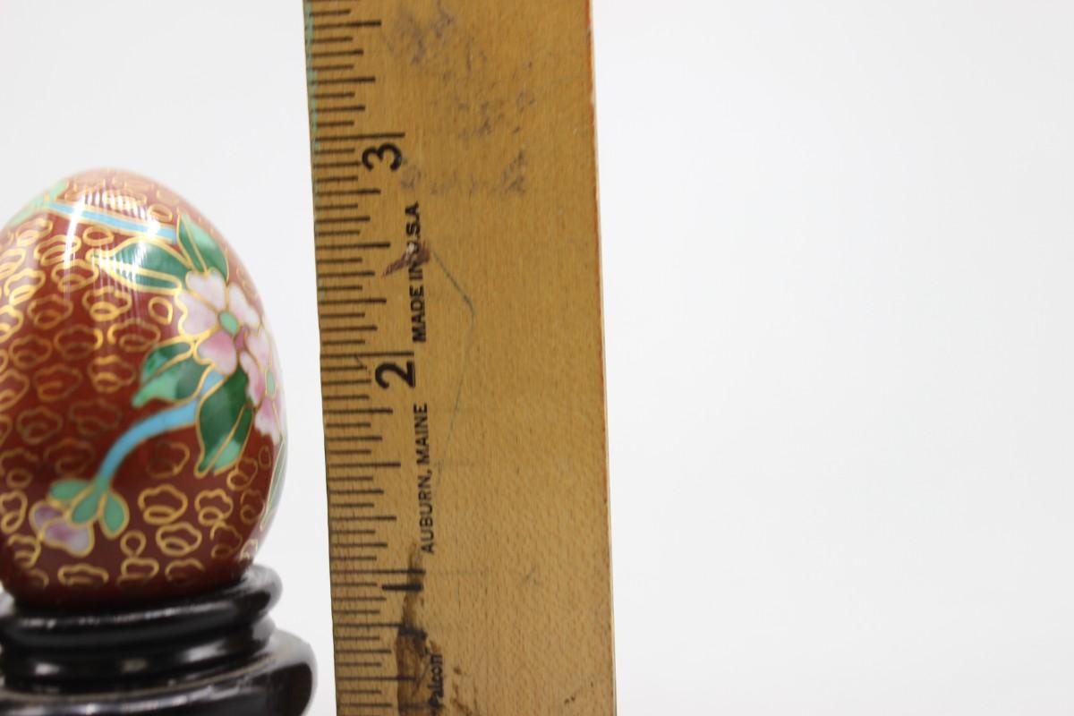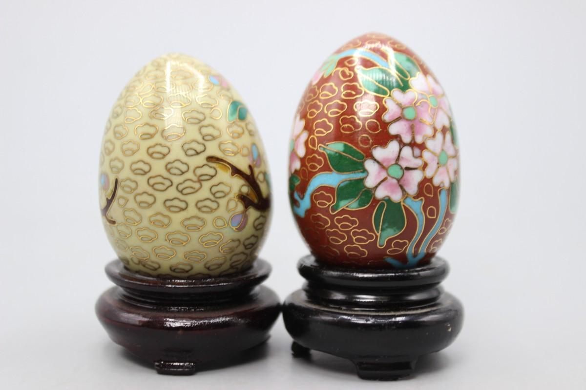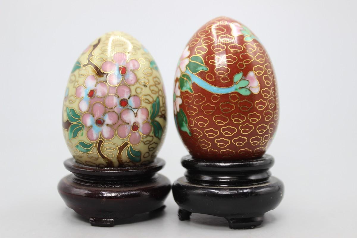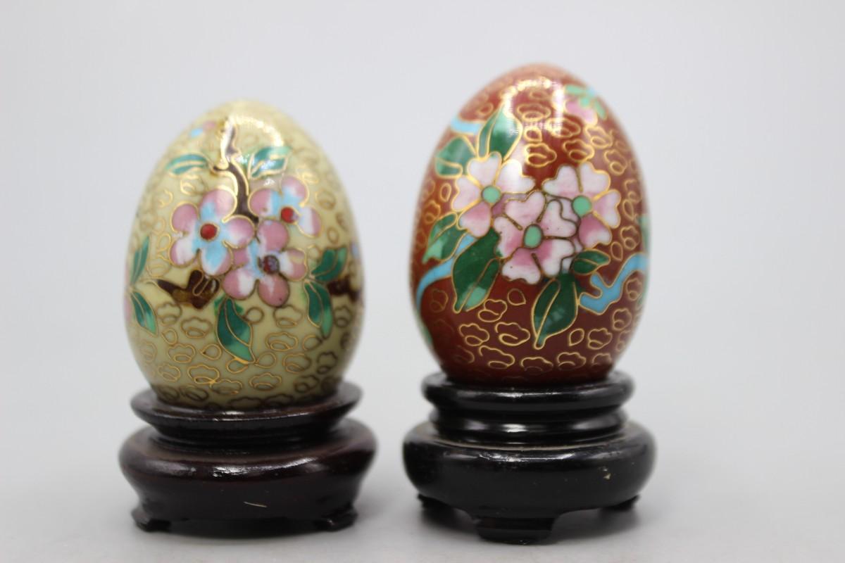 Vintage Cloisonne Enamelled Oriental Flower Eggs with Wood Pedestals