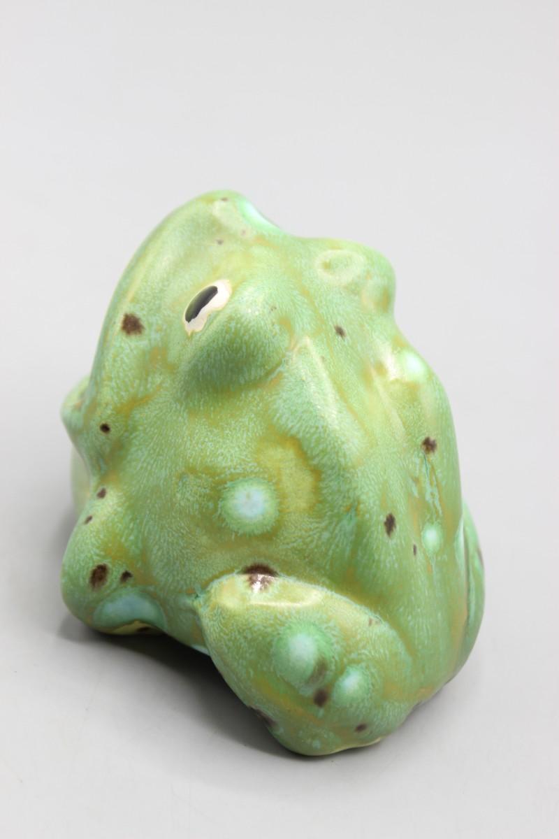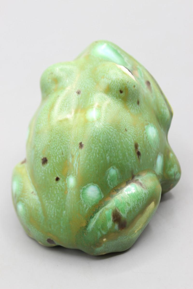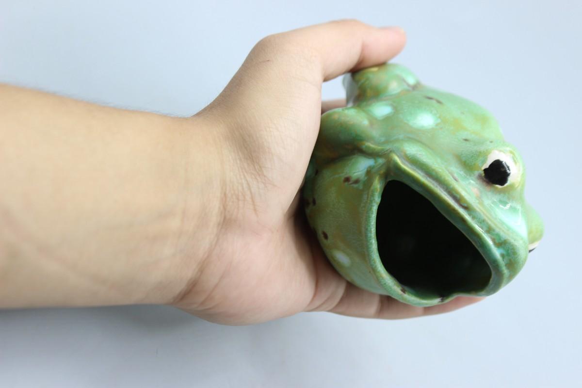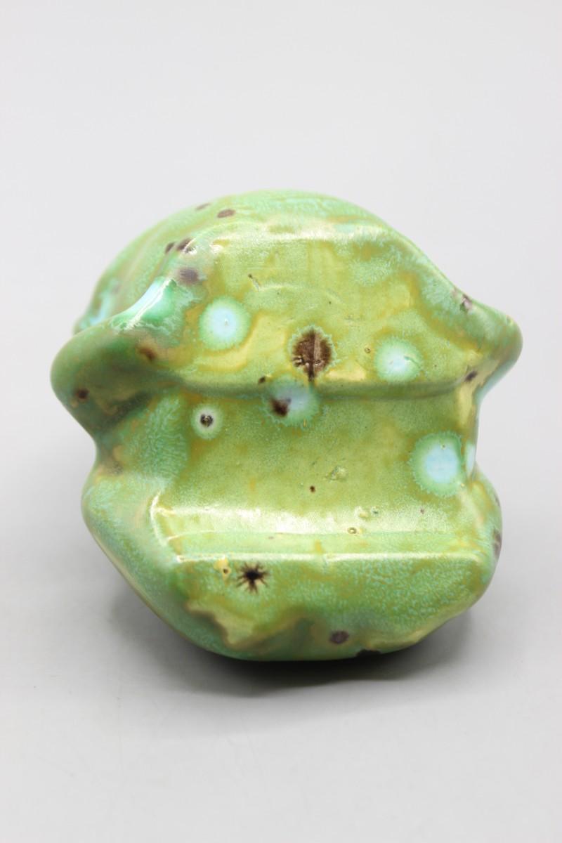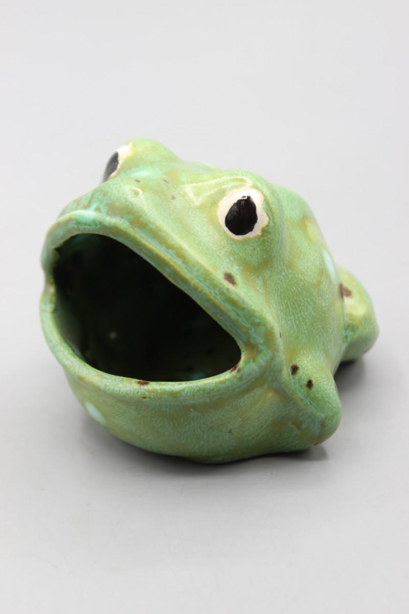 Vintage Splotchy Green Wide Open Mouth Frog Ring Trinket Holder. In good vintage condition. Under 4" size. May have crazing to the ceramic.