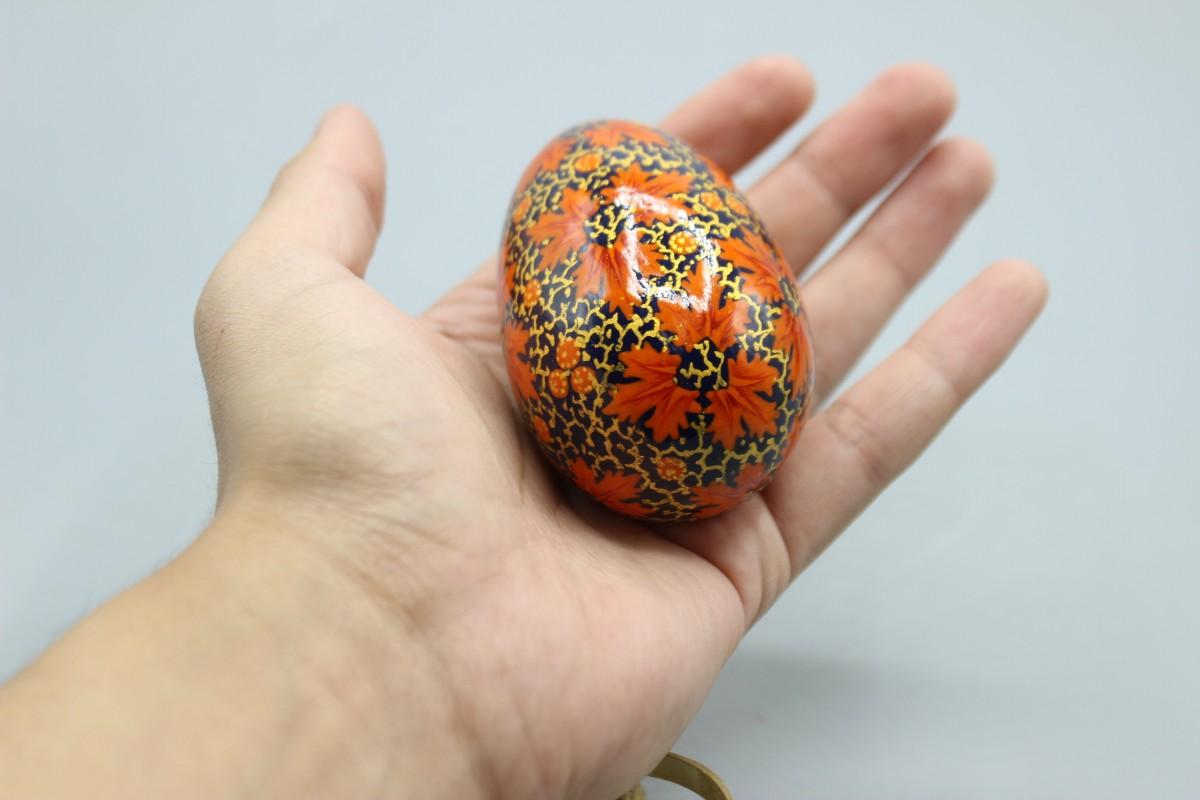 Colorfully Painted Wooden Egg with Stand Orange and Gold Leaf Like Pattern