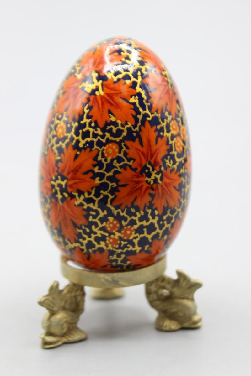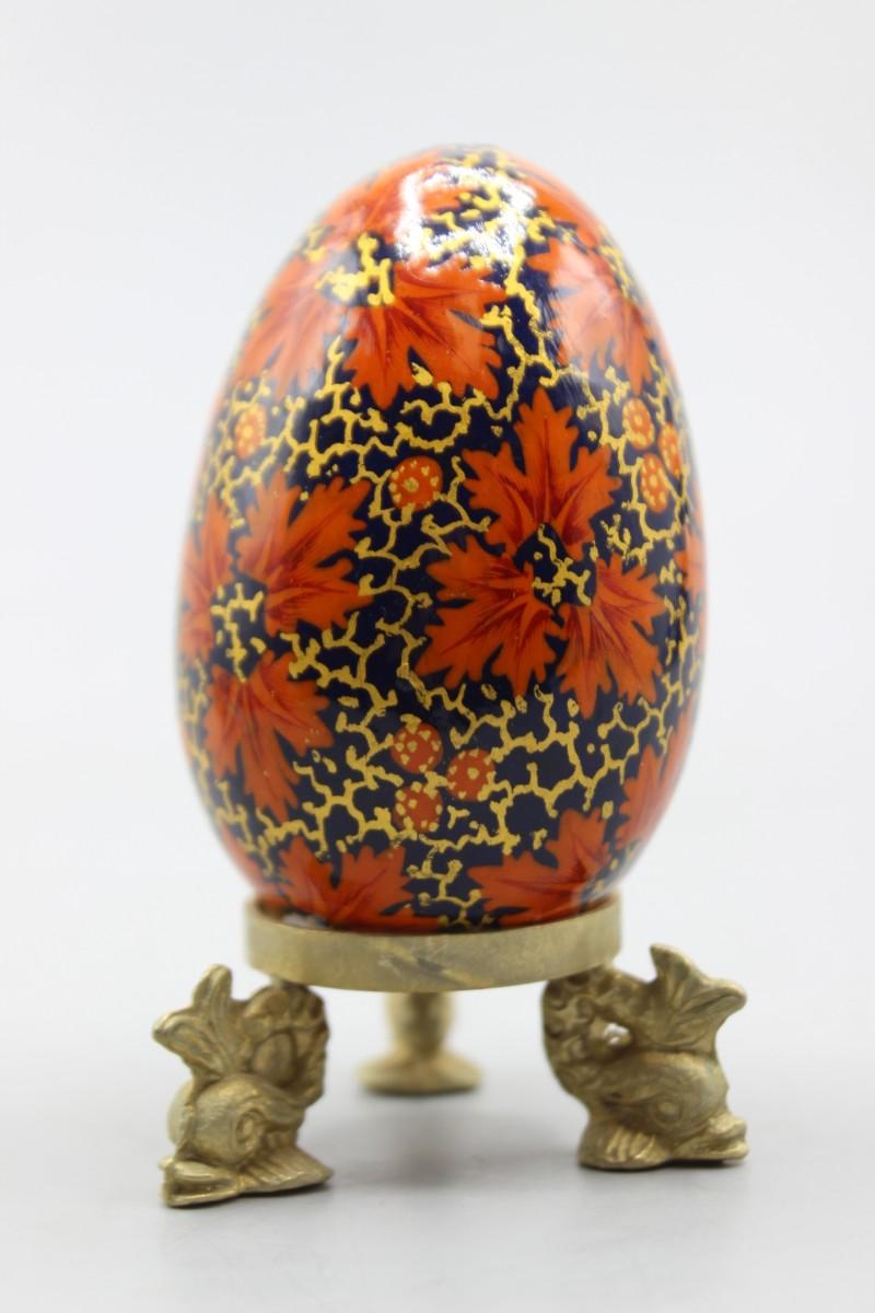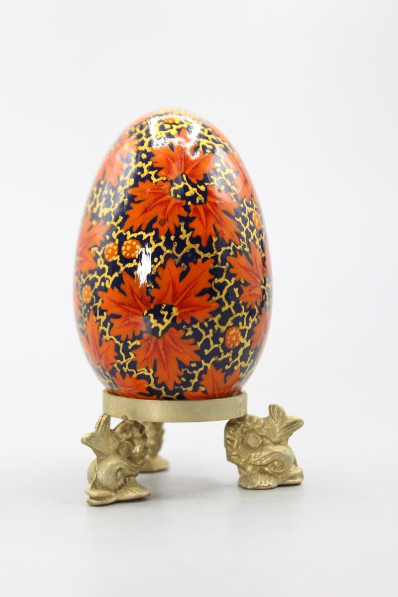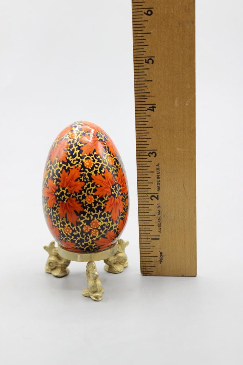 Colorfully Painted Wooden Egg with Stand Orange and Gold Leaf Like Pattern. Comes with gold tone stand. In good condition. Under 4" with stand.